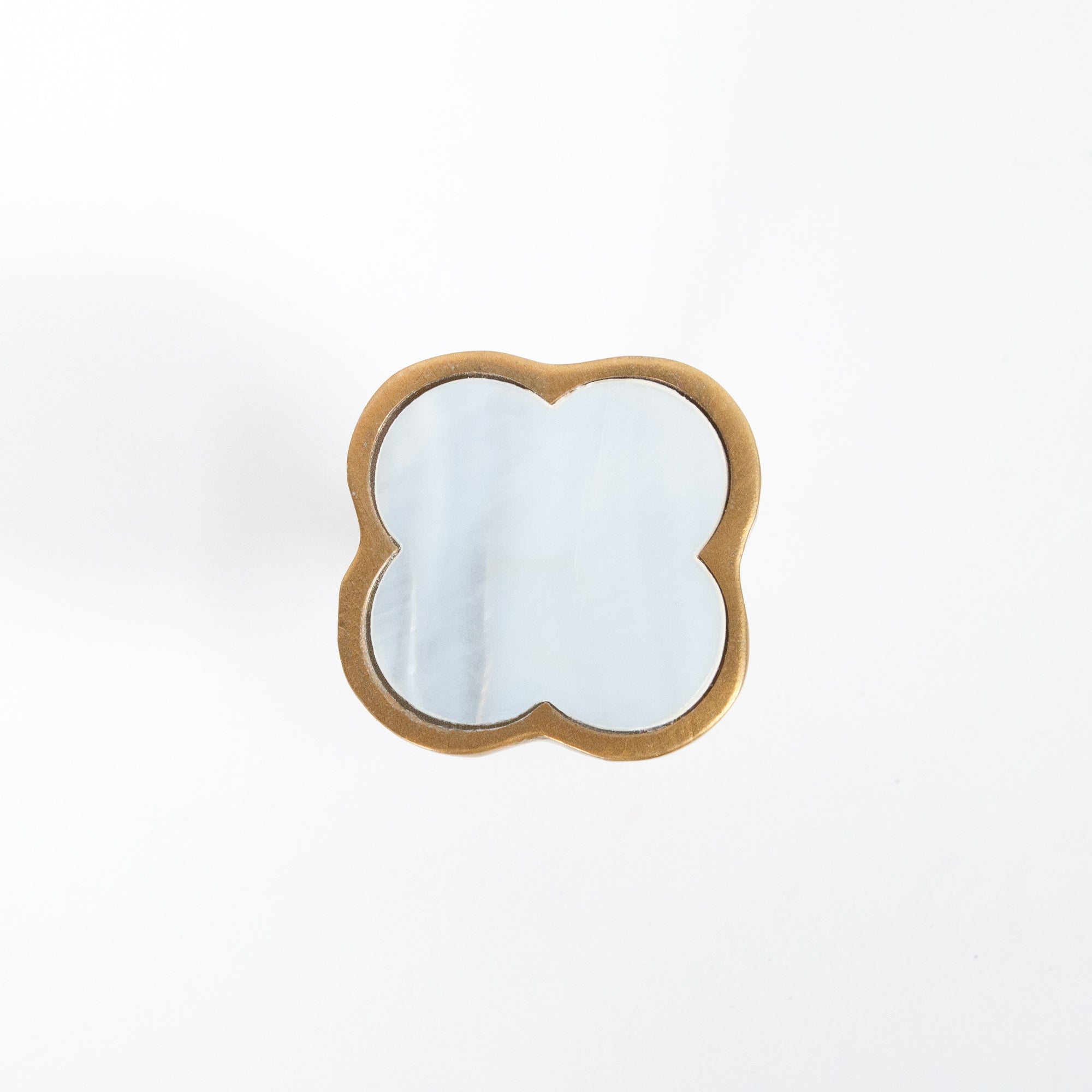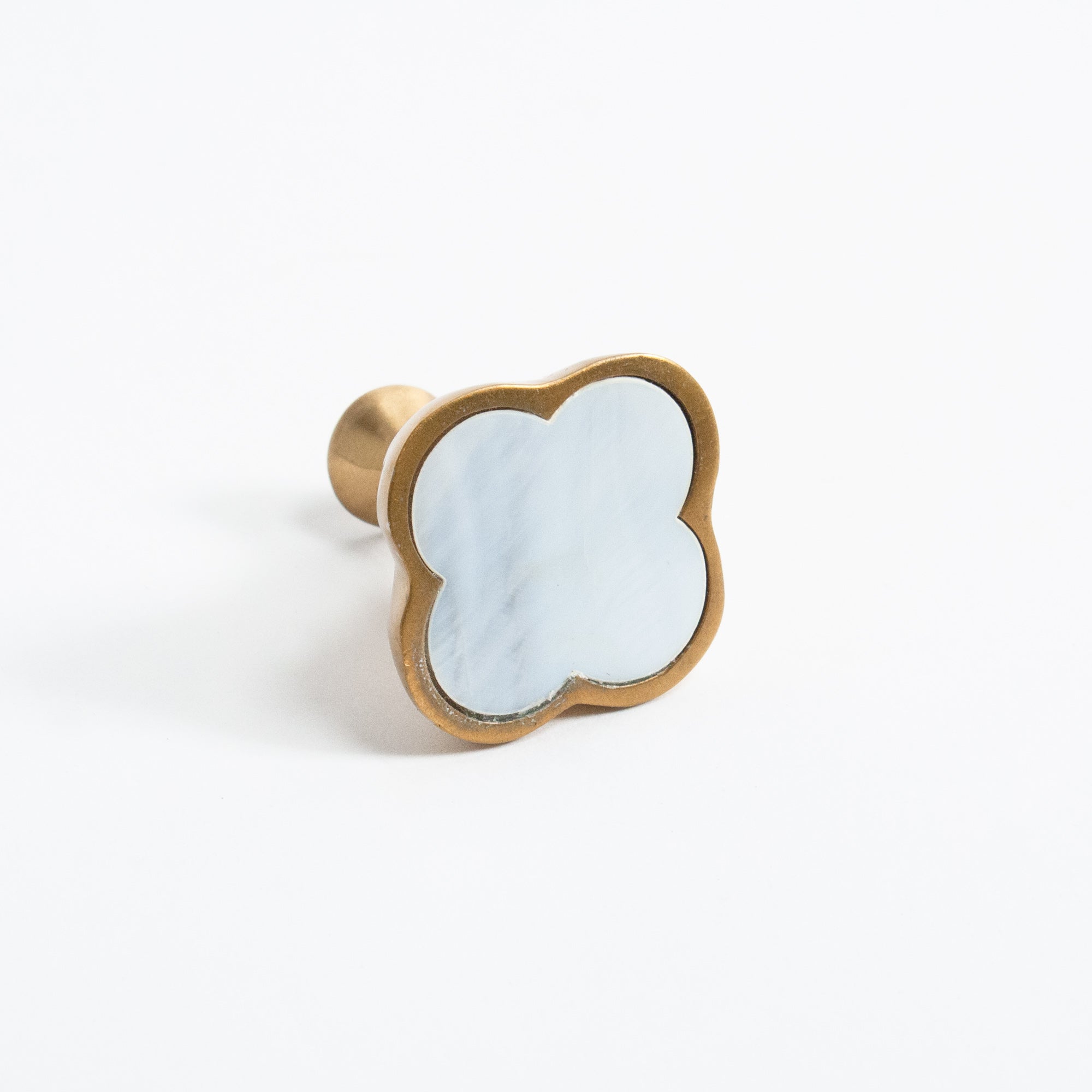 Contemporary & chic pull made in the shape of a clover. Finished in brass and filled with marble.