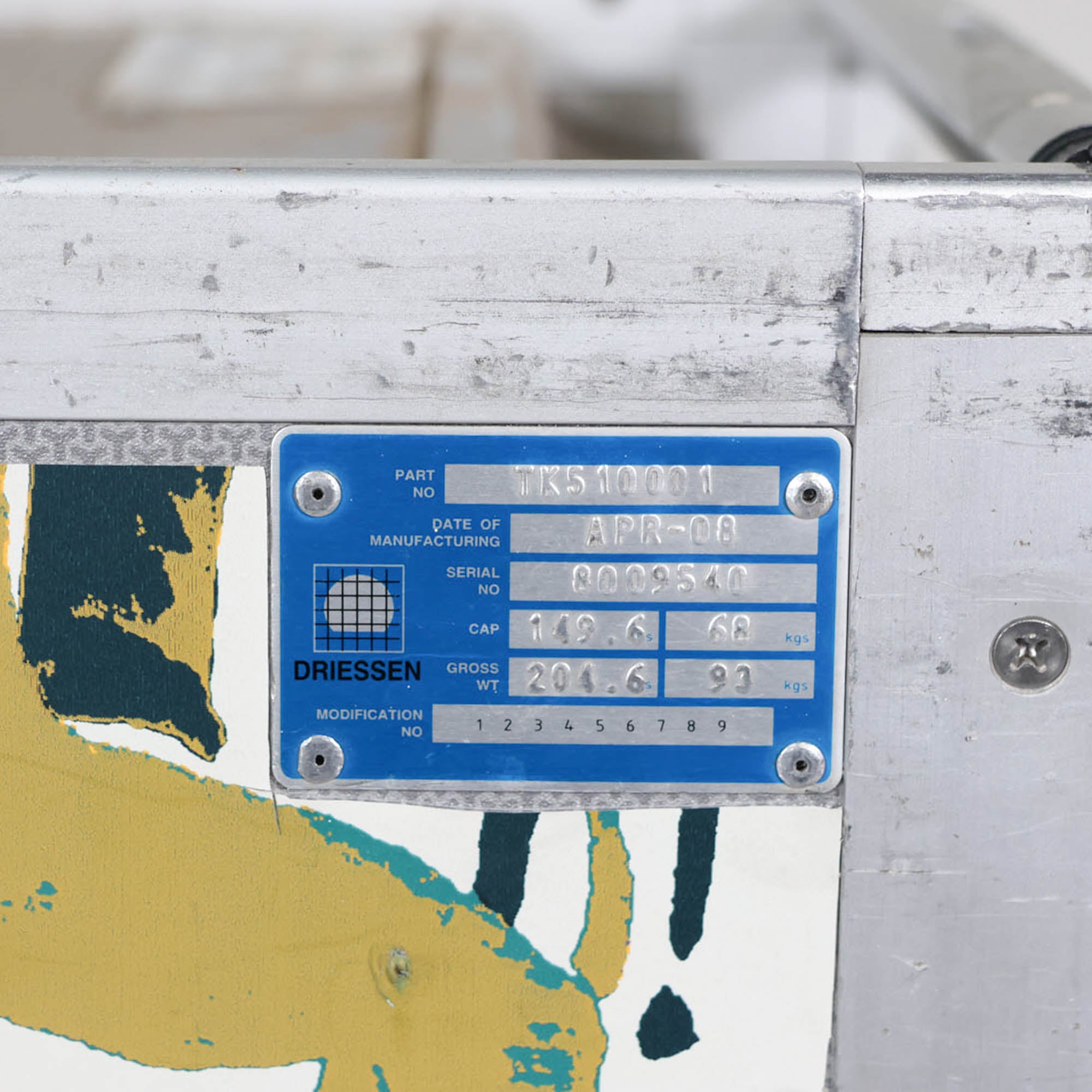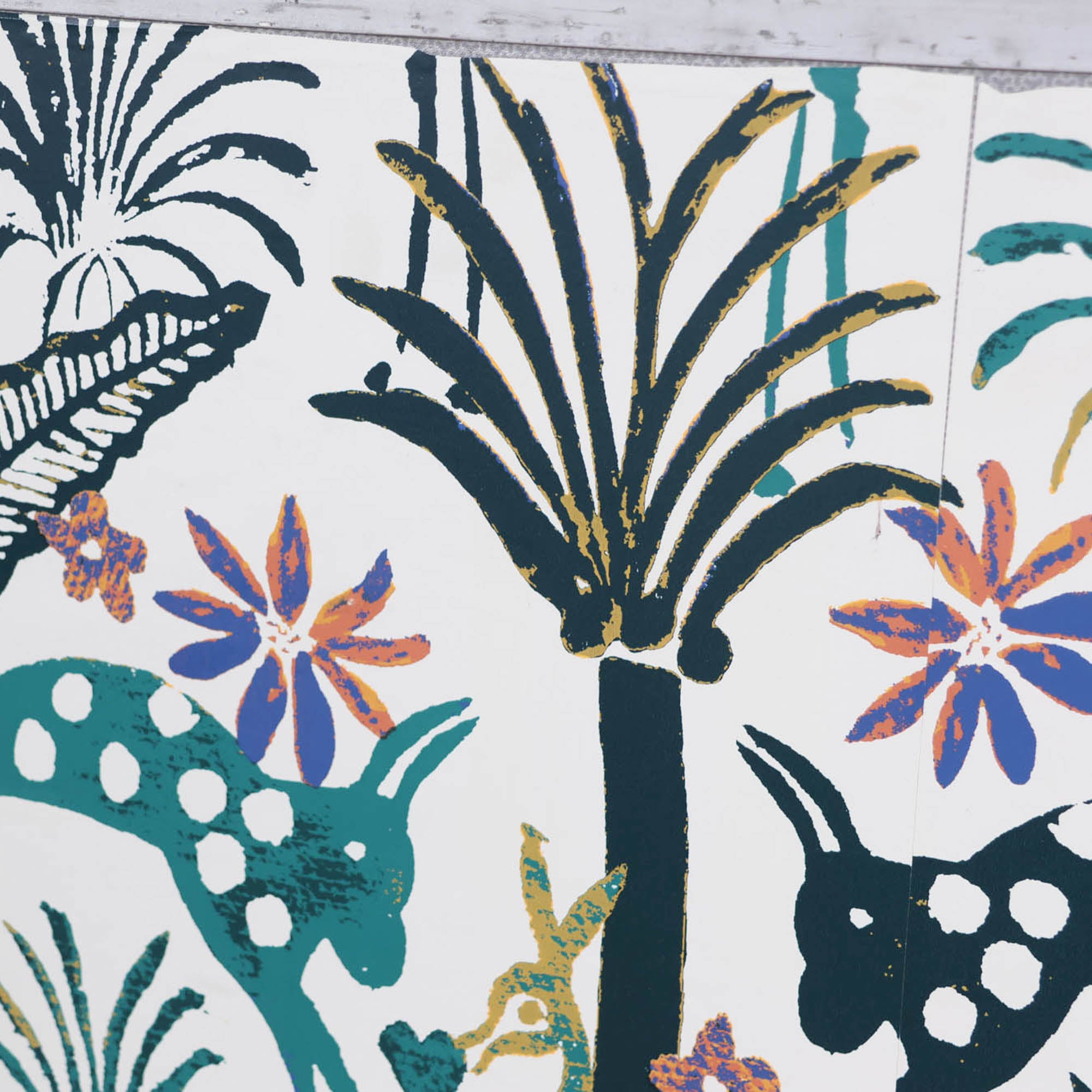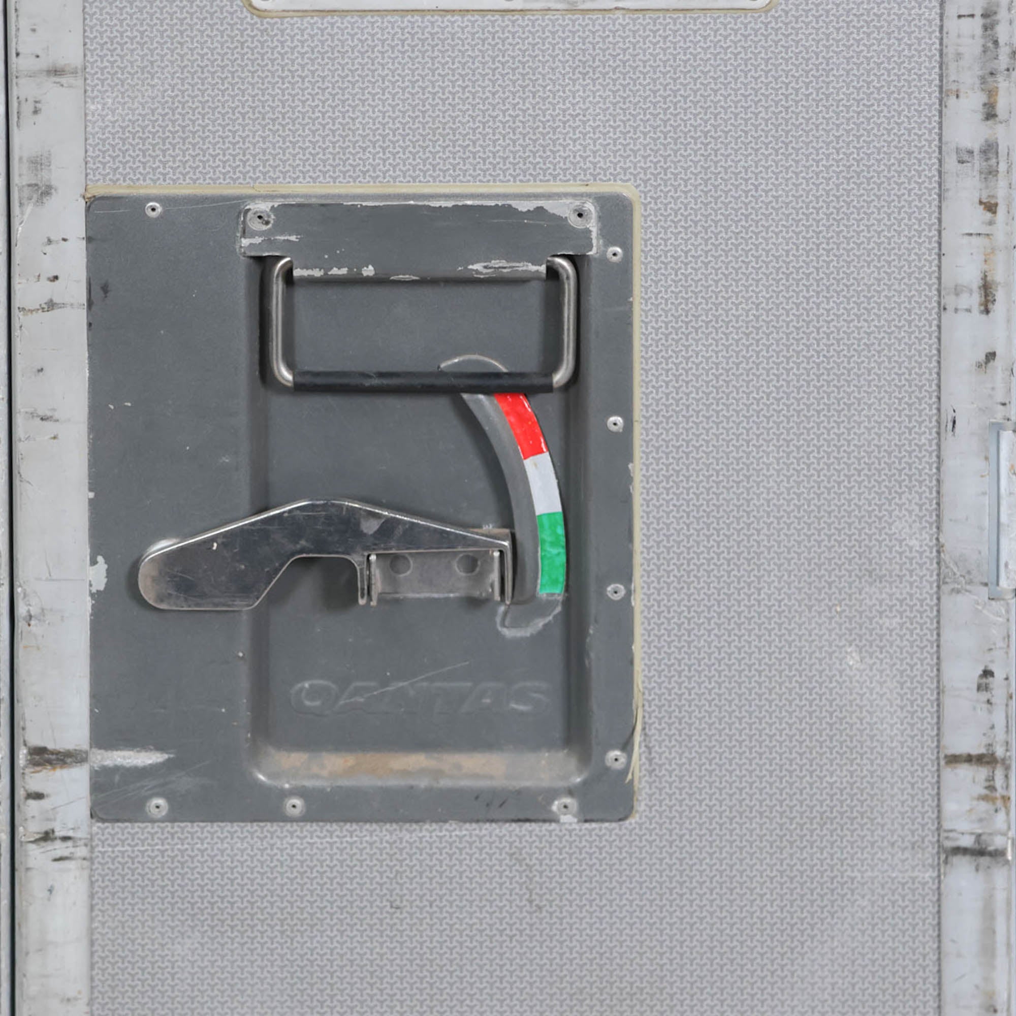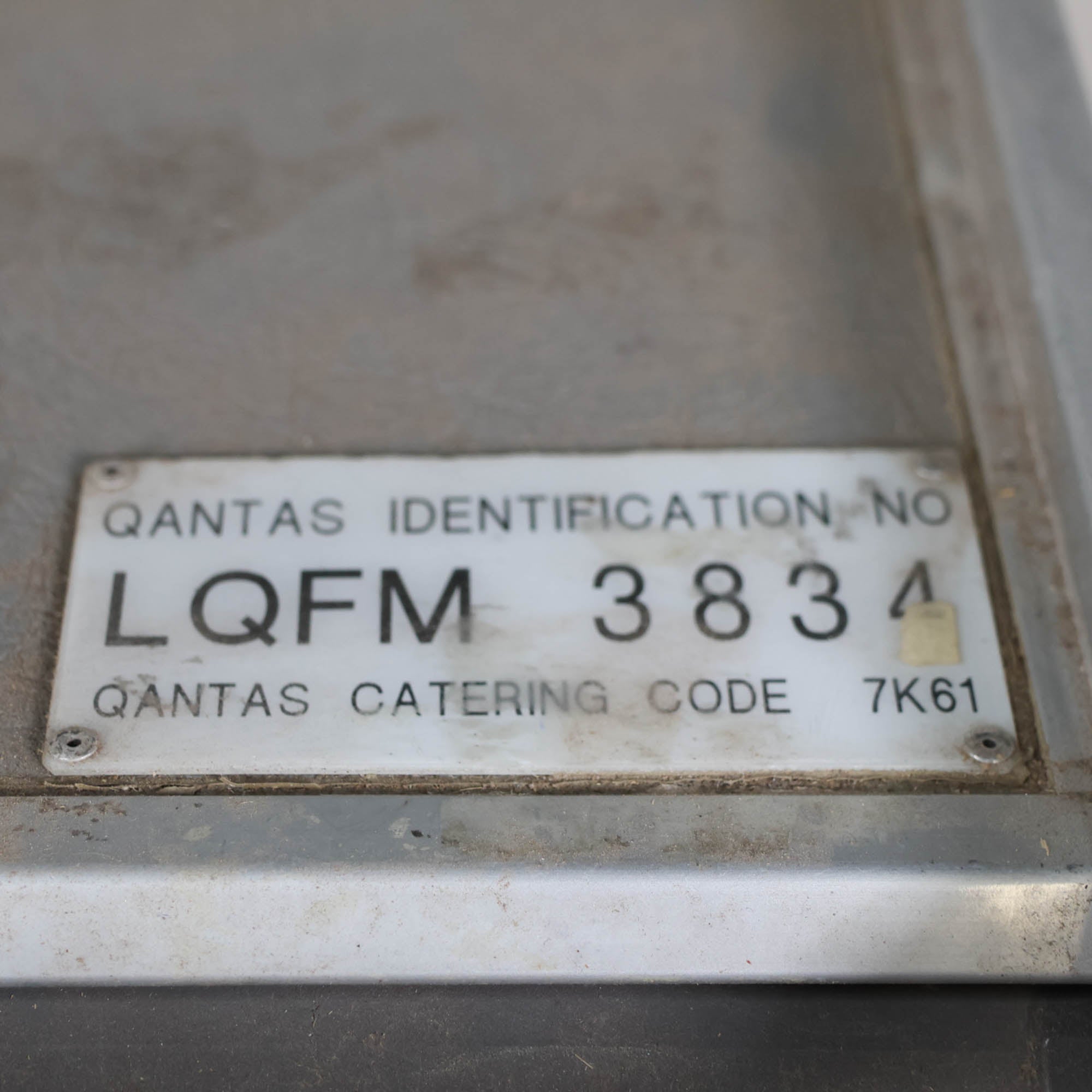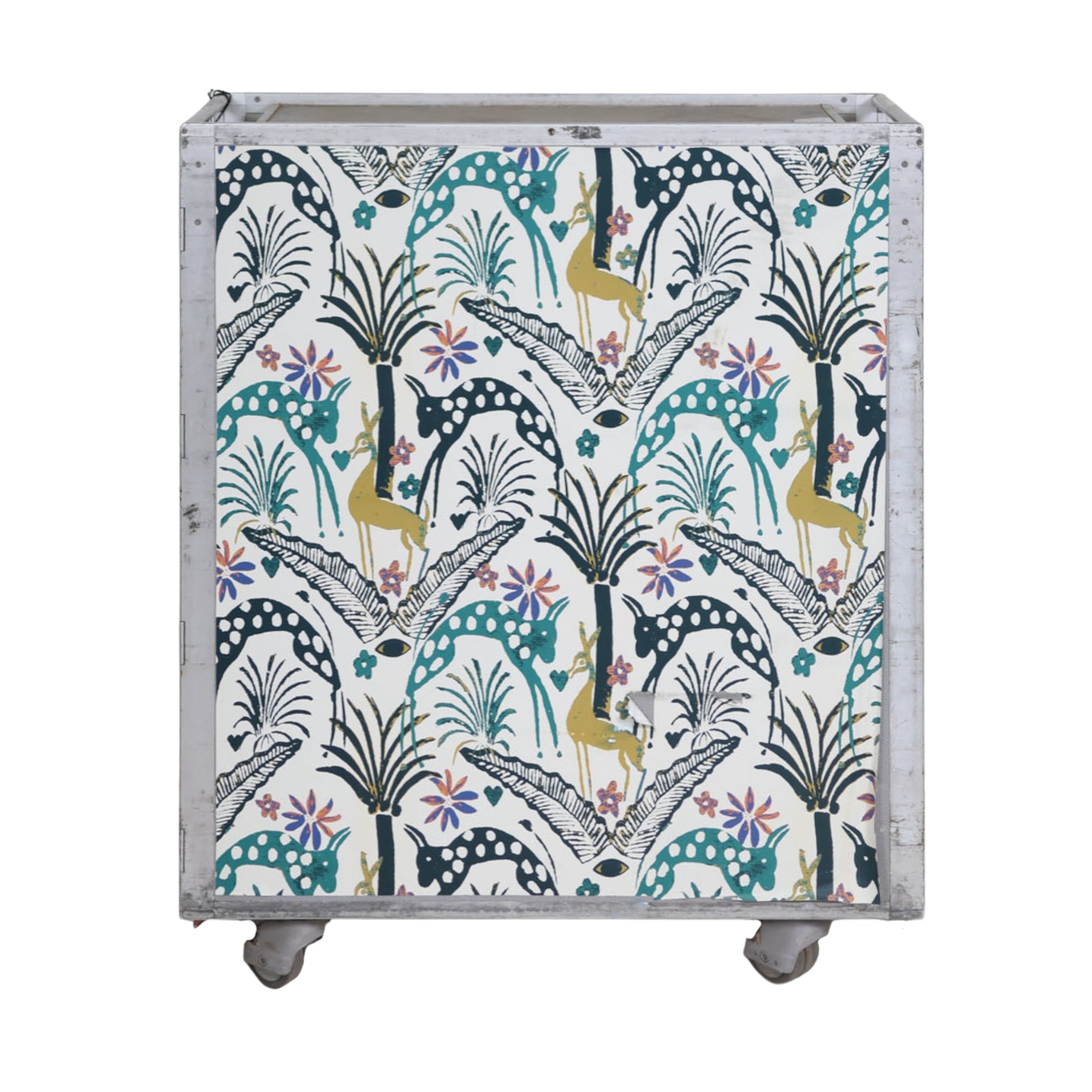 A genuine Qantas airline service cart, wrapped in a playful floral-fauna print wallpaper. Industrial history meets boutique charm—perfect as a bar cart, side table, or rolling storage.