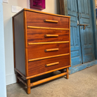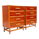 This exceptional 1950s pair of tallboys features rich mahogany drawer fronts framed in smooth bamboo and rattan for a look that’s both organic and elevated.