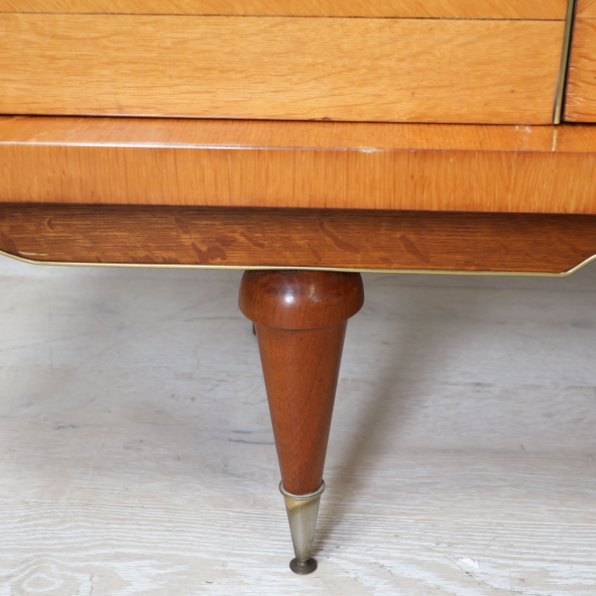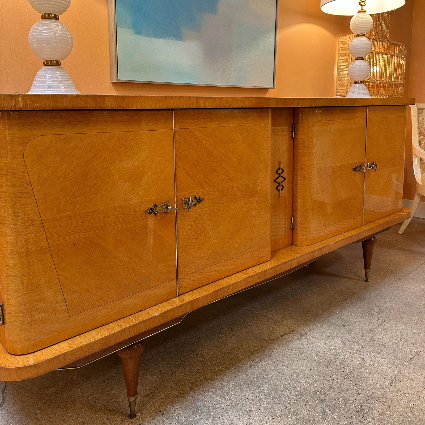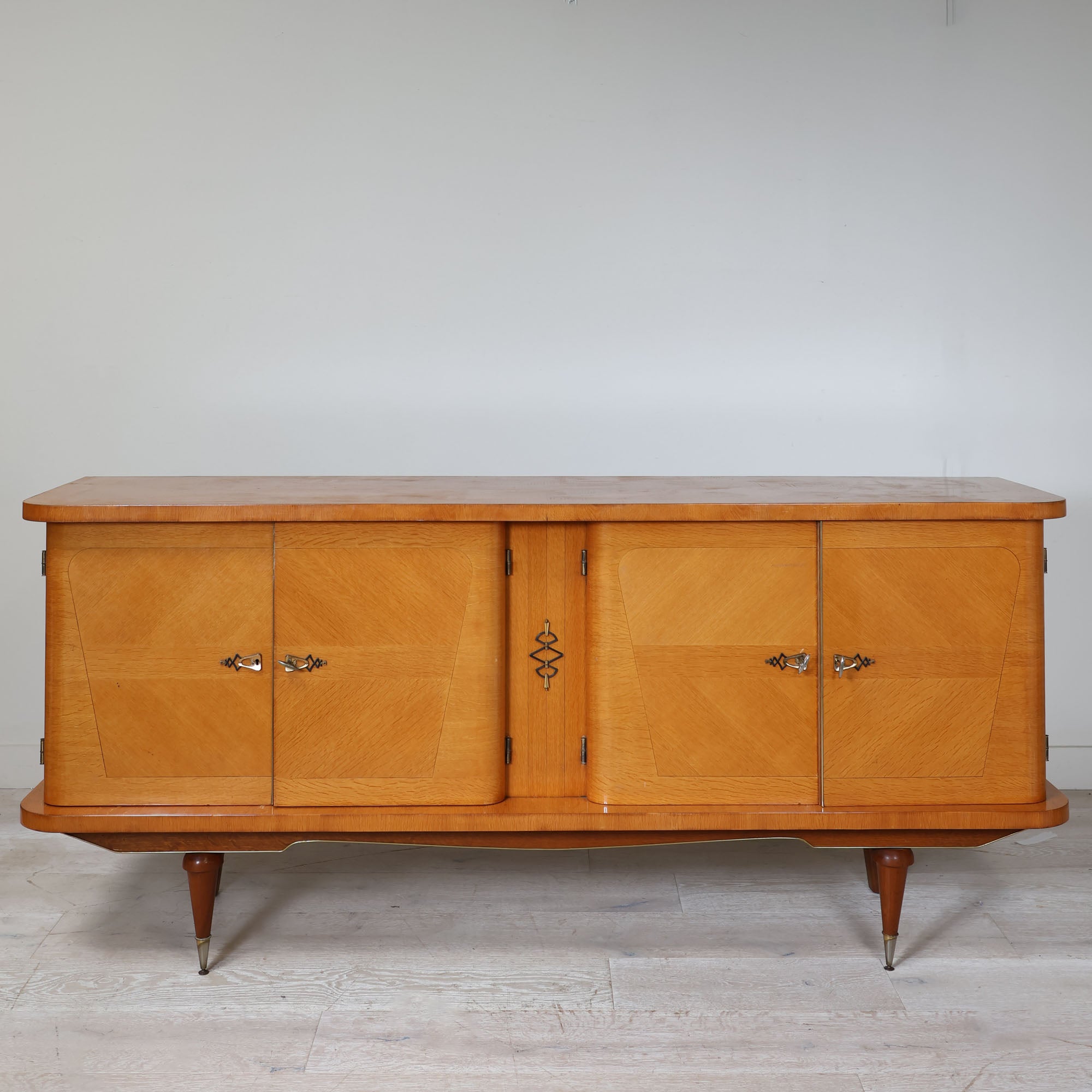 This vintage French sideboard is all warmth and geometry. Its glowing veneer and angular paneling bring subtle drama, while sculptural black-and-brass hardware adds that unmistakable mid-century flair.