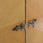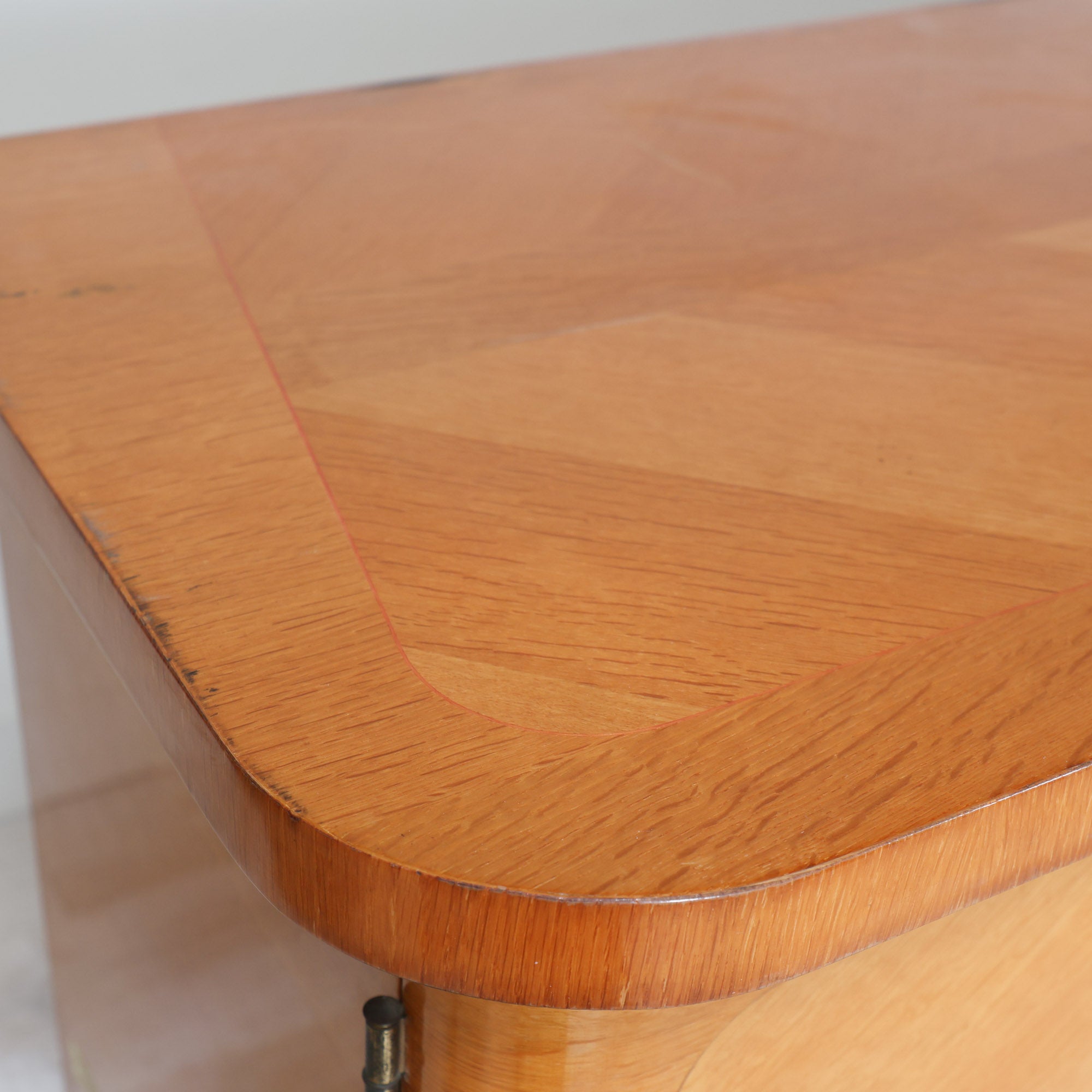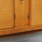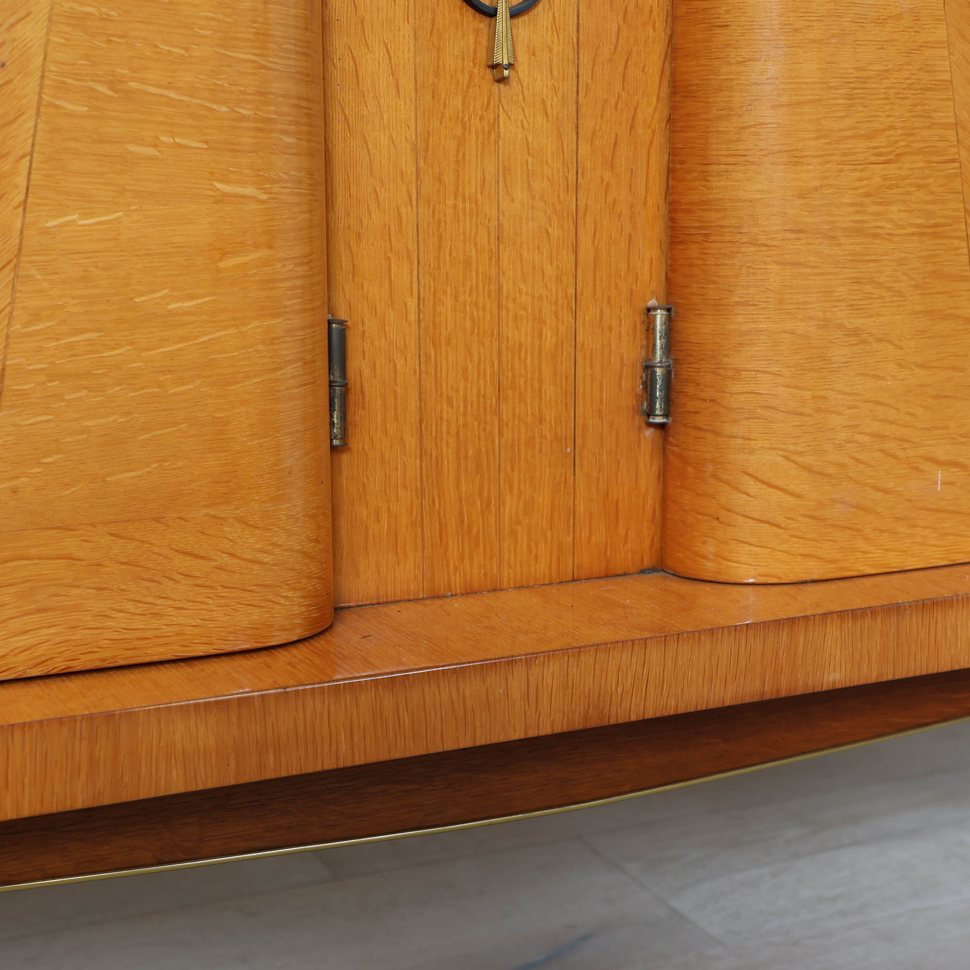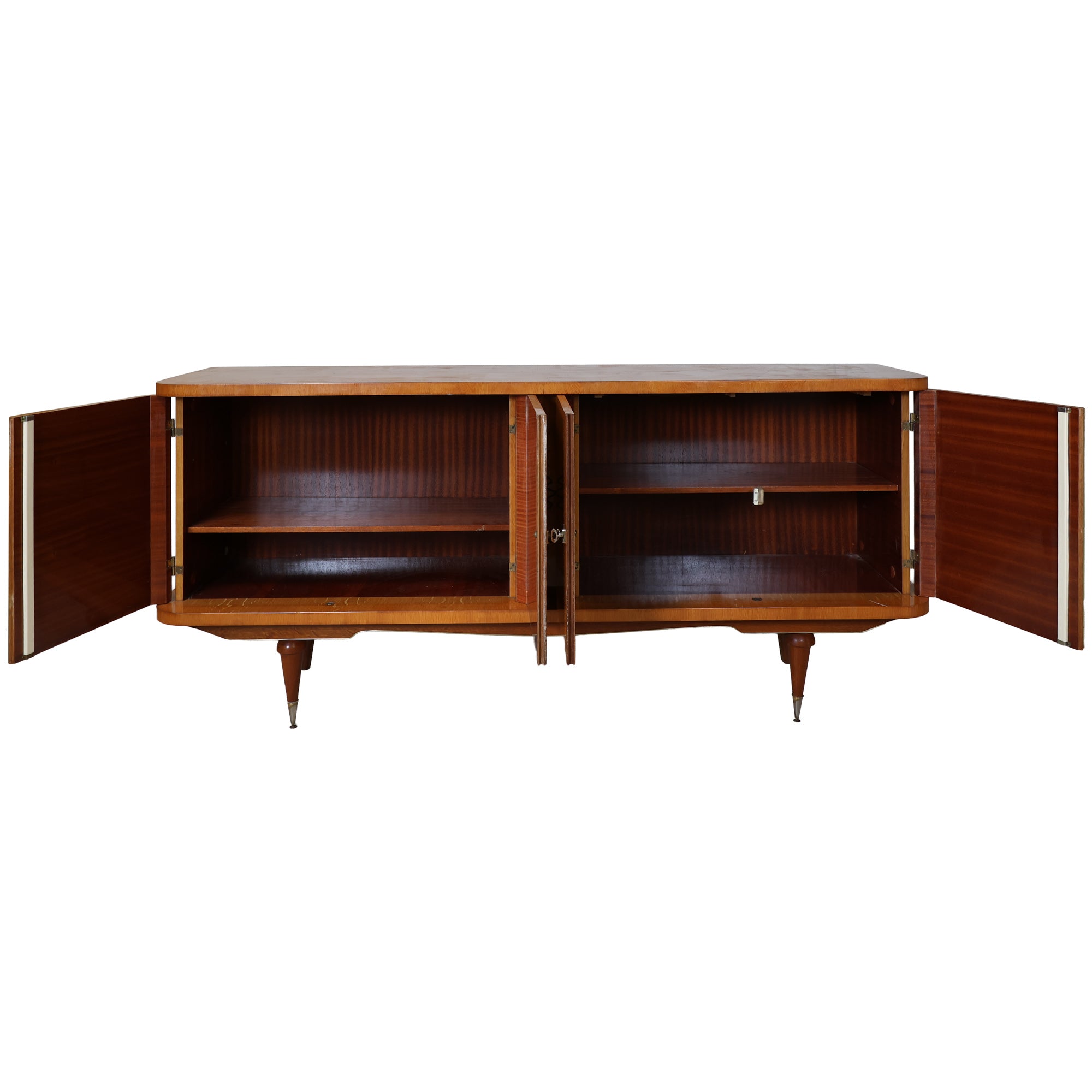 This vintage French sideboard is all warmth and geometry. Its glowing veneer and angular paneling bring subtle drama, while sculptural black-and-brass hardware adds that unmistakable mid-century flair.