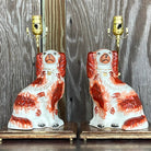 Illuminate your space with this precious pair of vintage Regency Staffordshire dog table lamps. Melding classic Regency style with American charm, these lamps showcase iconic Staffordshire dog designs, adding a timeless and playful touch to your décor.