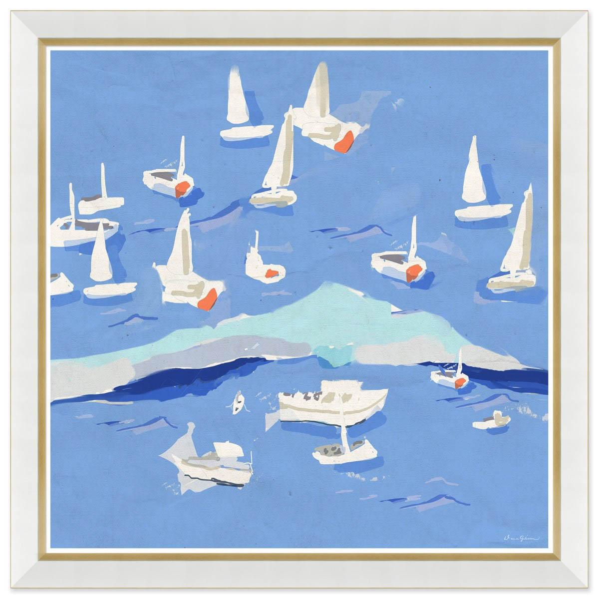 Giclée print of a coastal still life painting by Dana Gibson. 'Island Hopping I' is printed on archival paper and framed in a silver painted wood frame.