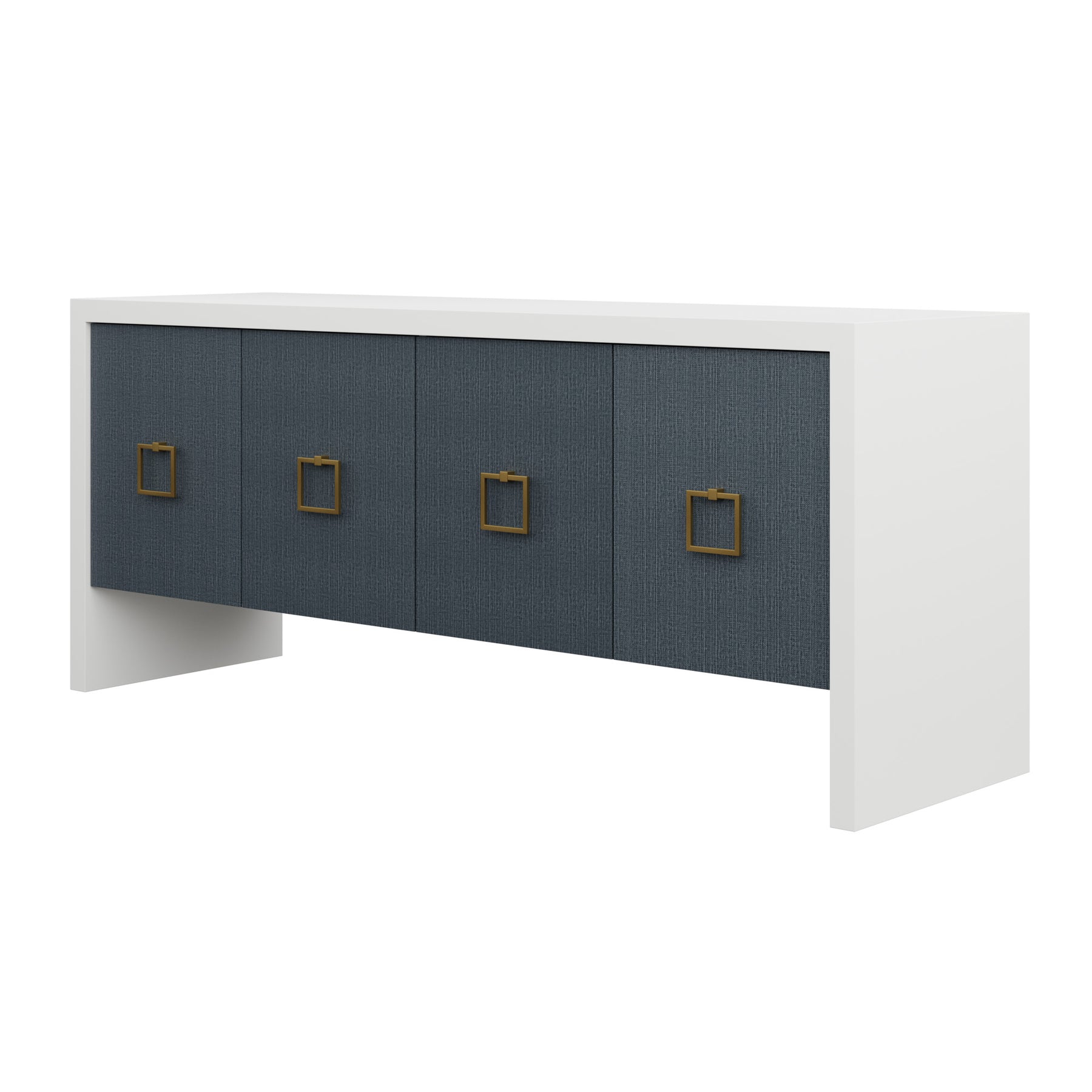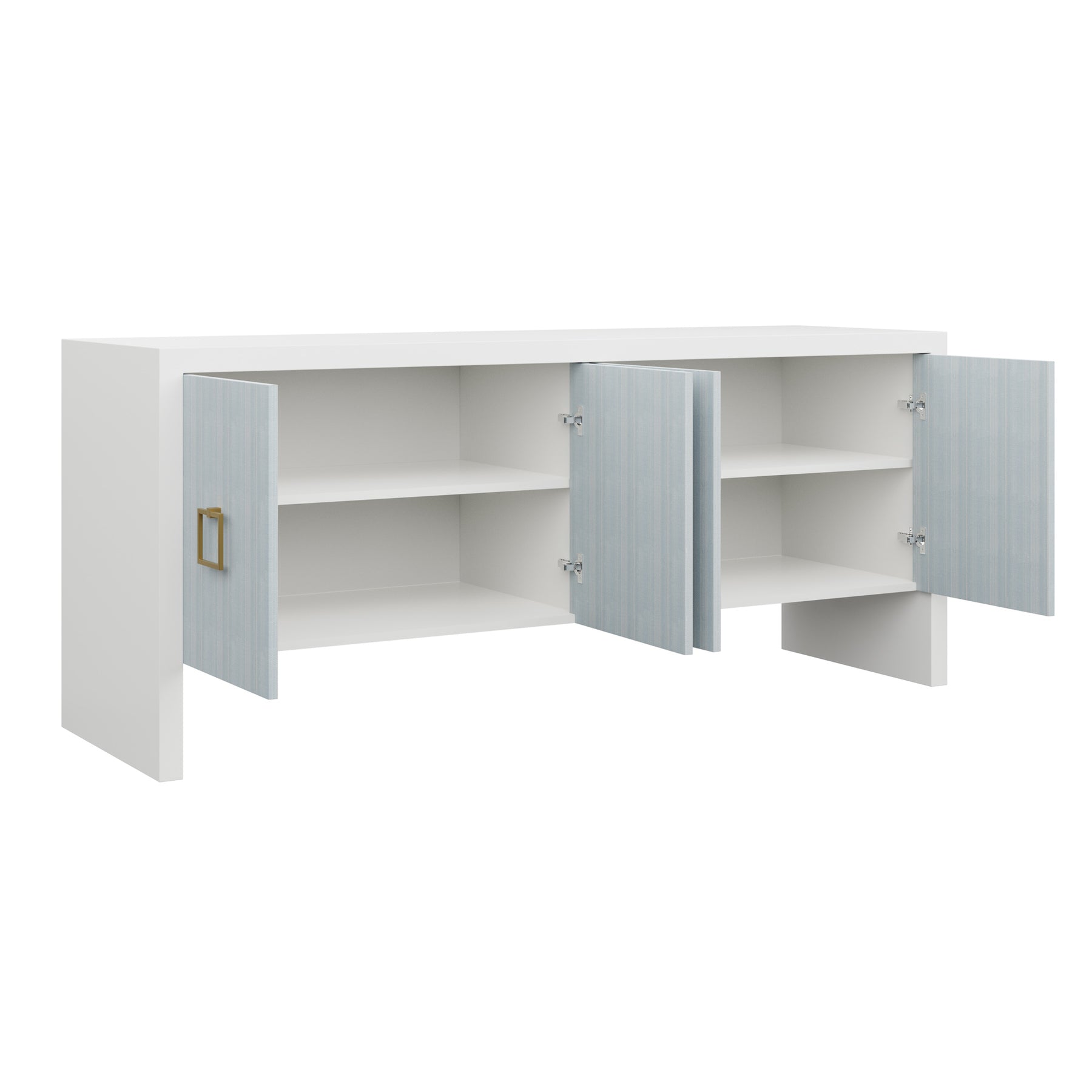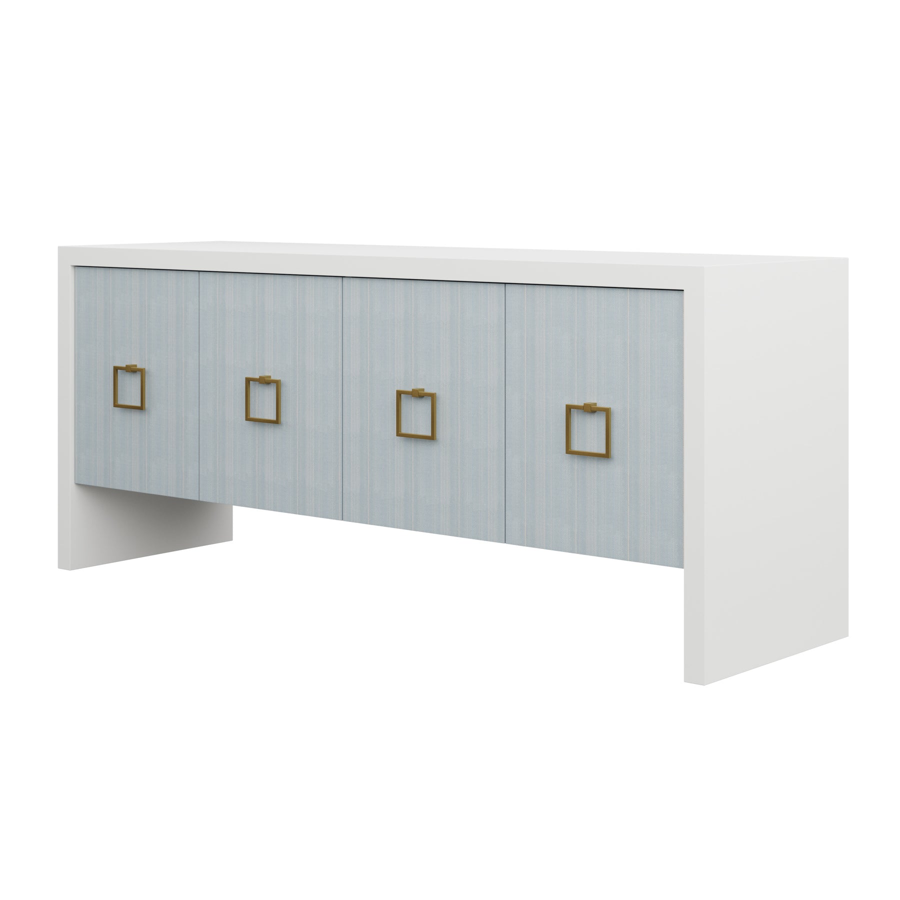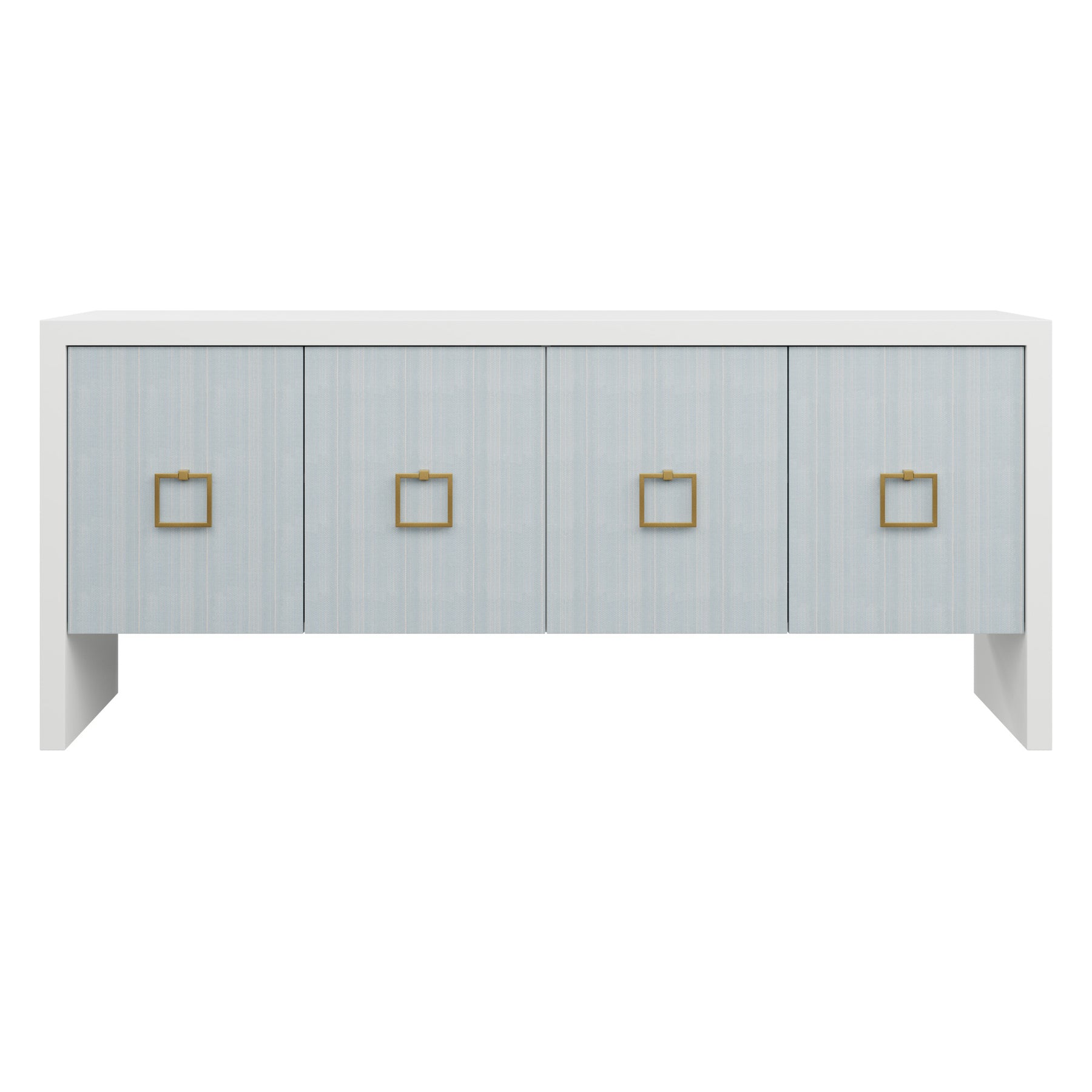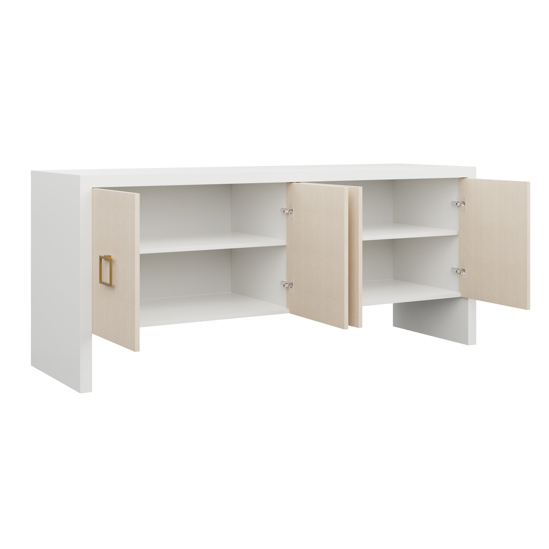 Our bespoke Deloache Credenza features a simple waterfall frame that allows hardware to shine. Two cabinets house one adjustable shelf each for storage.