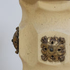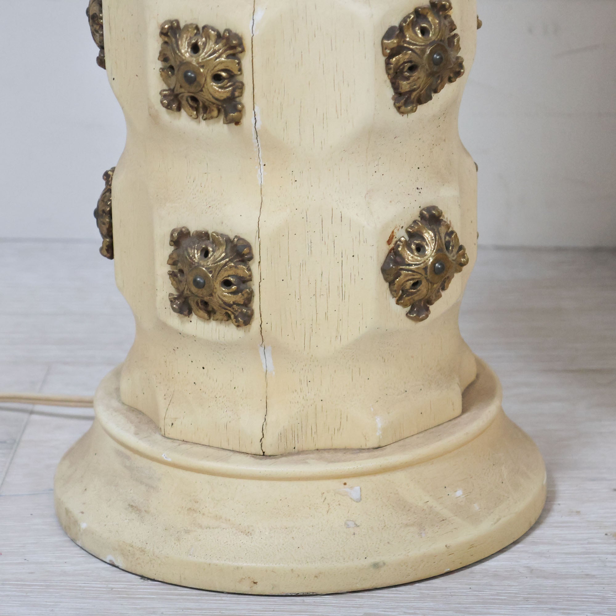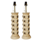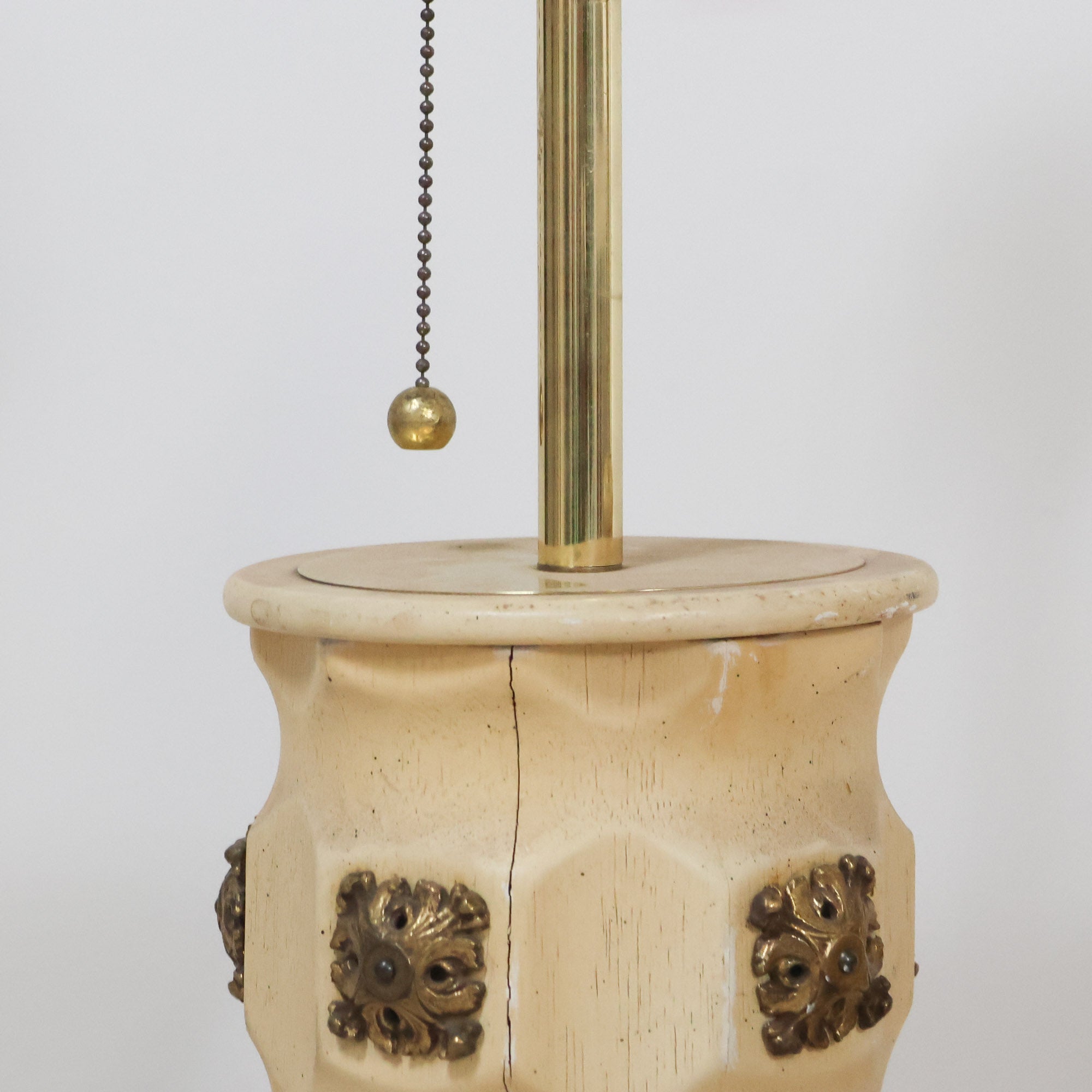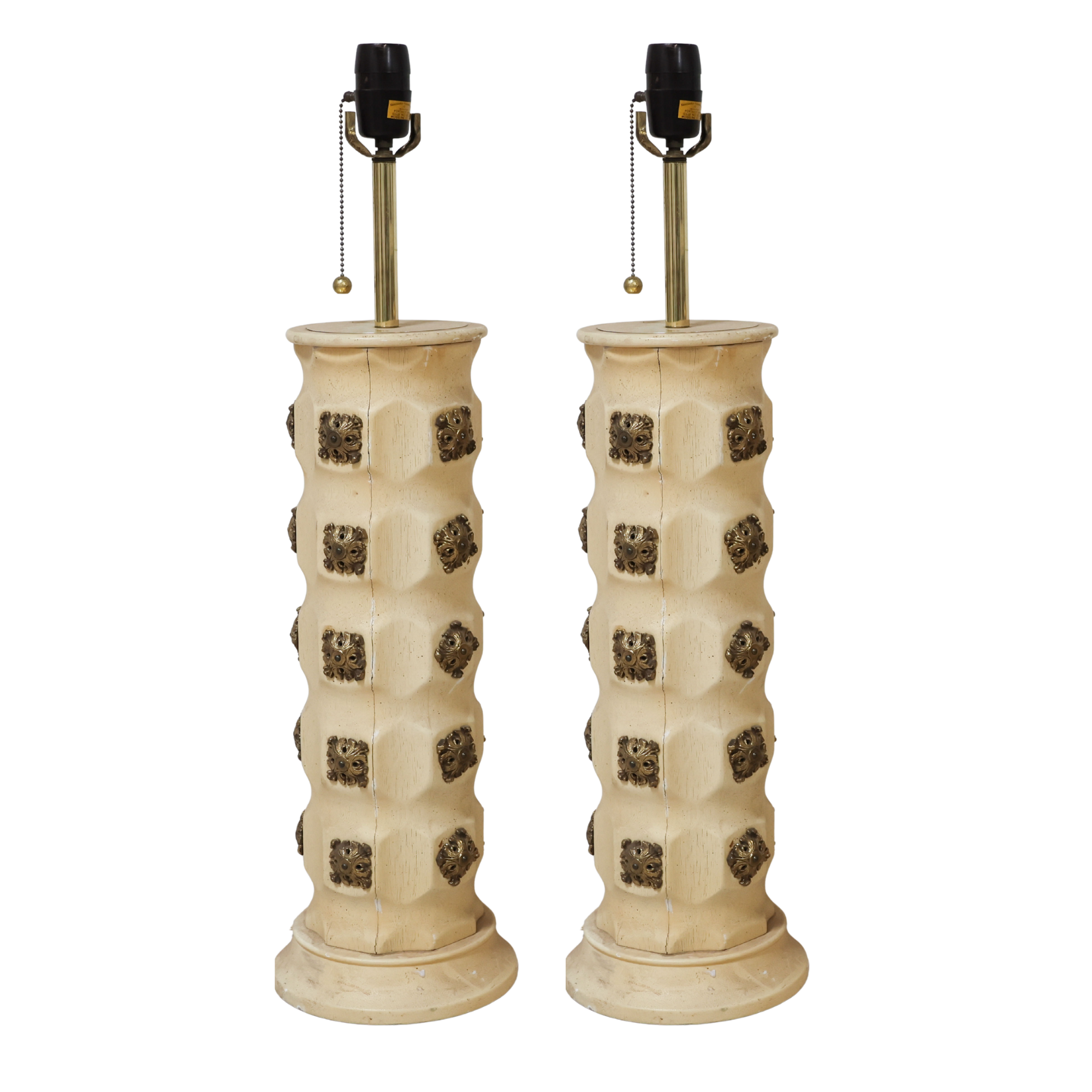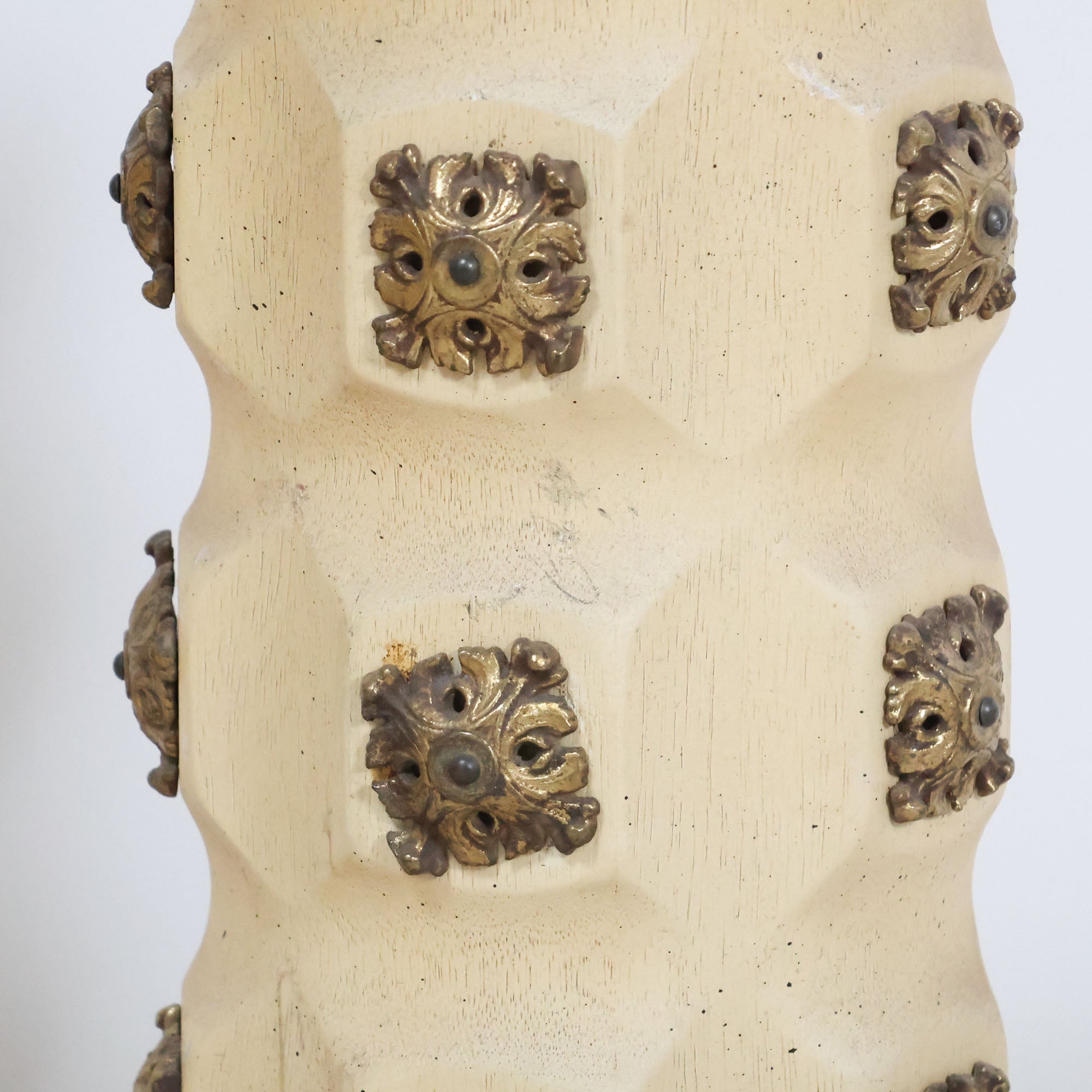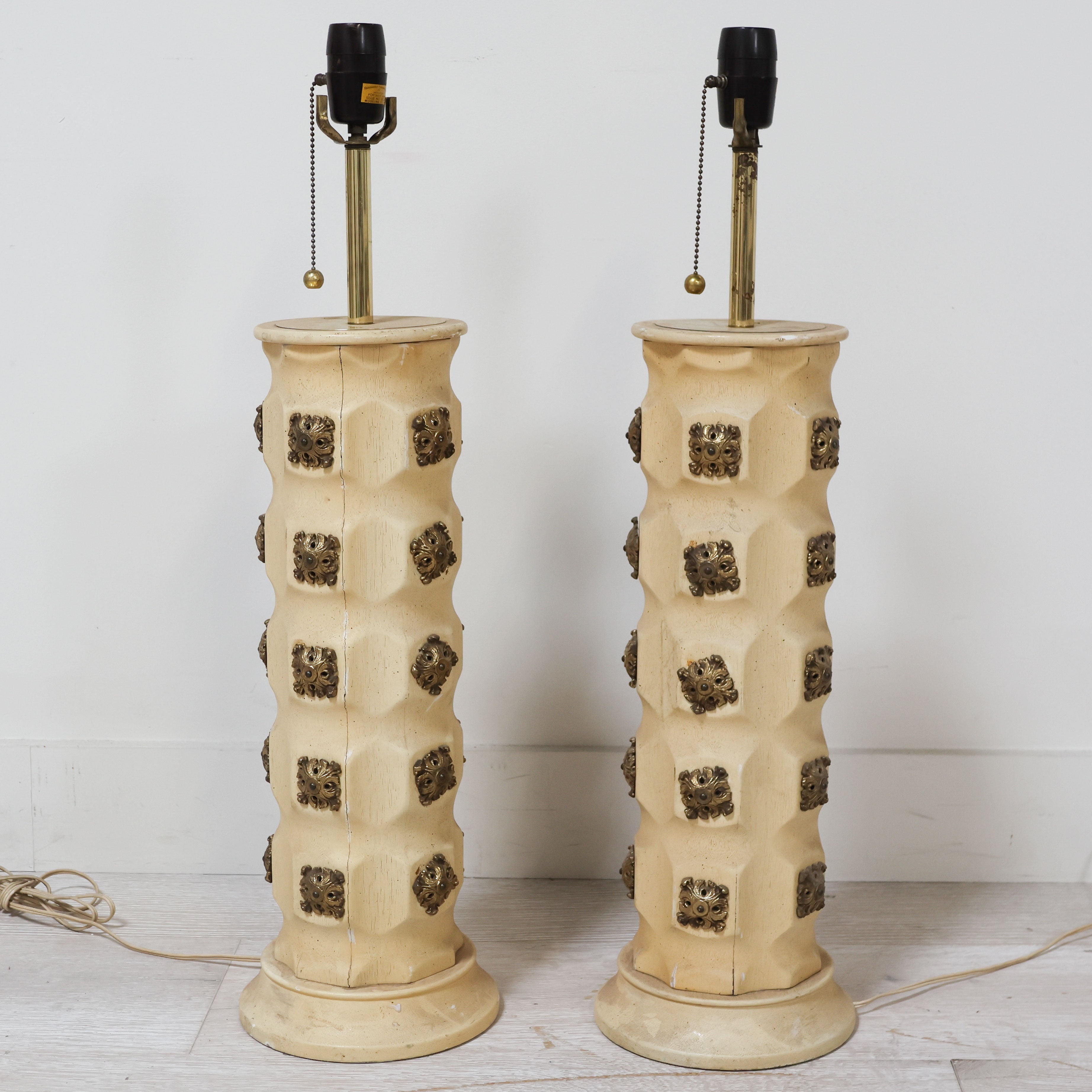 Scouted at Round Top, the tall lamp bases feature a repeating honeycomb pattern adorned with ornate brass medallions, creating a striking mix of texture and shine. Their creamy off-white finish and midcentury silhouette make them perfect for adding dimension to any space.