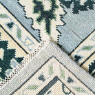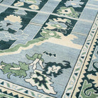 This custom oushak-inspired wool rug is hand woven with a Turkish-style knot by artisans in India. The piece features a light blue background and border with blue and green motifs.