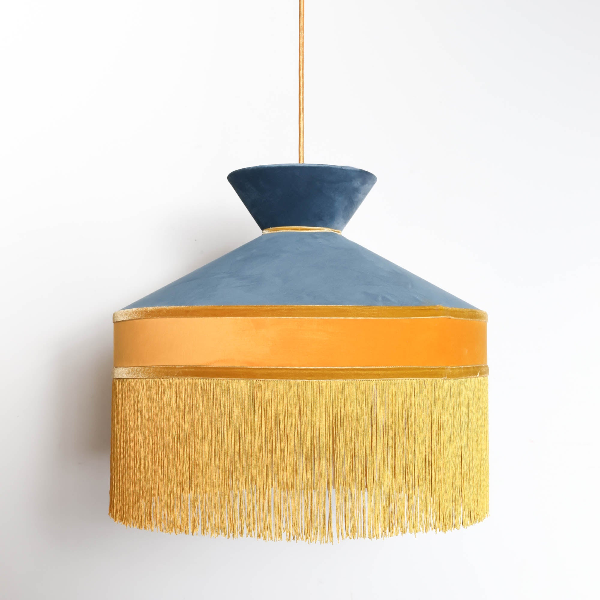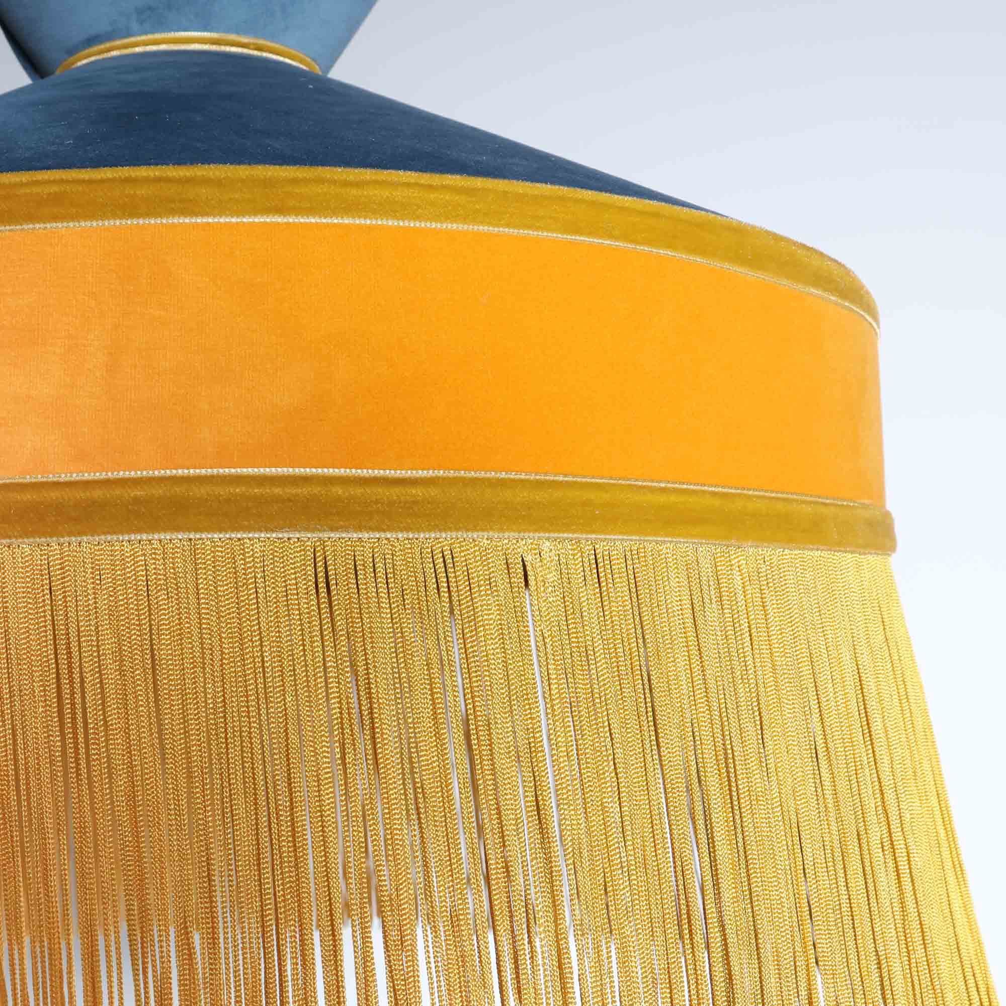 Bold and architectural, this chandelier commands attention with its sculptural silhouette and daring color palette. Rich velvet in cerulean blue and mustard wraps the frame, while golden fringe drapes from the base, adding movement and warmth.