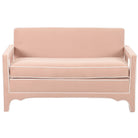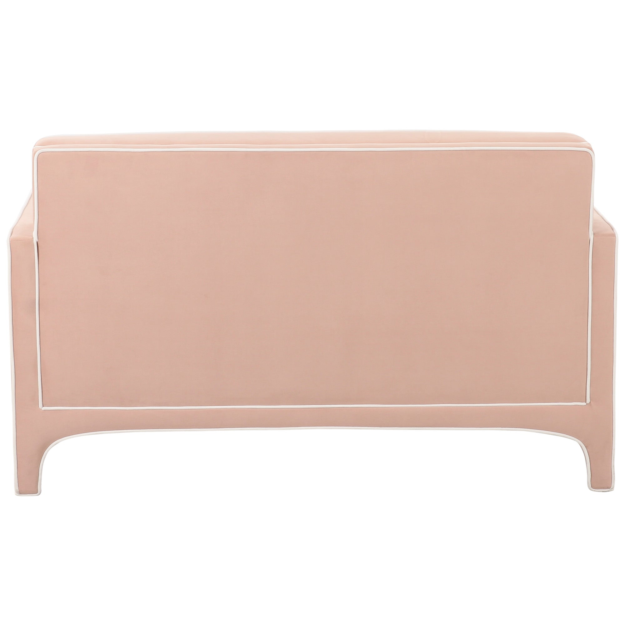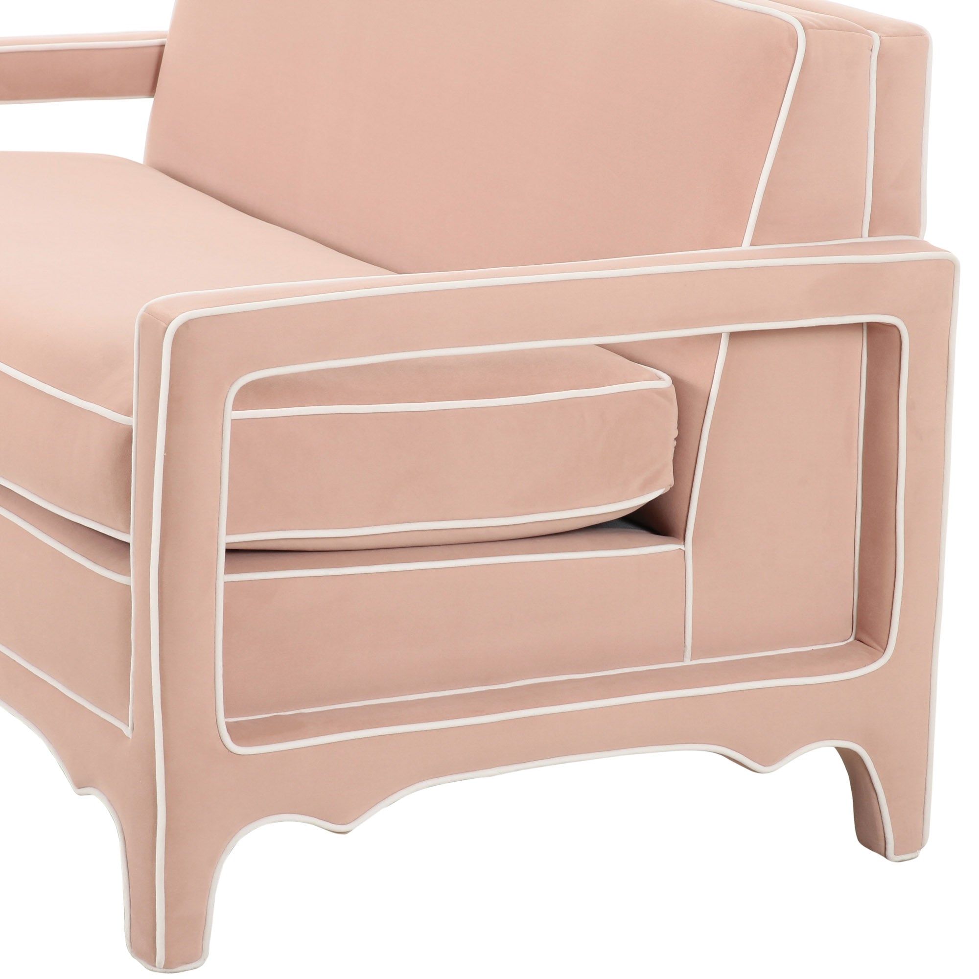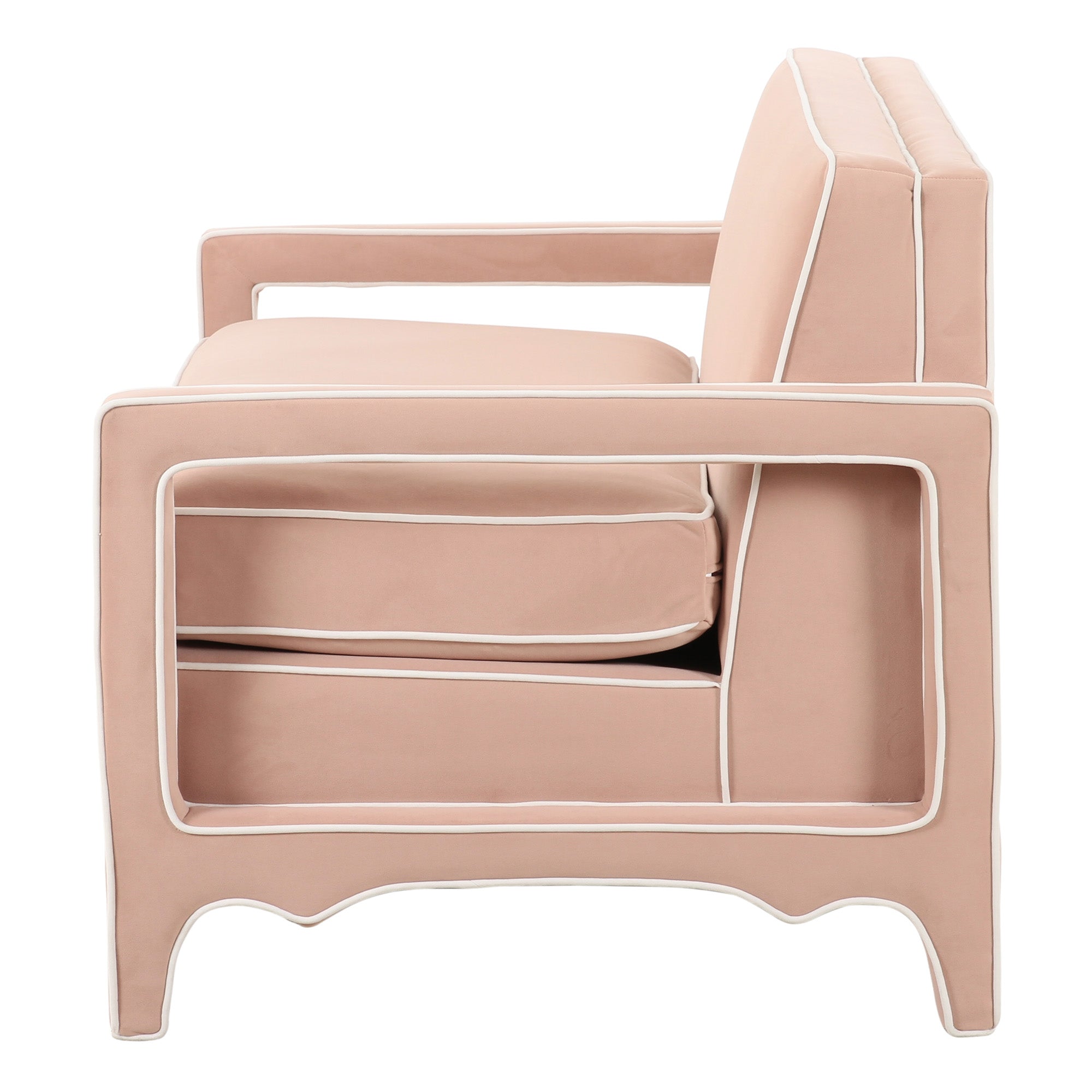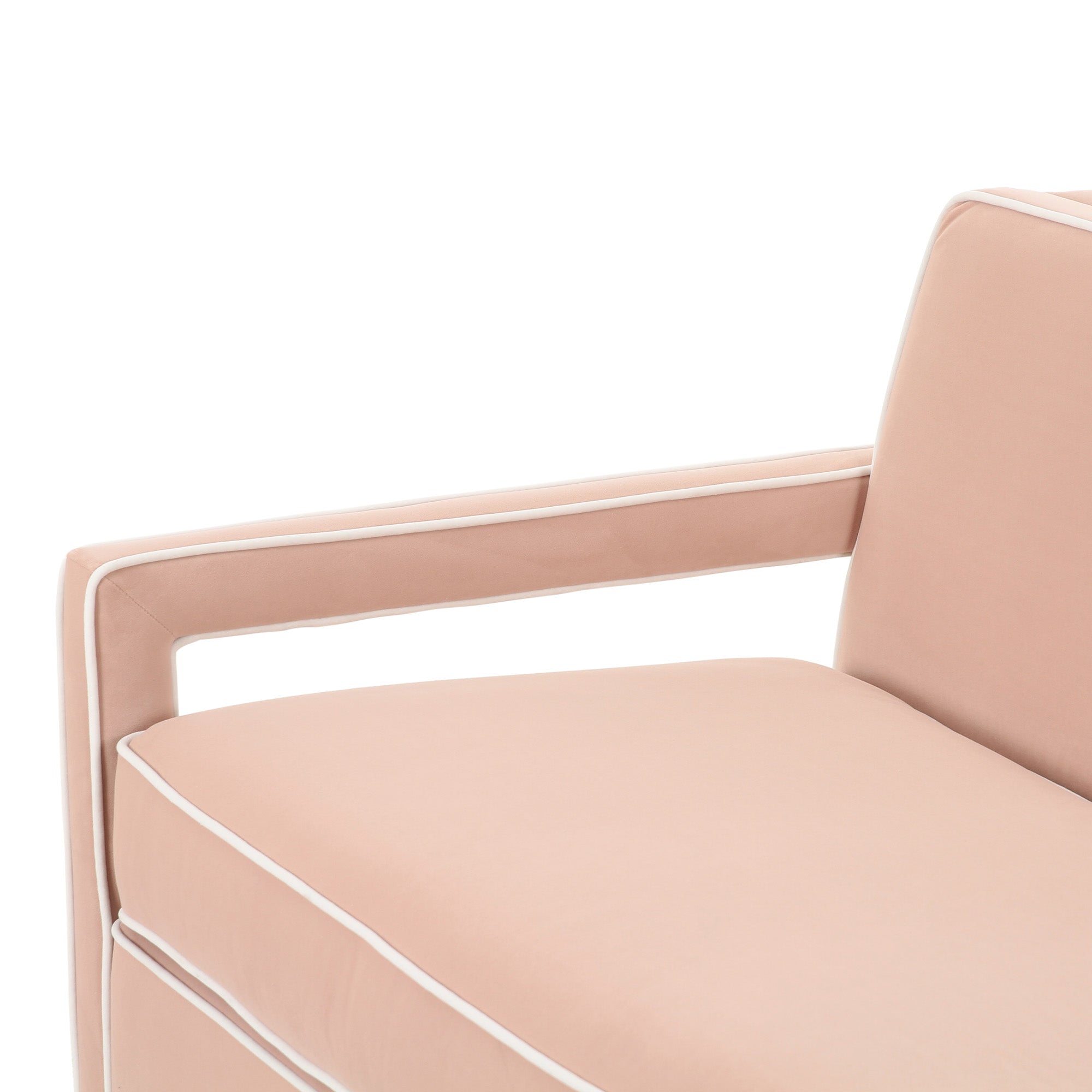 The blush velvet upholstery is a poly blend with form AND function. Tightly stitched with the perfect pile, this soft textured velvet provides comfort and durability. Want to try before you buy? Click here to order a fabric sample!