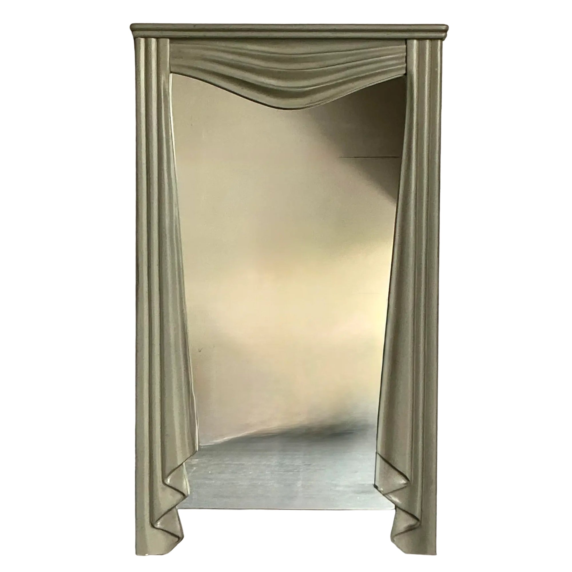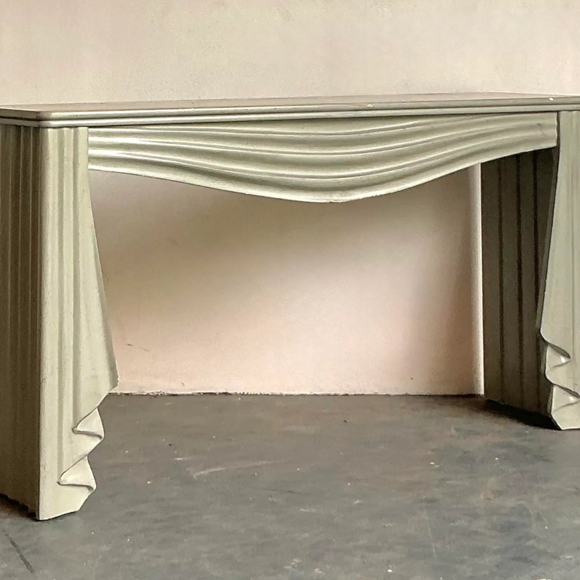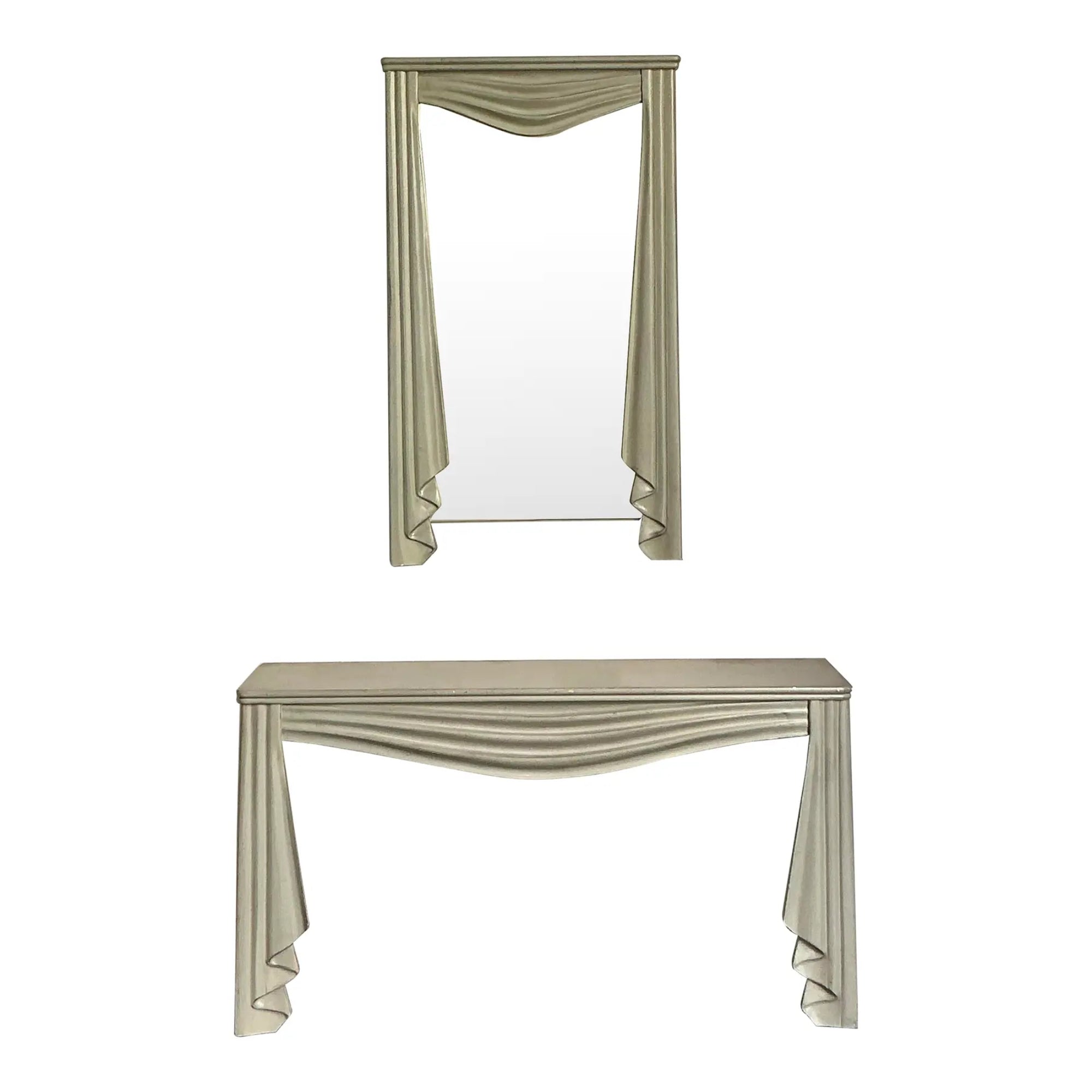 Elevate your interior with this captivating Hollywood Regency console table and mirror set, a true testament to the opulent glamour of its era. Each piece features meticulously carved swag detailing, mimicking draped fabric with exquisite realism, showcasing superior craftsmanship and a flair for dramatic elegance.
