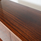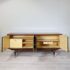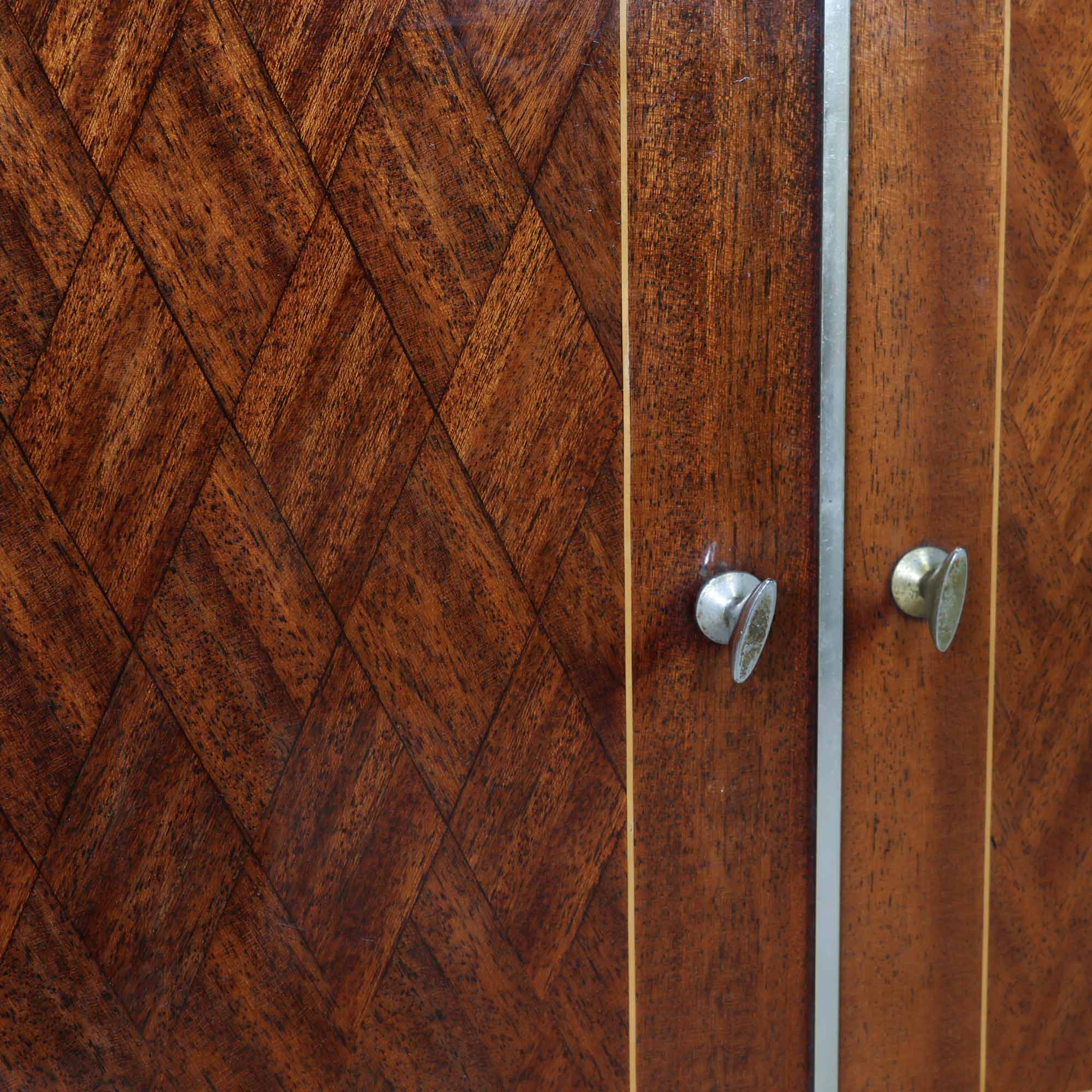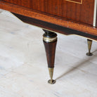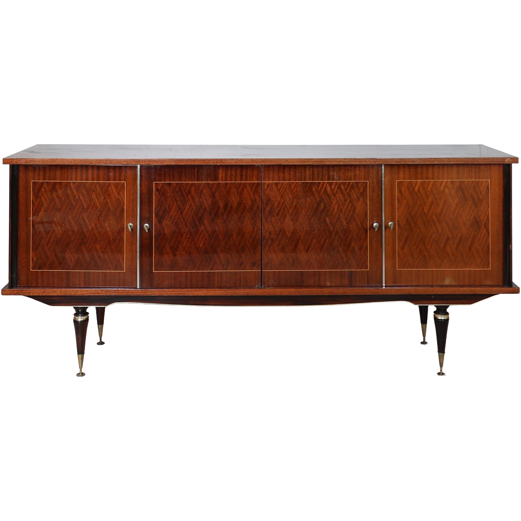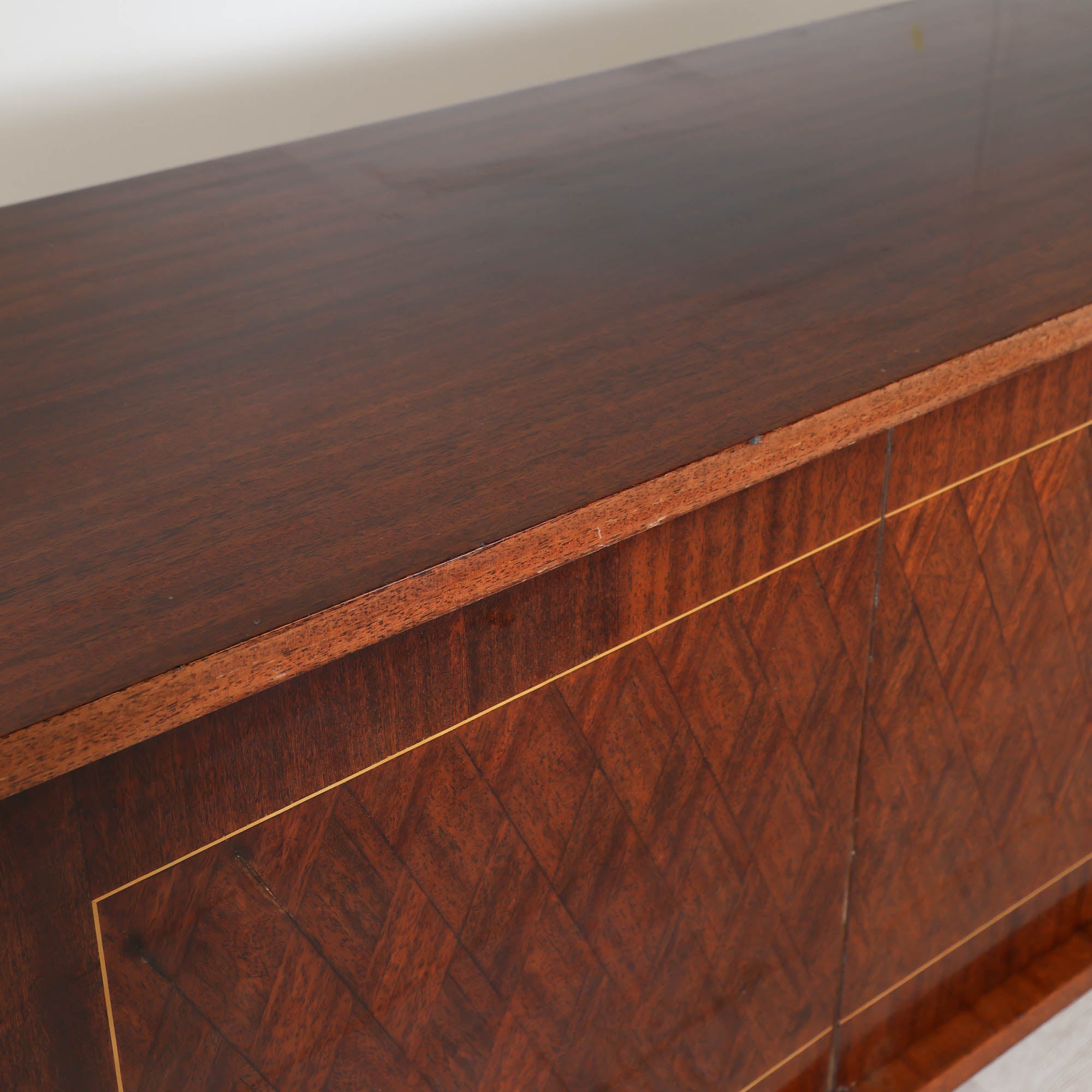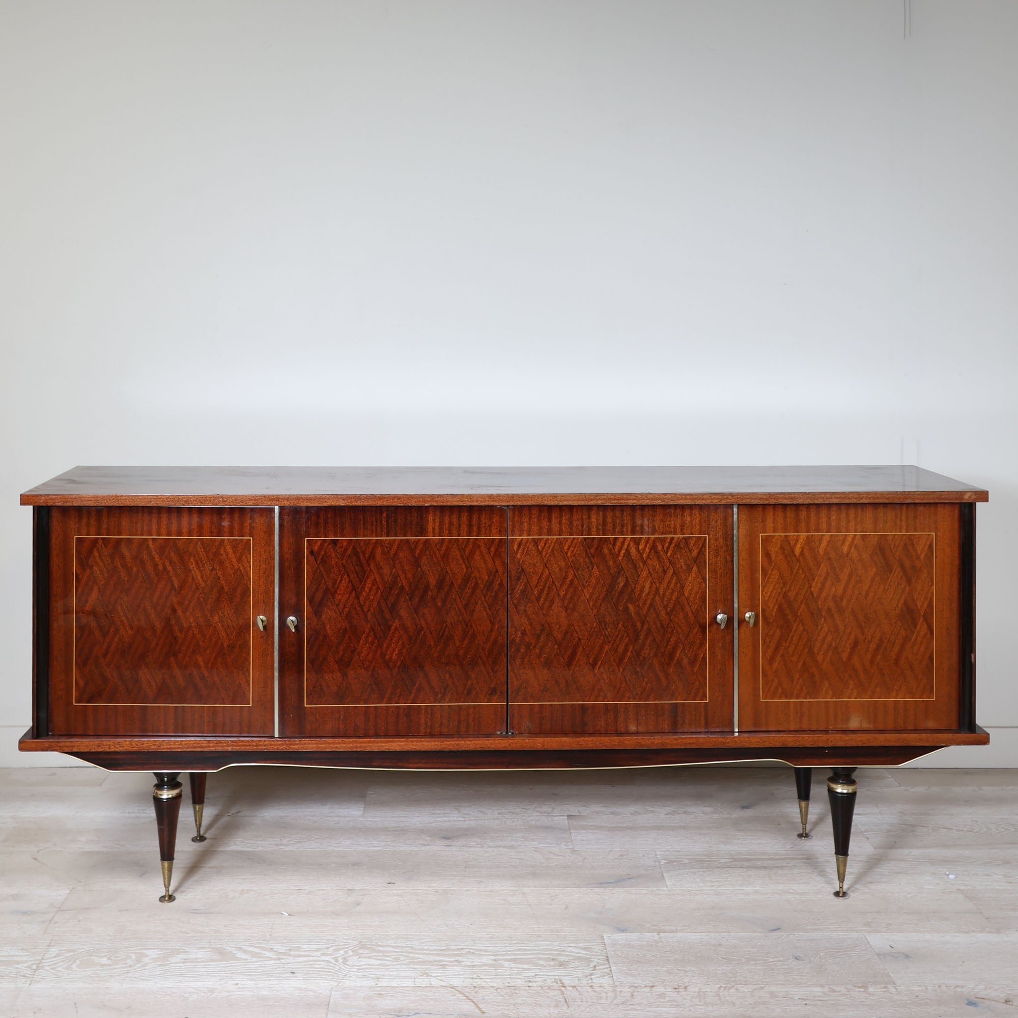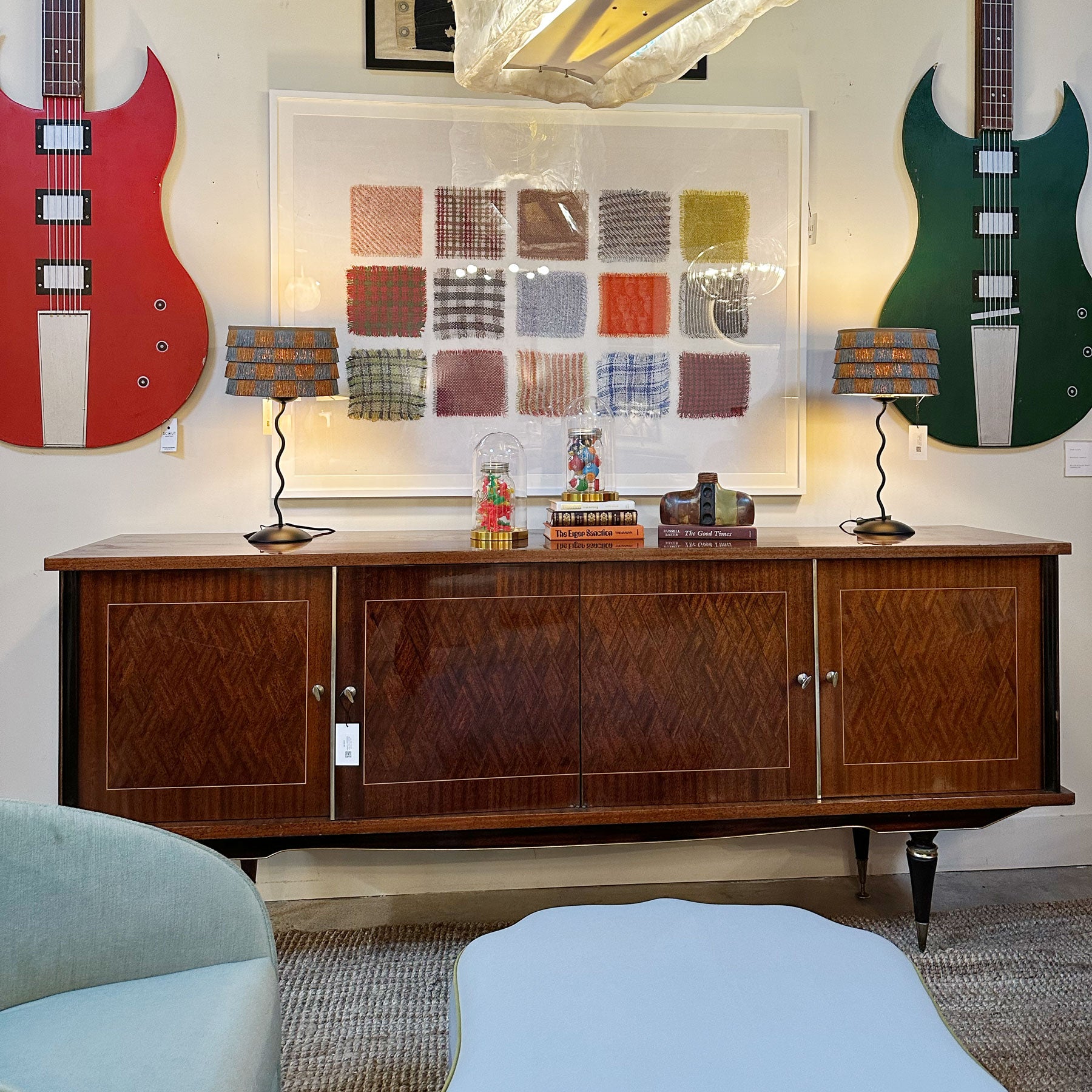 Stunning vintage sideboard showcasing Art Deco details. From a fabulous silhouette to eye-catching brass inlay details on the four doors, this well-made piece brings all of the intrigue. We love the herringbone-inspired diamond parquet veneer of the wood! Finished in a high gloss lacquer for a sleek and shiny look.