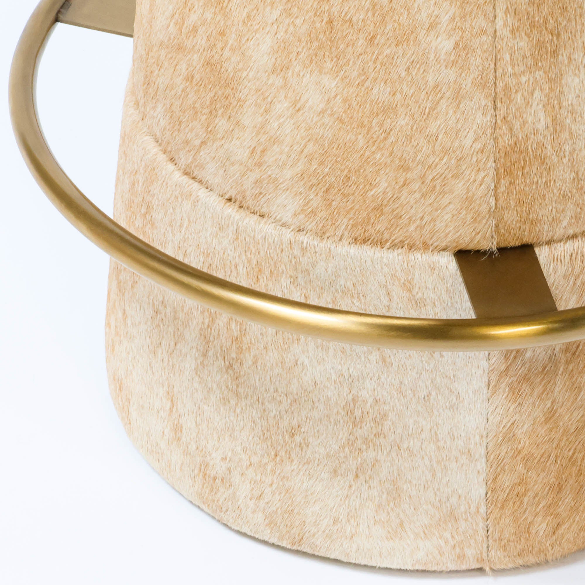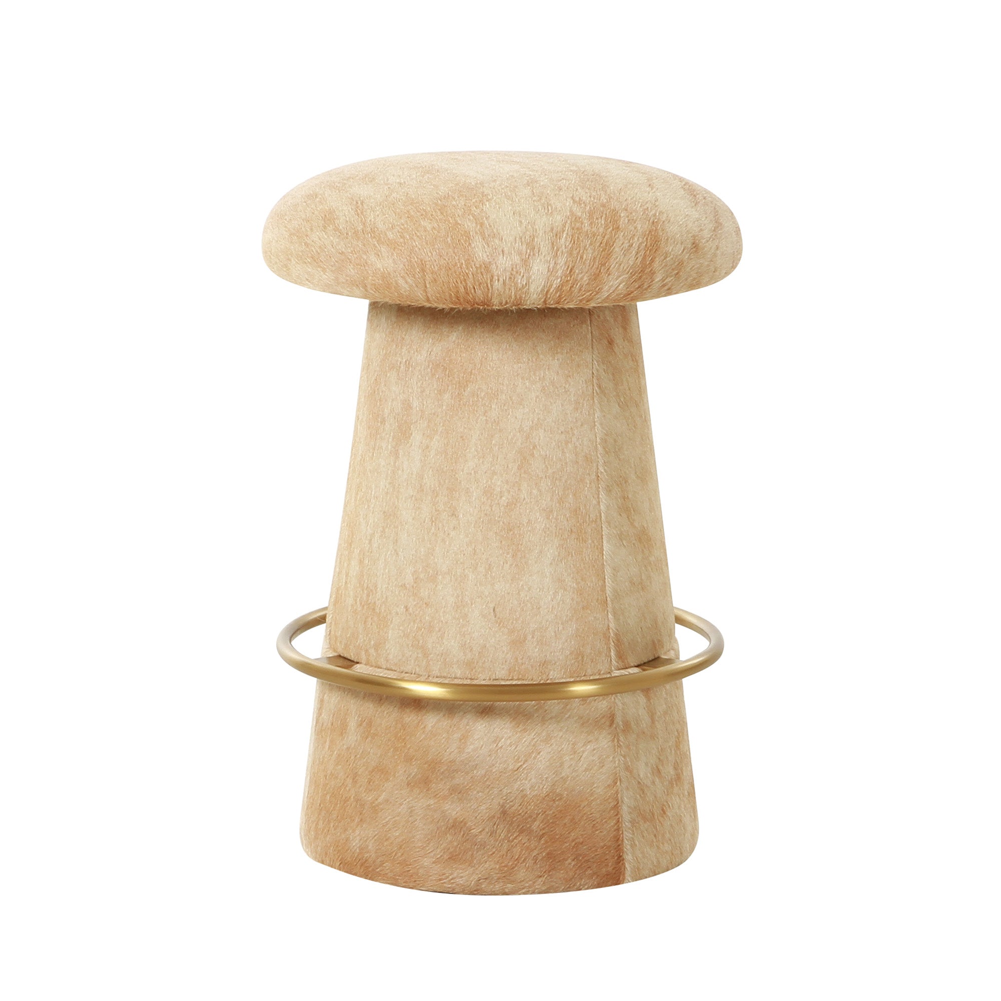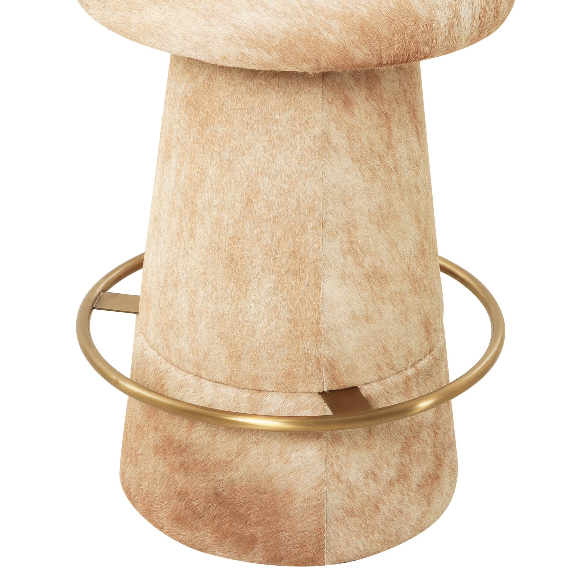 Our Mushroom Counter Stool is ready to energize and elevate your kitchen entertaining. Featuring a simple round seat that spins 360 degrees and contrasting straight lines that make up the base. Beige and ivory leather cowhide upholstery adds subtle warmth and rich visual intrigue to the overall design, while a luxurious circular brass footstool is the perfect perch to keep your feet comfortable.