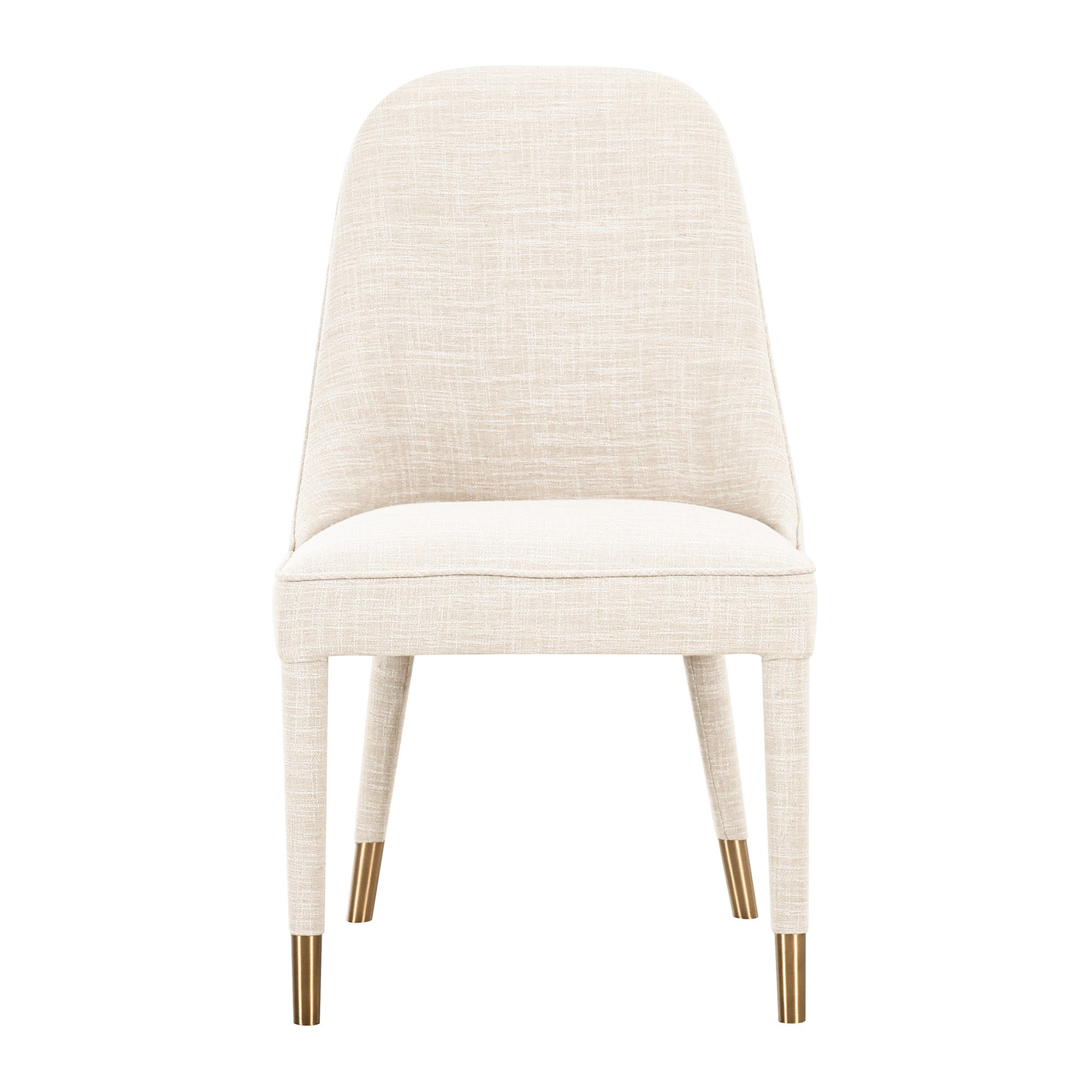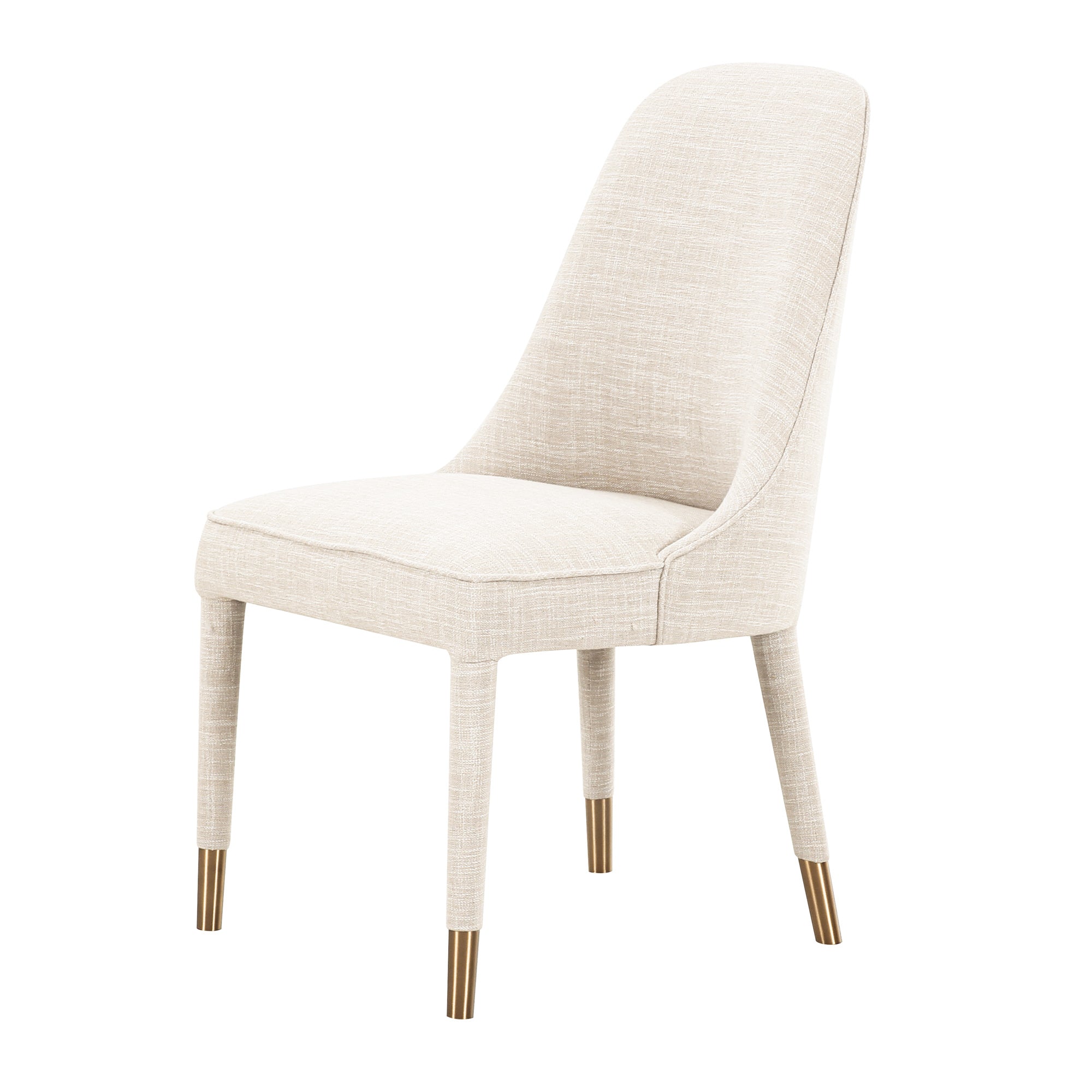 Dine in style with Tavish. This heavenly seat combines classy ivory linen with a curved back for ultimate dining comfort. Brass sabot accenting is the icing on the dinner party cake.