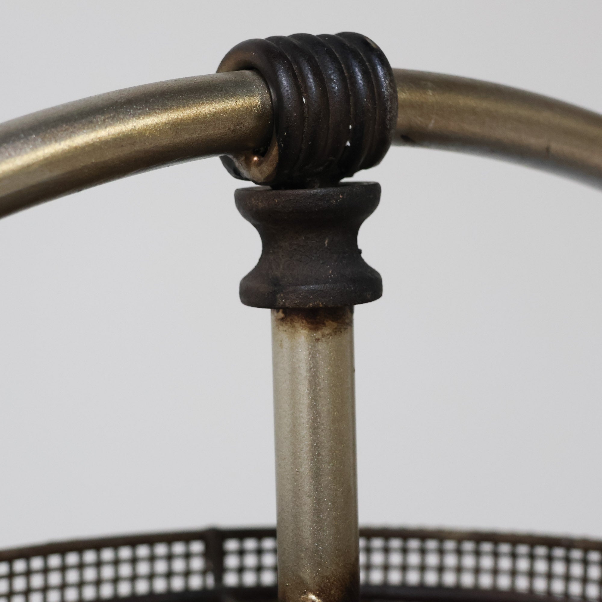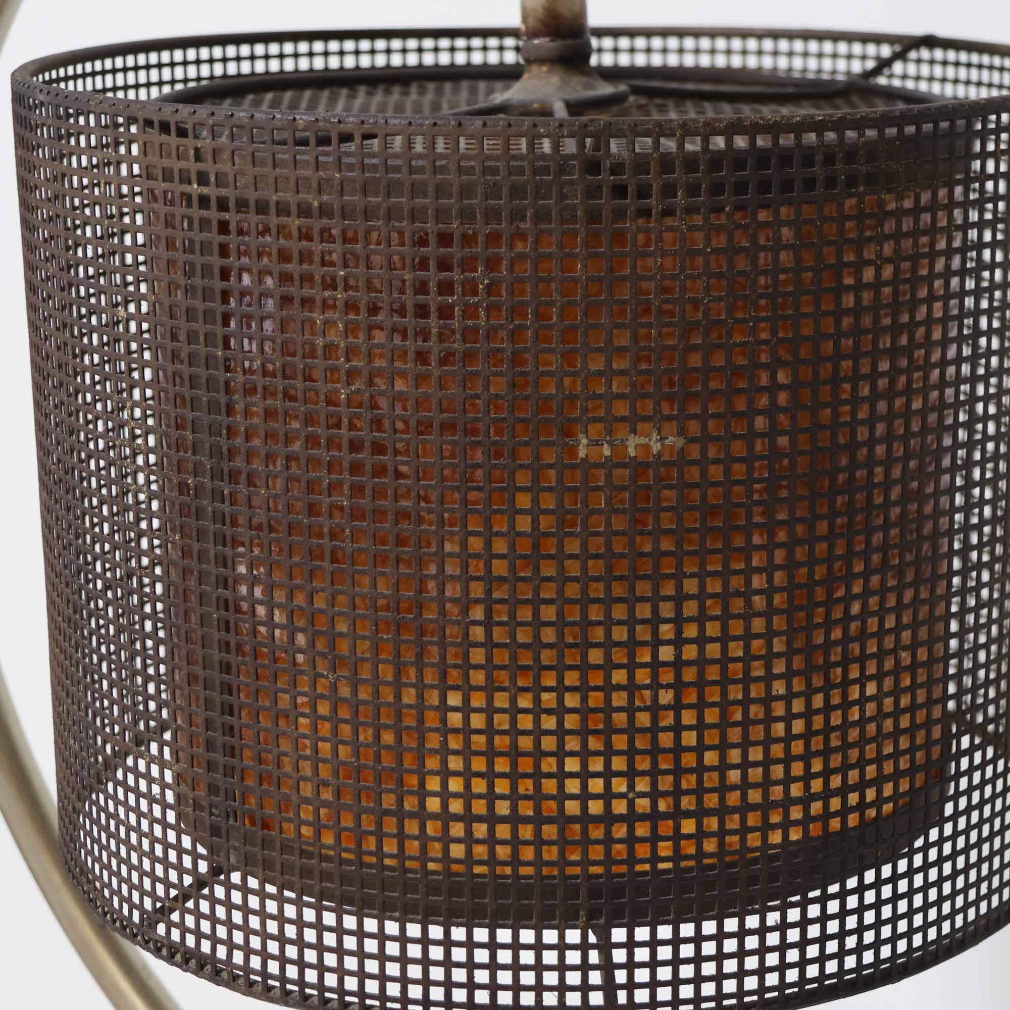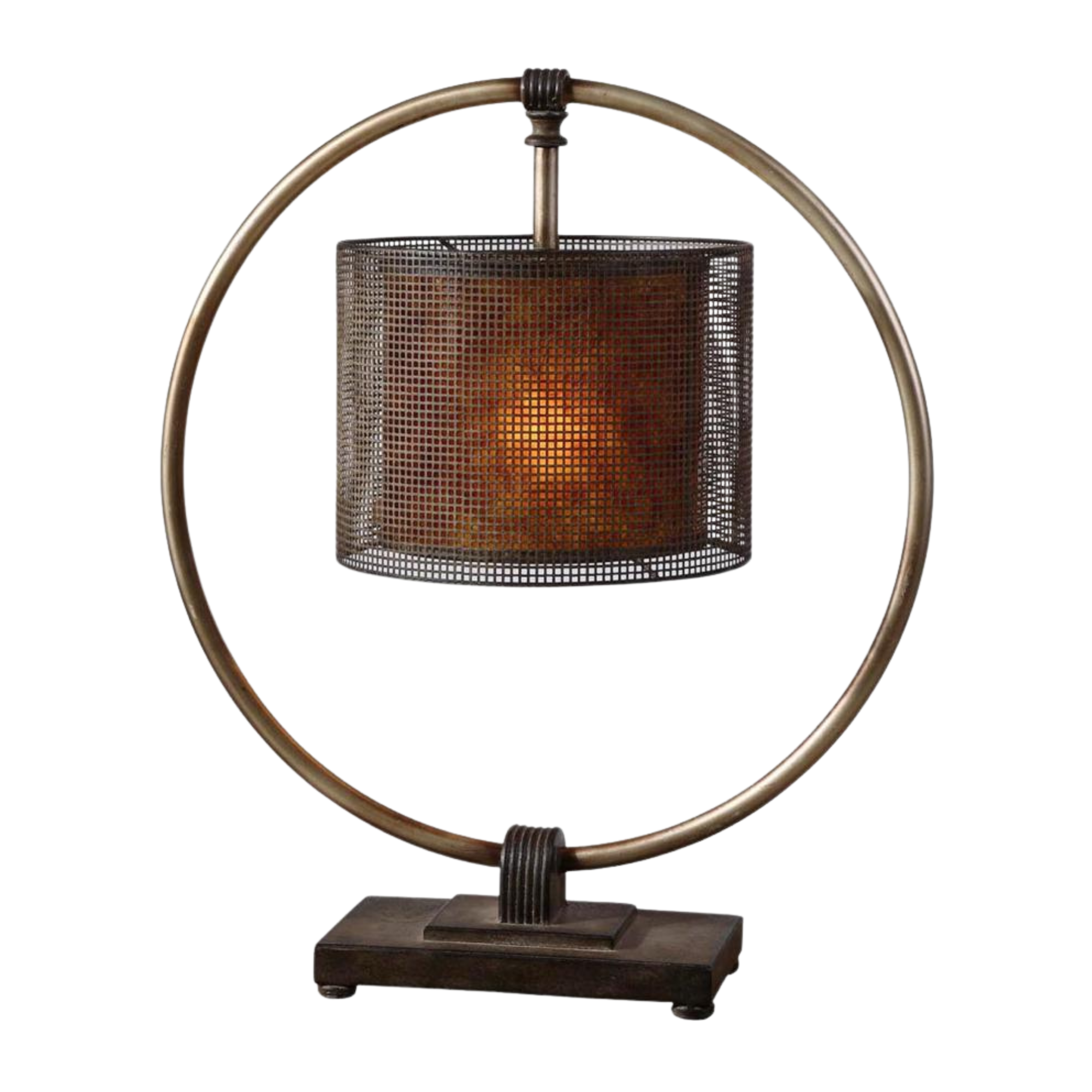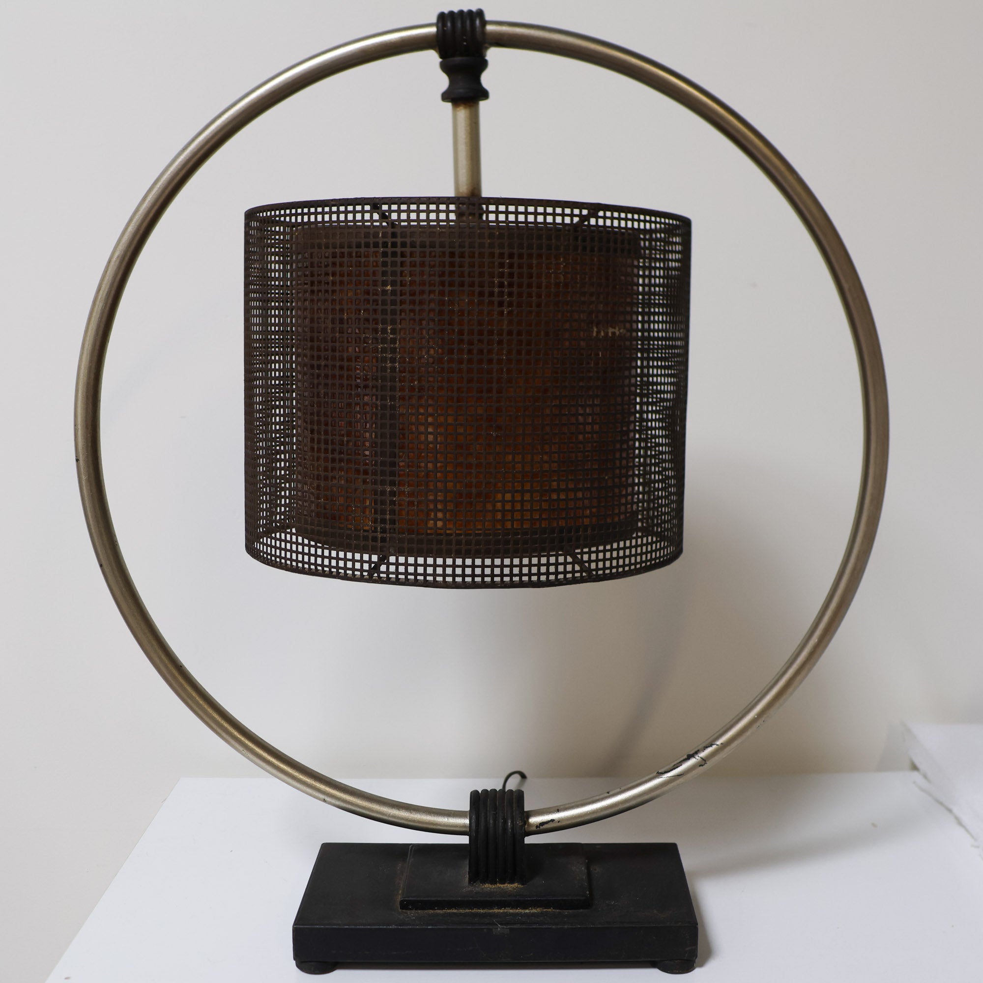 This unique table lamp features a circular metal frame with a perforated cage-style shade, giving off a warm, moody glow when lit. The bold round silhouette sits on a solid base, making it as much an art piece as it is a source of light. Perfect for adding character to a desk, console, or nightstand.