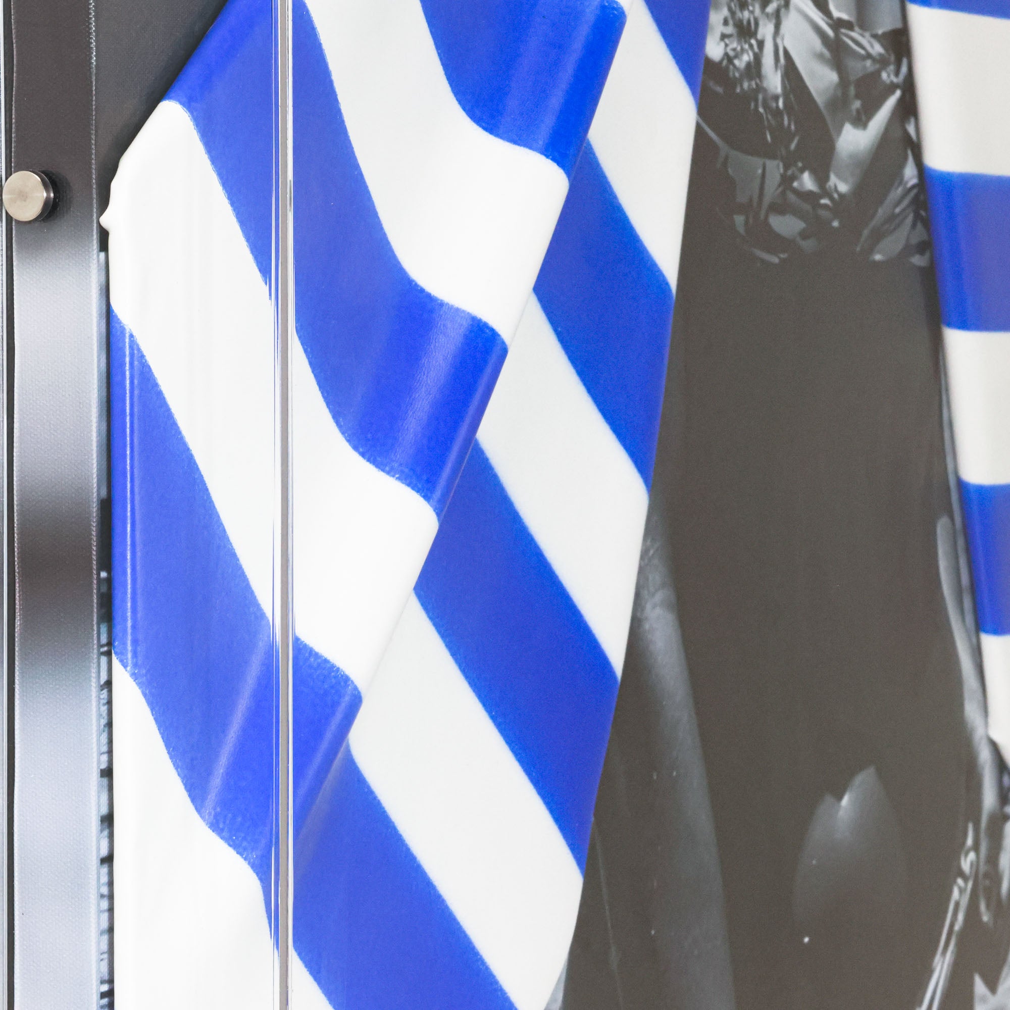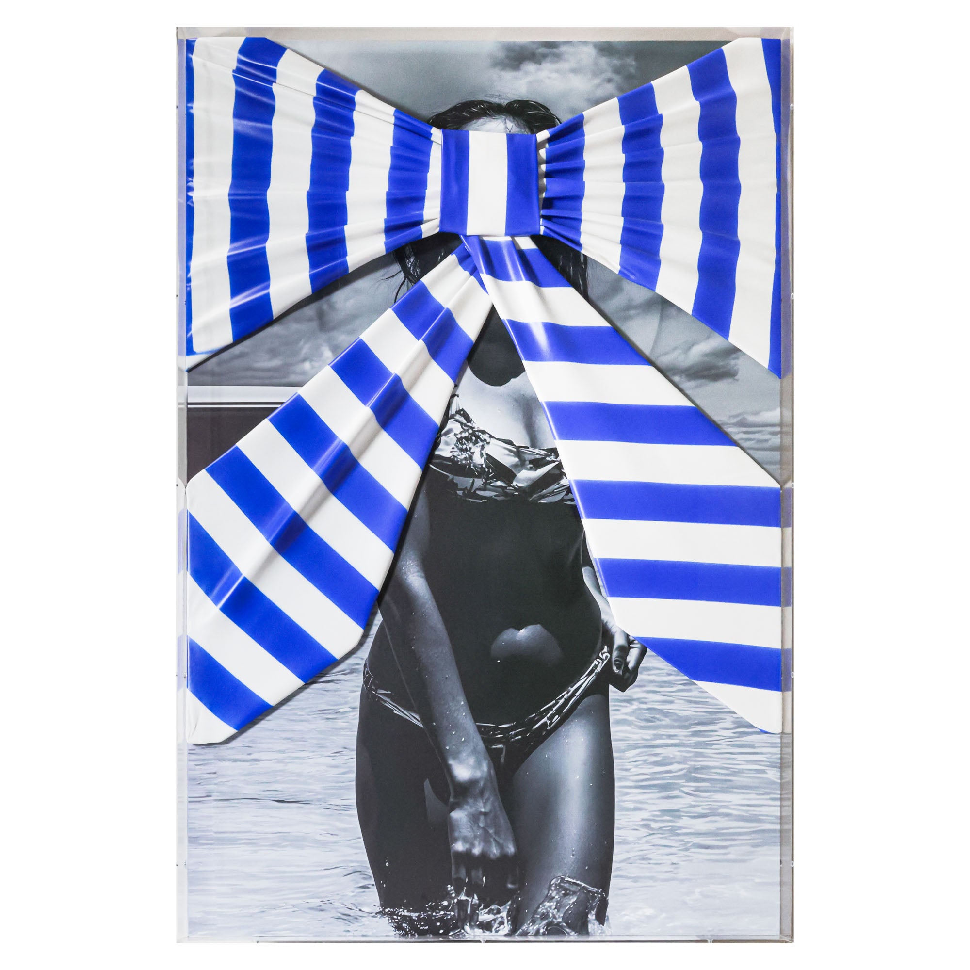 From the Tat Frederick studio, All Tied Up features a photo printed on canvas of a runway-ready lady. An oversized blue and white striped bow, made of hand-carved wood and leather, showcases detail and obscures our bikini-clad heroine's face in style.