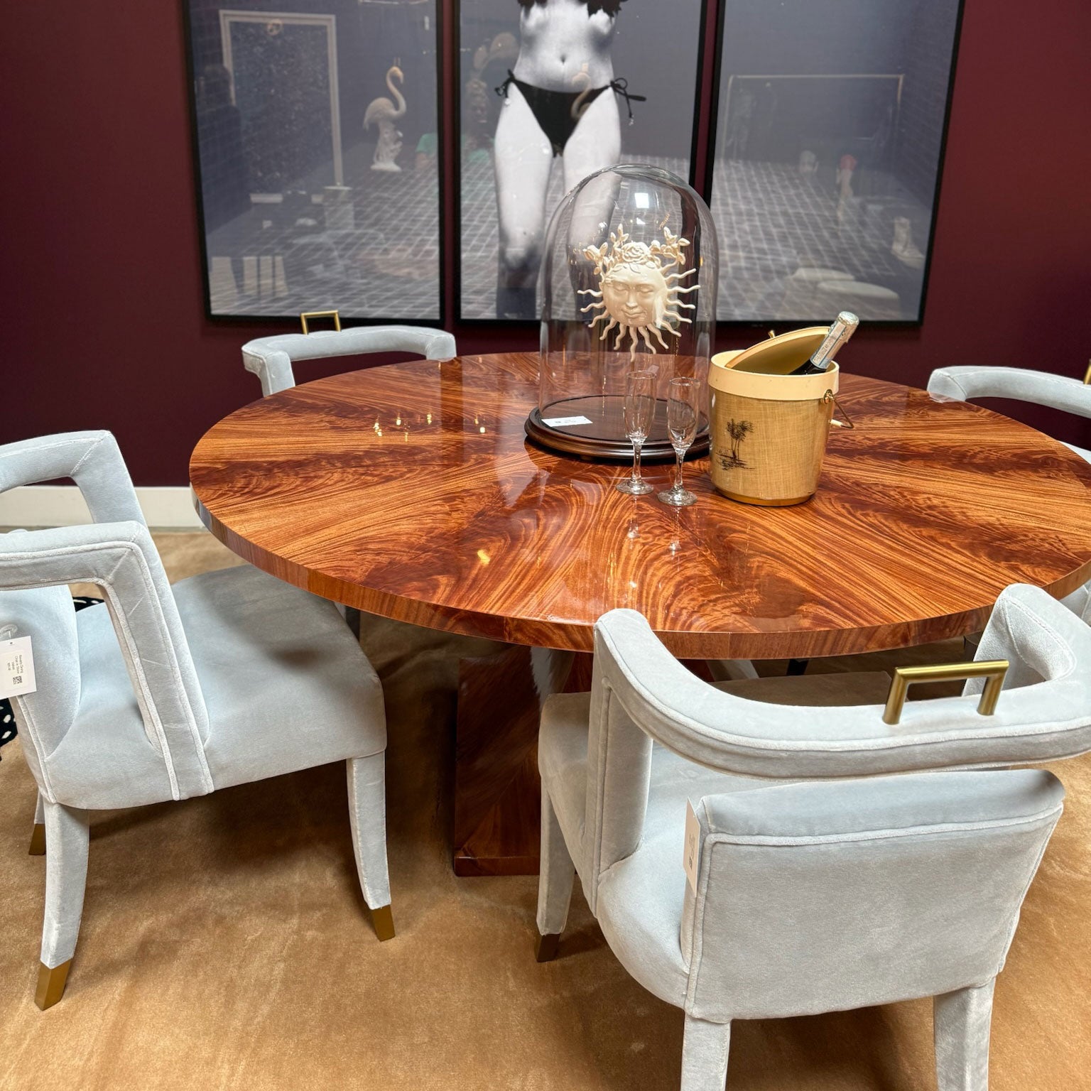 Bespoke without the wait y'all - get your dream piece with quick shipping! From our custom collection, this 68" George Dining Table in our Top Shelf Crotch Mahogany veneer. Finished with a true French polish—an Old-World technique built from countless thin layers of hand-rubbed shellac—this piece glows with a rich, liquid-like sheen.