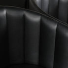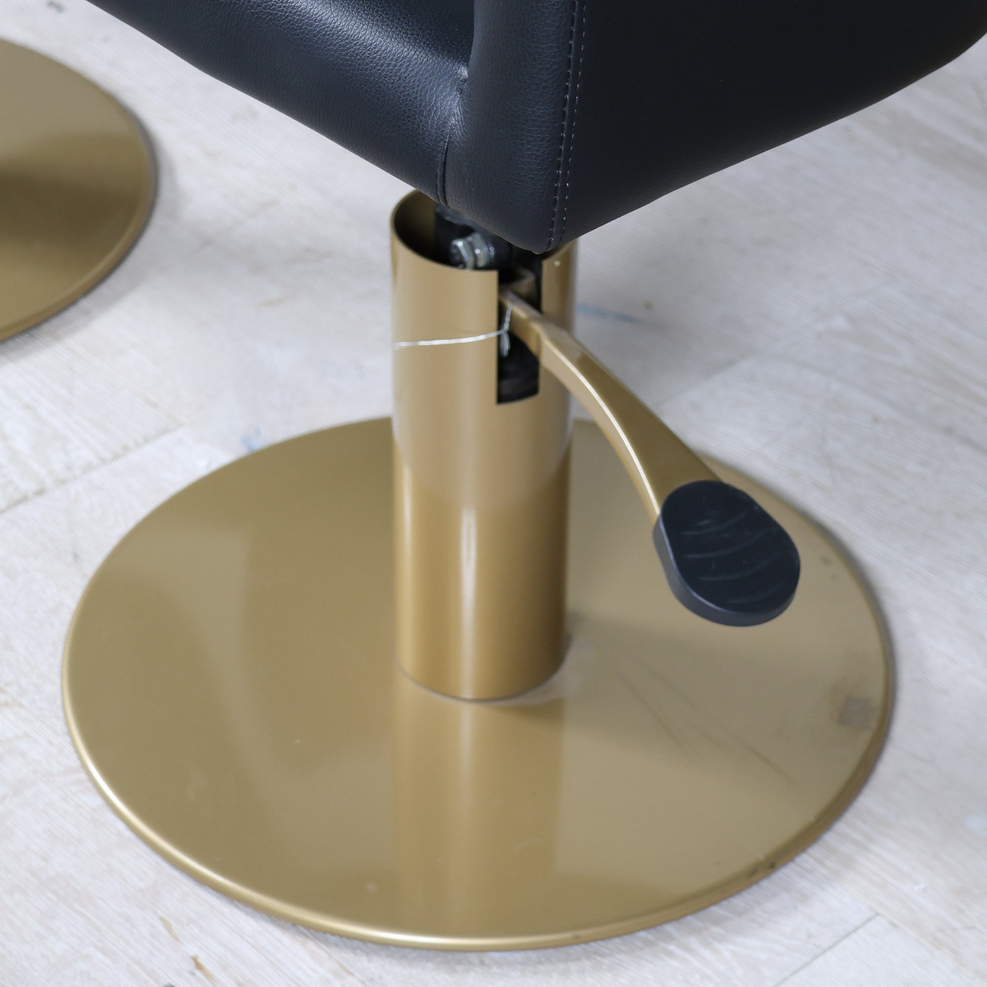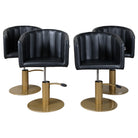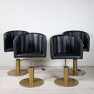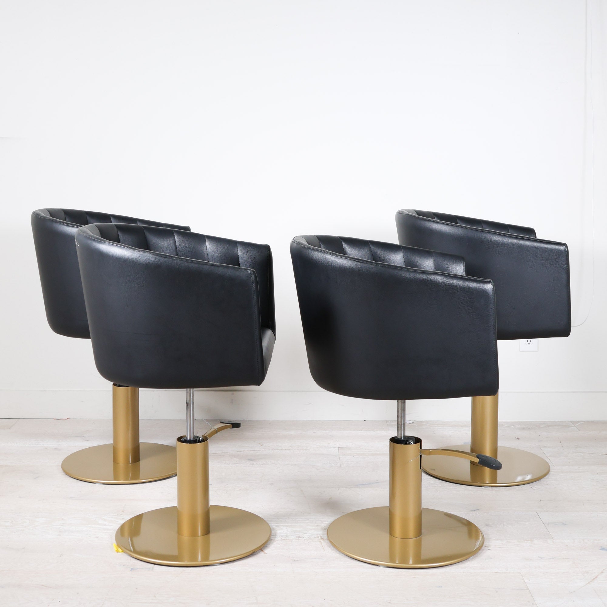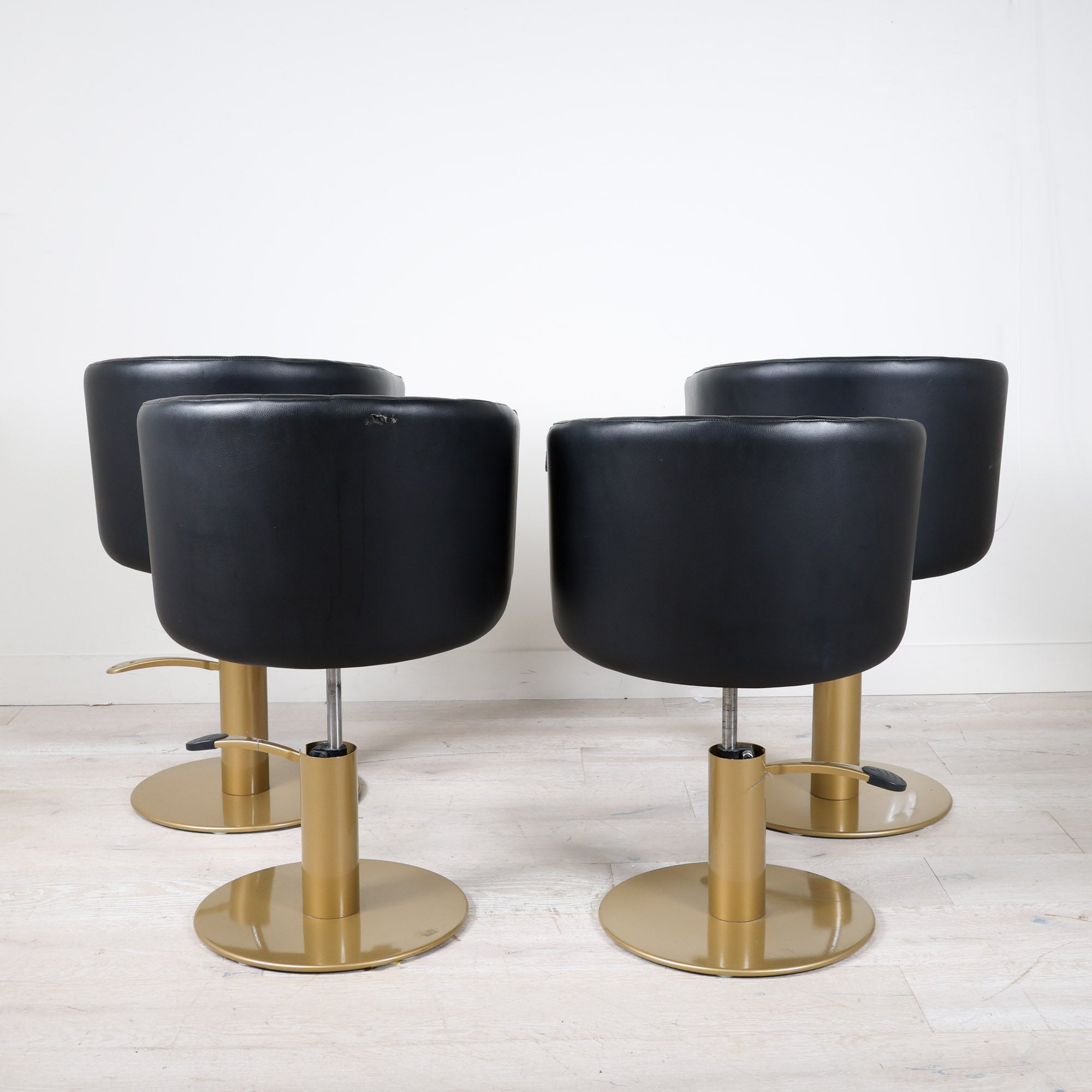 Classic set of four Vezzosi Italian salon chairs with barrel backs and vertical channel stitching. Upholstered in black faux leather with swivel, height-adjustable gilt bases for a polished look and easy comfort.