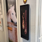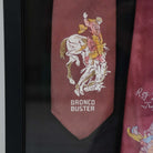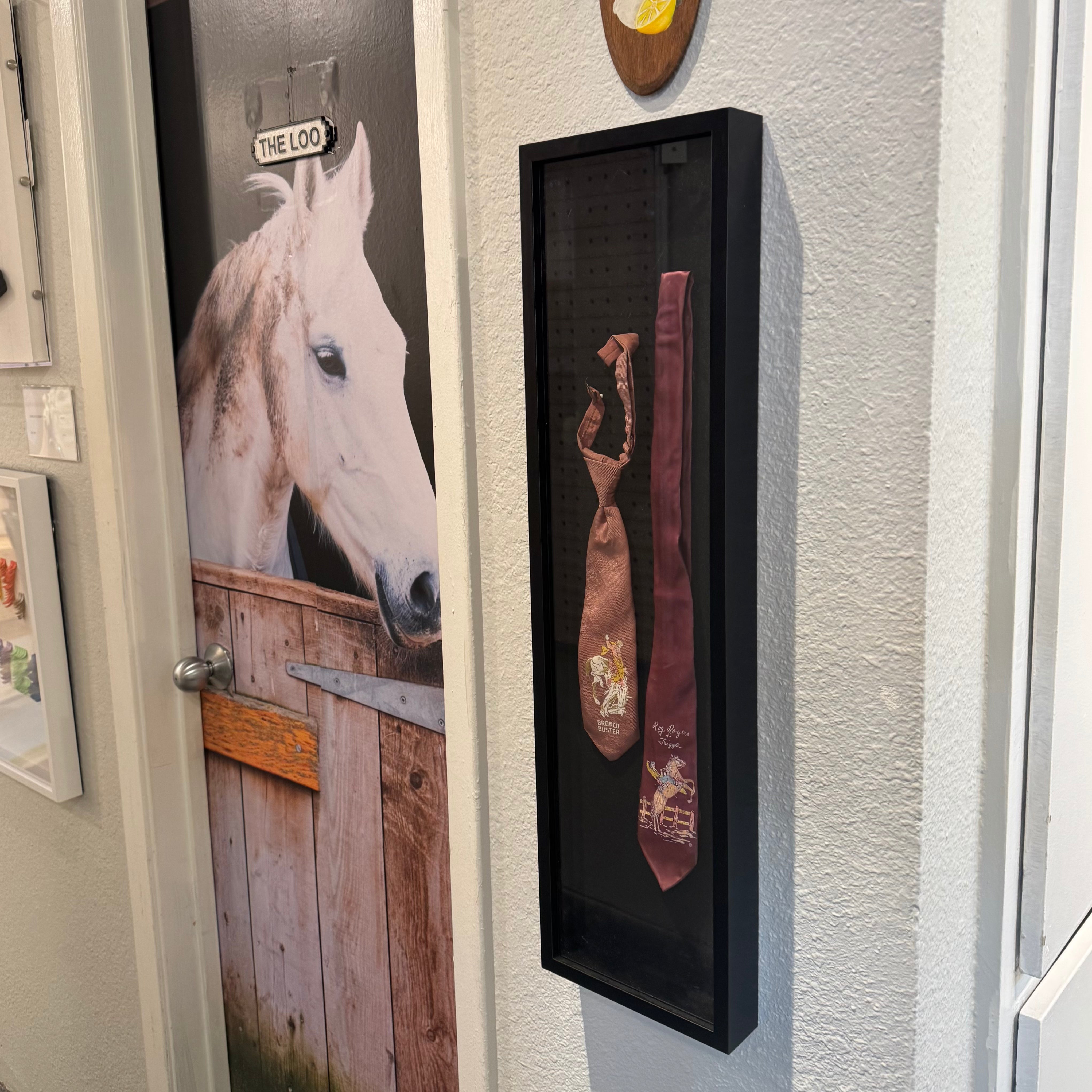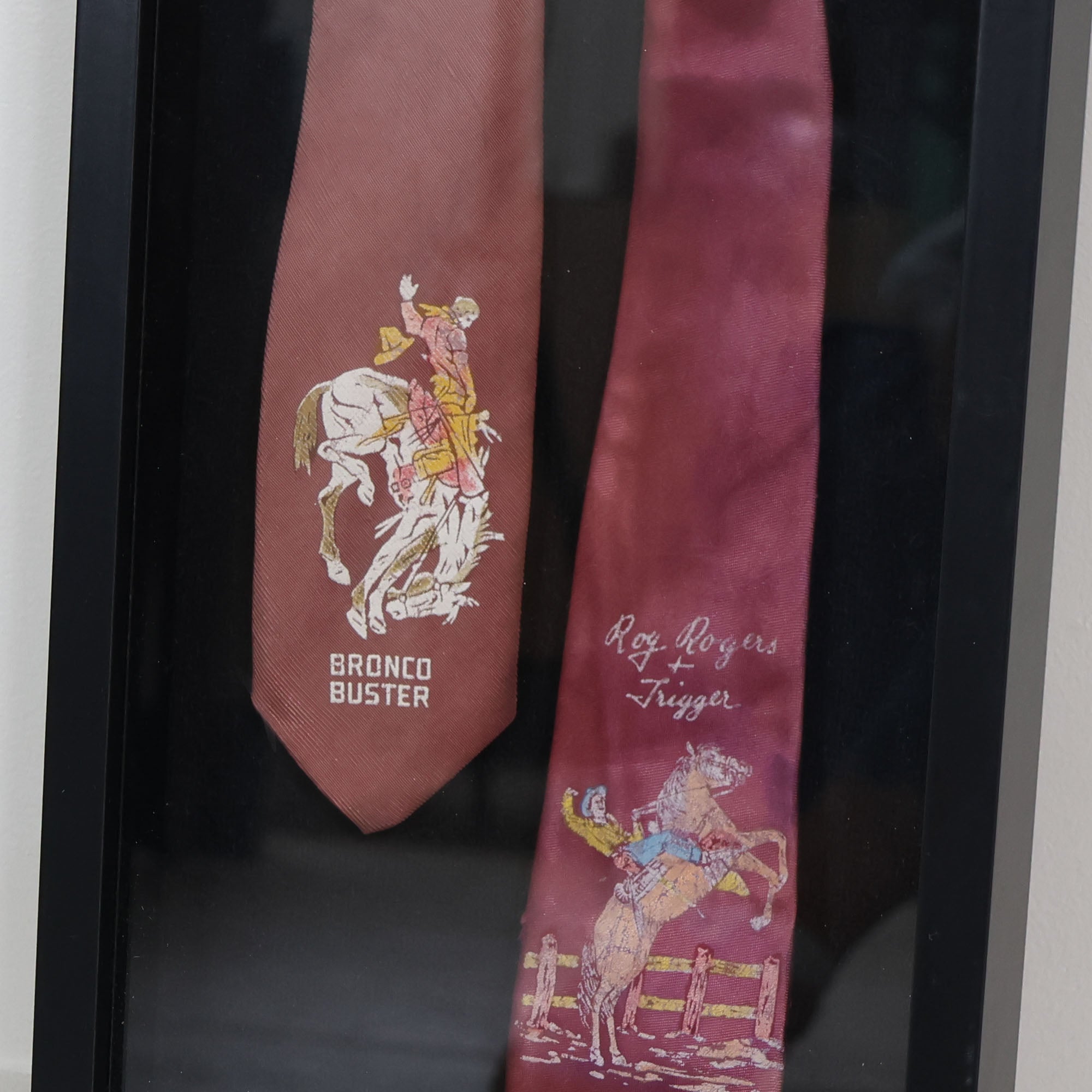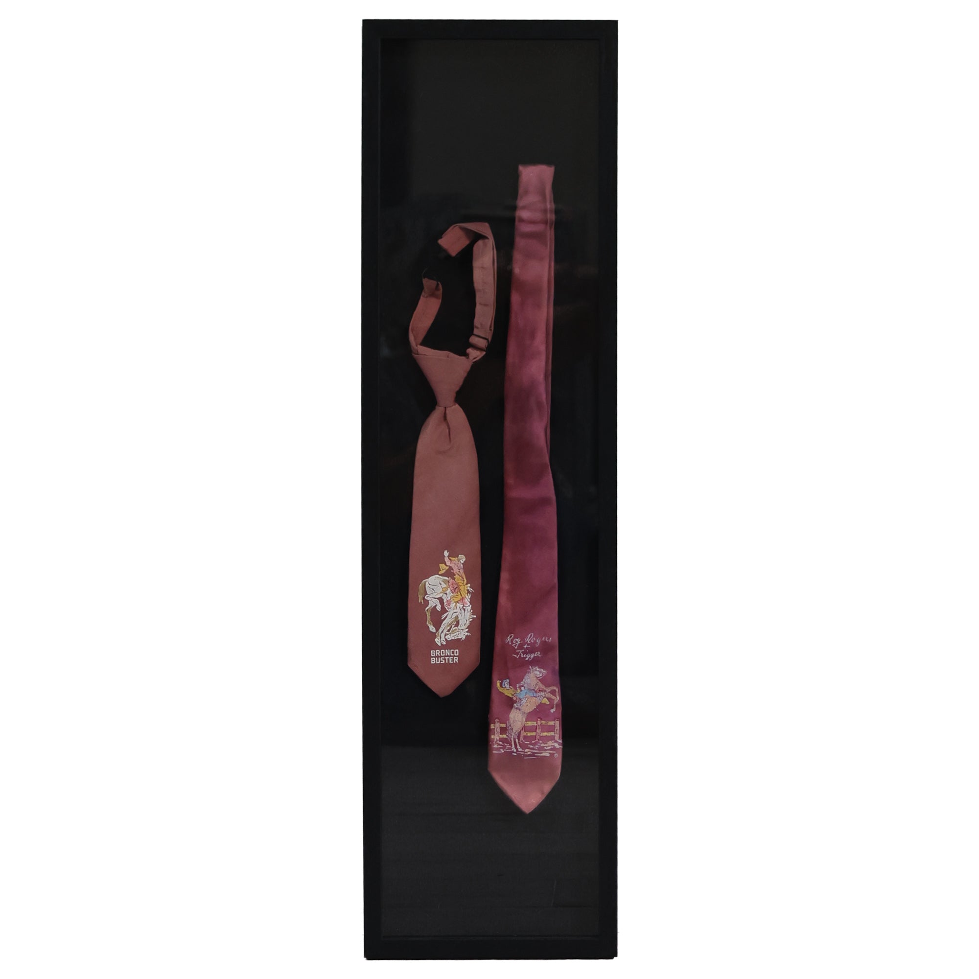 Scouted at Round Top. This unique piece features two distinct ties, each celebrating iconic cowboy imagery and perfectly preserved behind glass in a sleek black frame. An instant conversation starter, this set is ideal for western enthusiasts, or anyone looking to add a touch of authentic retro charm to their decor.