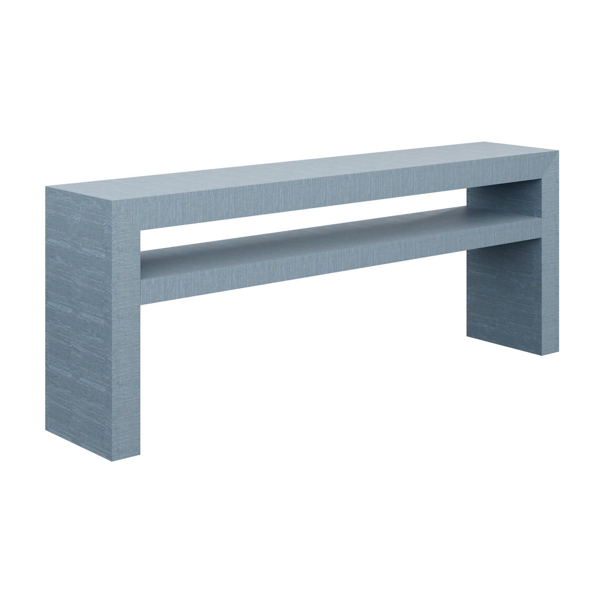 This gorgeous Italianate hand blown glass lamp features an acrylic base and a white linen shade with a round acrylic finial. We love the crisp light blue hue on this graceful design.