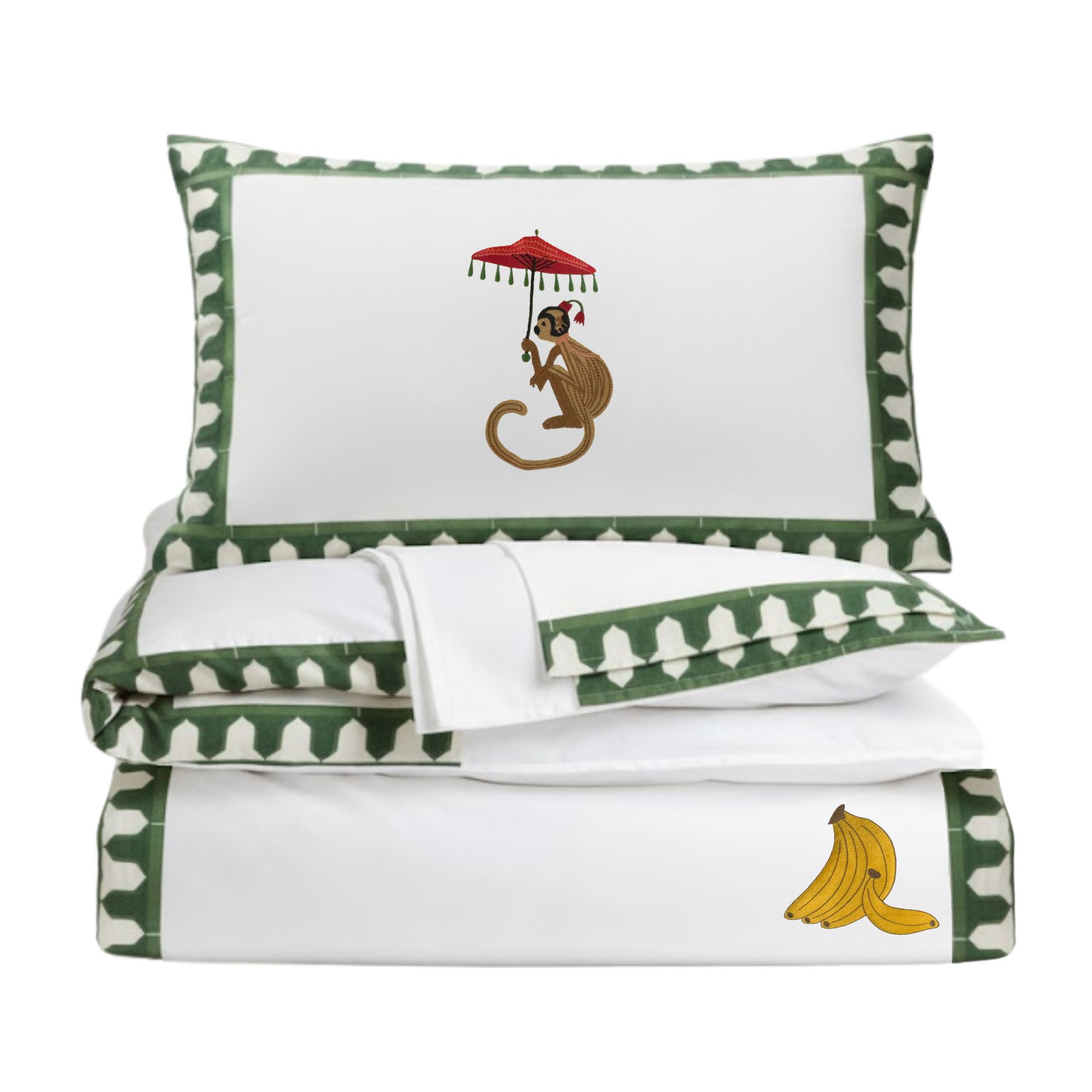 This duvet set brings the fun. Featuring an embroidered monkey with a parasol (and a bunch of bananas, of course), this playful bedding swings between cheeky and chic.