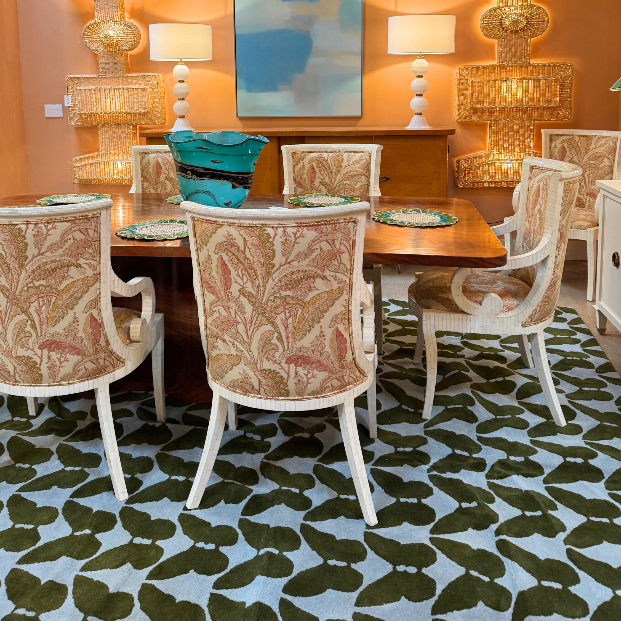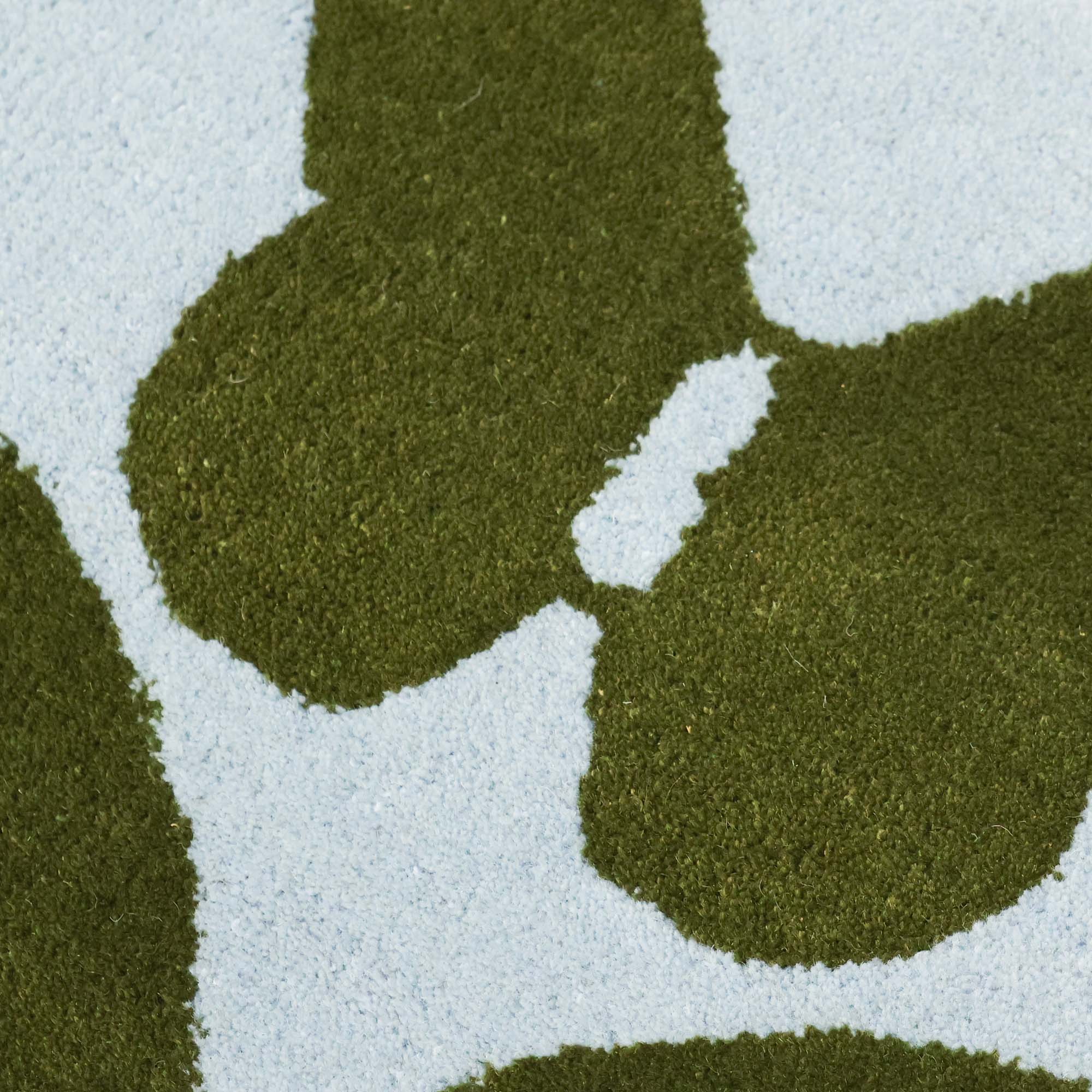 Meet Bessie: the butterfly-kissed rug that instantly lifts a room’s mood. This tufted beauty layers a soft sky-blue backdrop with a rhythmic parade of deep olive silhouettes, creating a graphic, gently whimsical pattern.