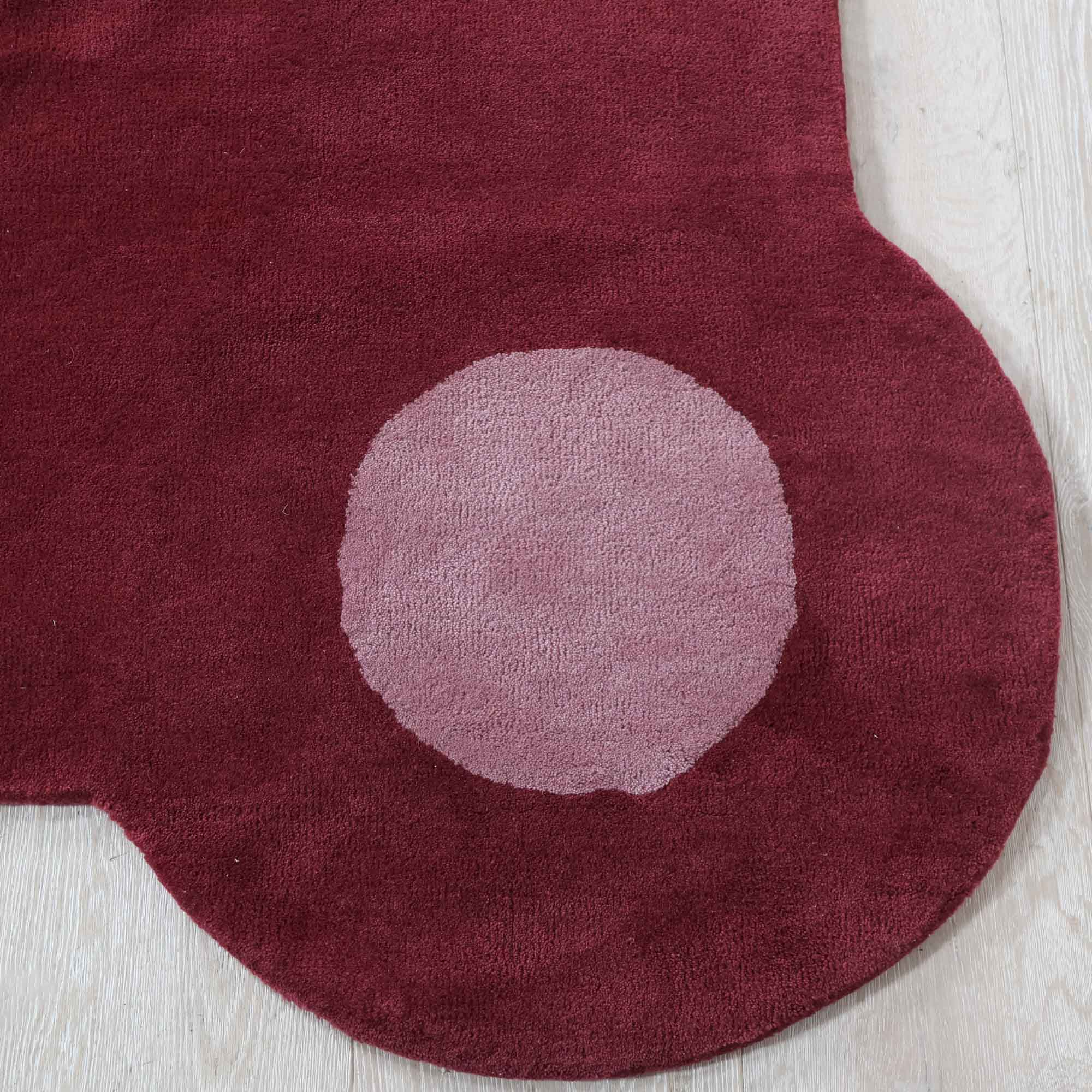 This custom rug was designed by Scout and hand-tufted by artisans in India. It features a durable wool pile that's super soft underfoot and pink hues with a rounded border.