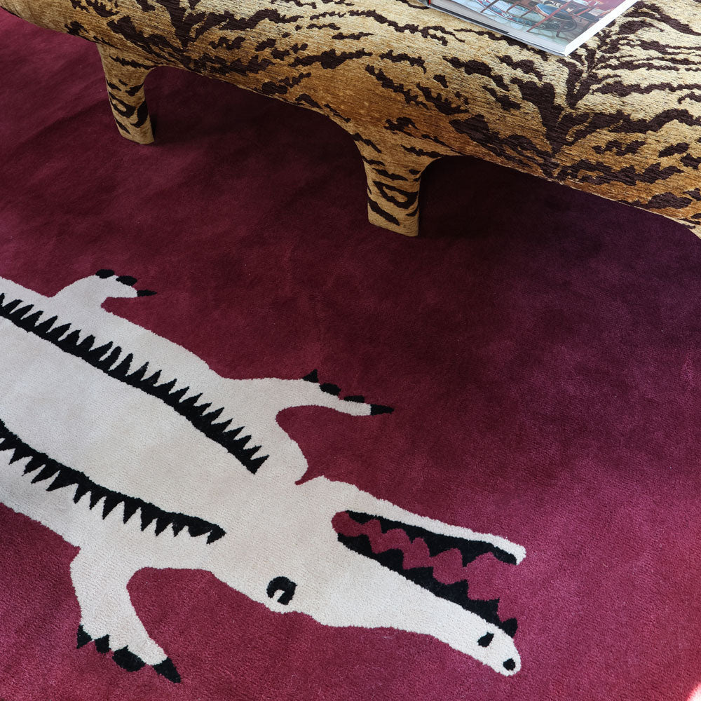 Our El Royale Tufted Rug brings a wink of wild to any room. Hand-tufted in wool, it features bold ivory alligators stretched across a deep berry ground, with oversized rose pink circles anchoring each corner. Cheeky and chic, this rug is built to last and impossible to ignore — a true conversation starter for your space.