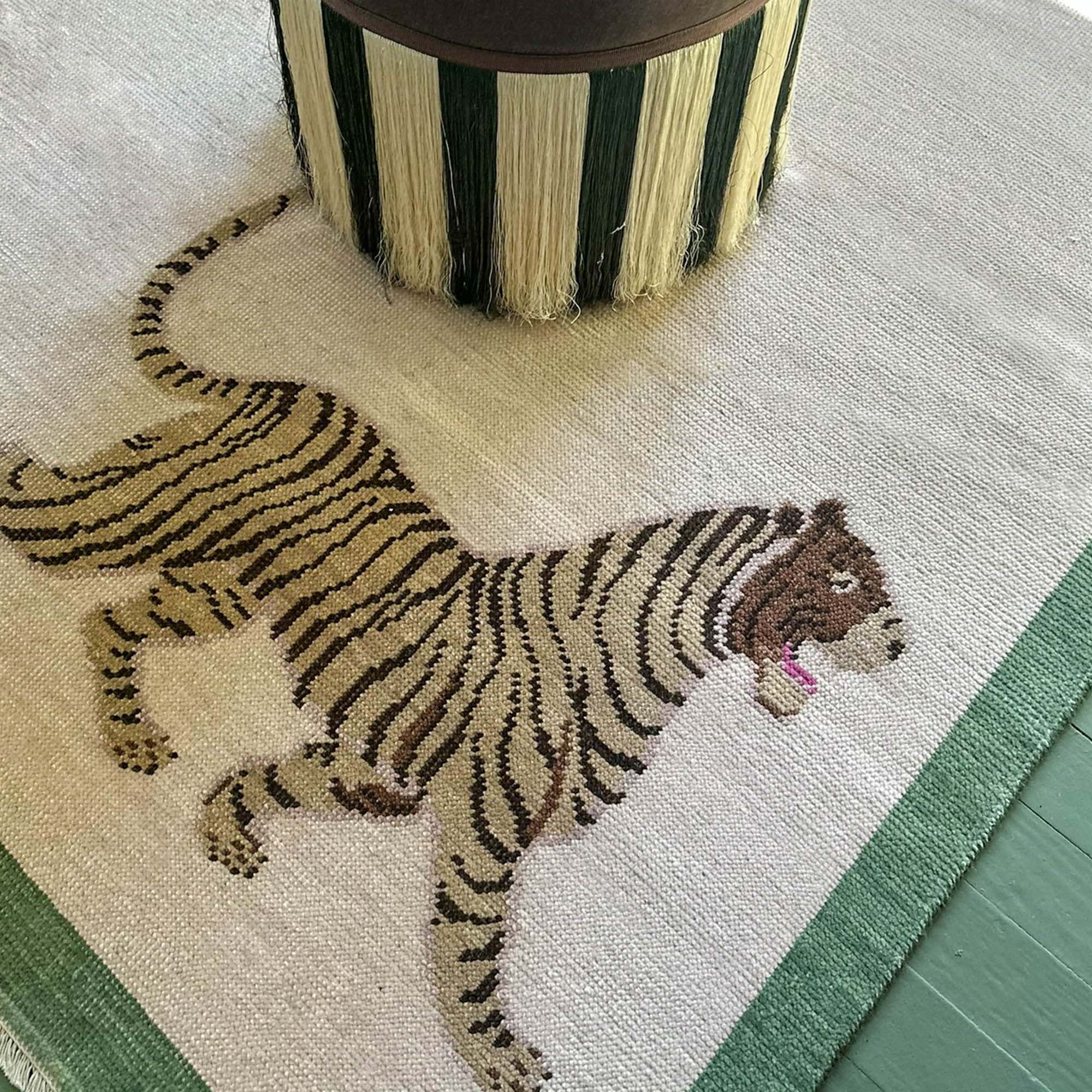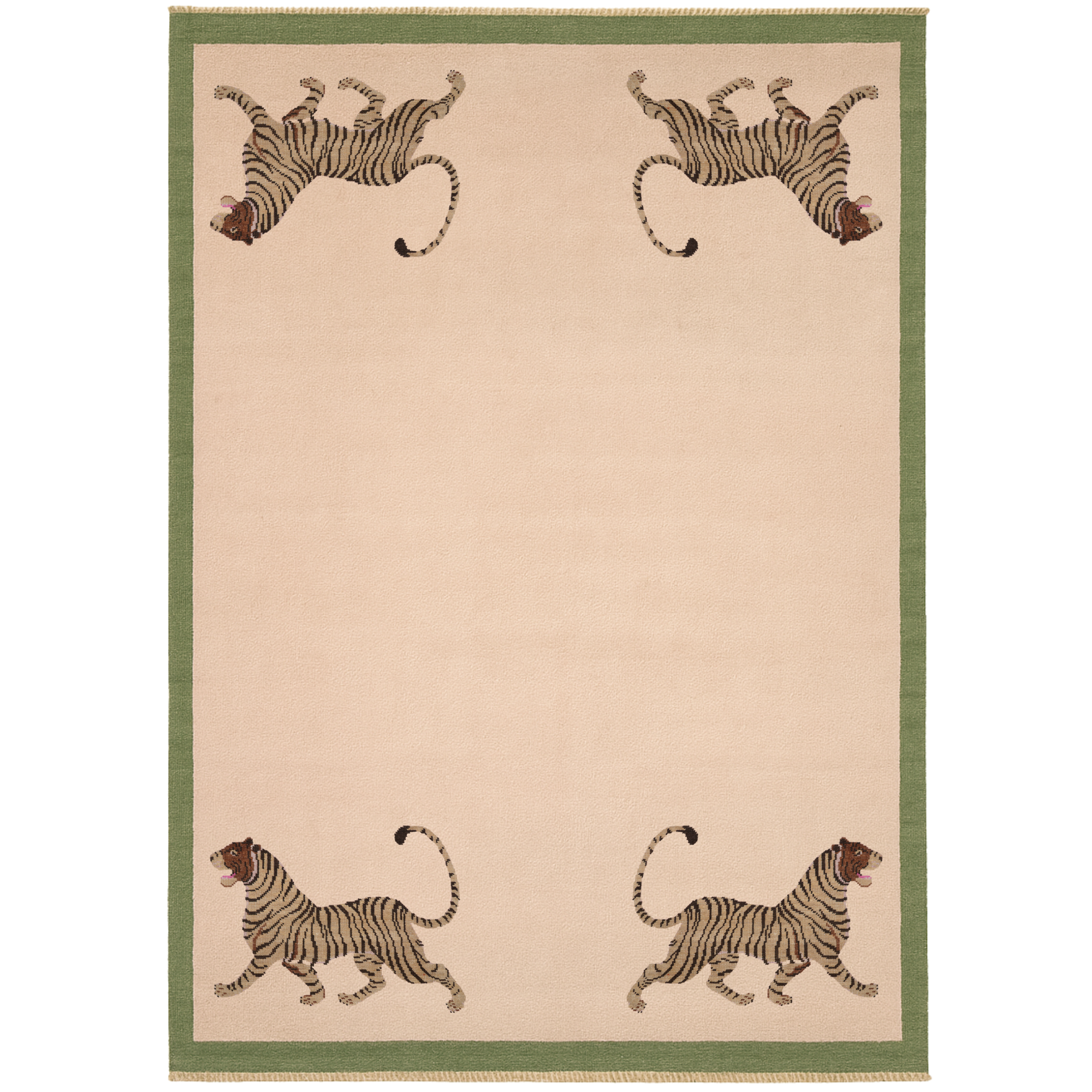 This custom oushak-inspired wool rug was designed by Scout and hand woven with a Turkish-style knot by artisans in India. It features a tan background with brown tigers and a green border with fringe.