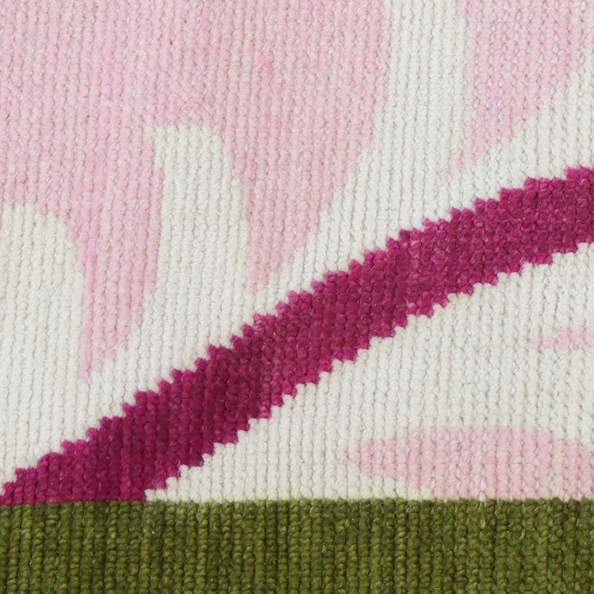 Soft blush meets sculptural geometry. Undulating waves in pink, ivory, and berry create a striking yet soft geometry, framed in olive green.