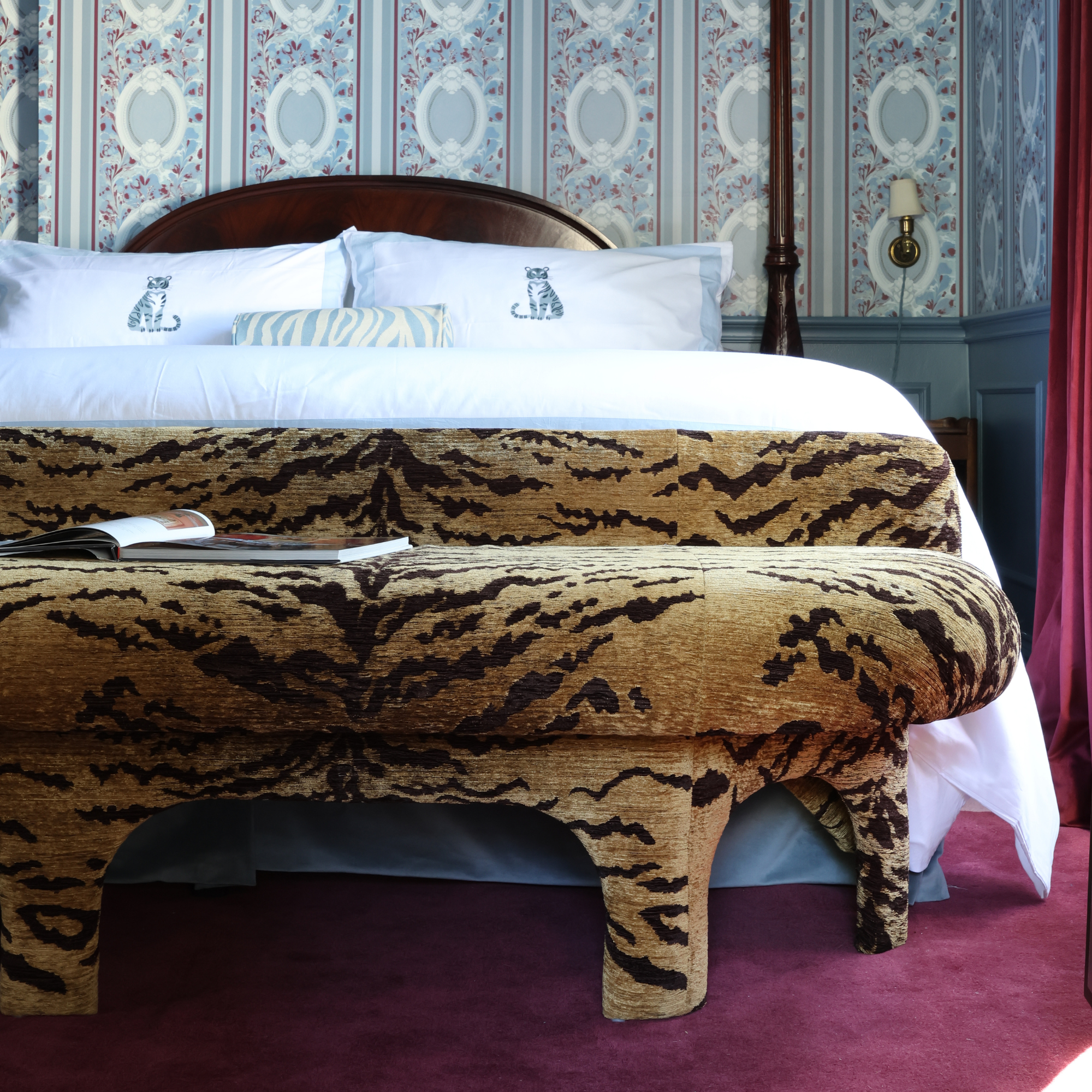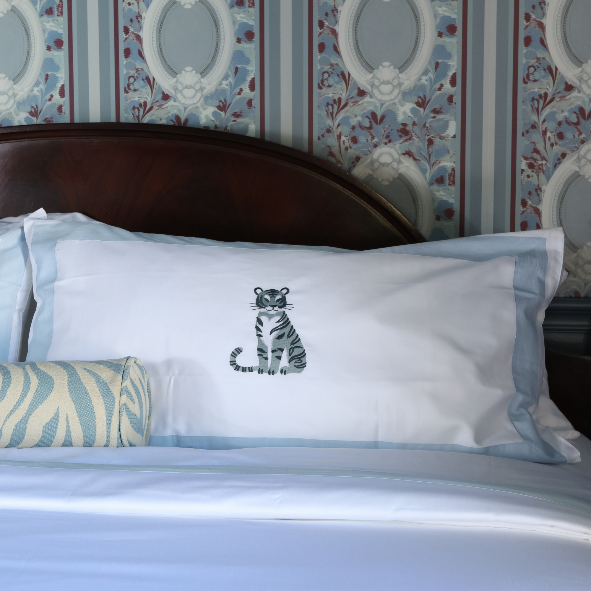 These duvet sets bring out your wild side. Featuring a custom embroidered blue tiger on crisp white cotton, this bedding adds a playful bite to classic design.