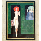 Step into a world of evocative allure with this captivating original figurative oil painting on canvas. This truly distinctive artwork features a striking composition, depicting a graceful nude figure with fiery red hair standing before a deep green doorway, while another enigmatic figure gazes from a window. The rich palette of emerald green, deep black, and vibrant skin tones, accented with subtle gold lines, creates a dramatic and sophisticated visual narrative. Expressive brushstrokes and bold lines highlight the artist's unique vision and mastery of oil on canvas, making this a compelling statement piece that transcends mere decoration. Perfect for a contemporary living room, a minimalist bedroom, or a chic entryway.
