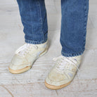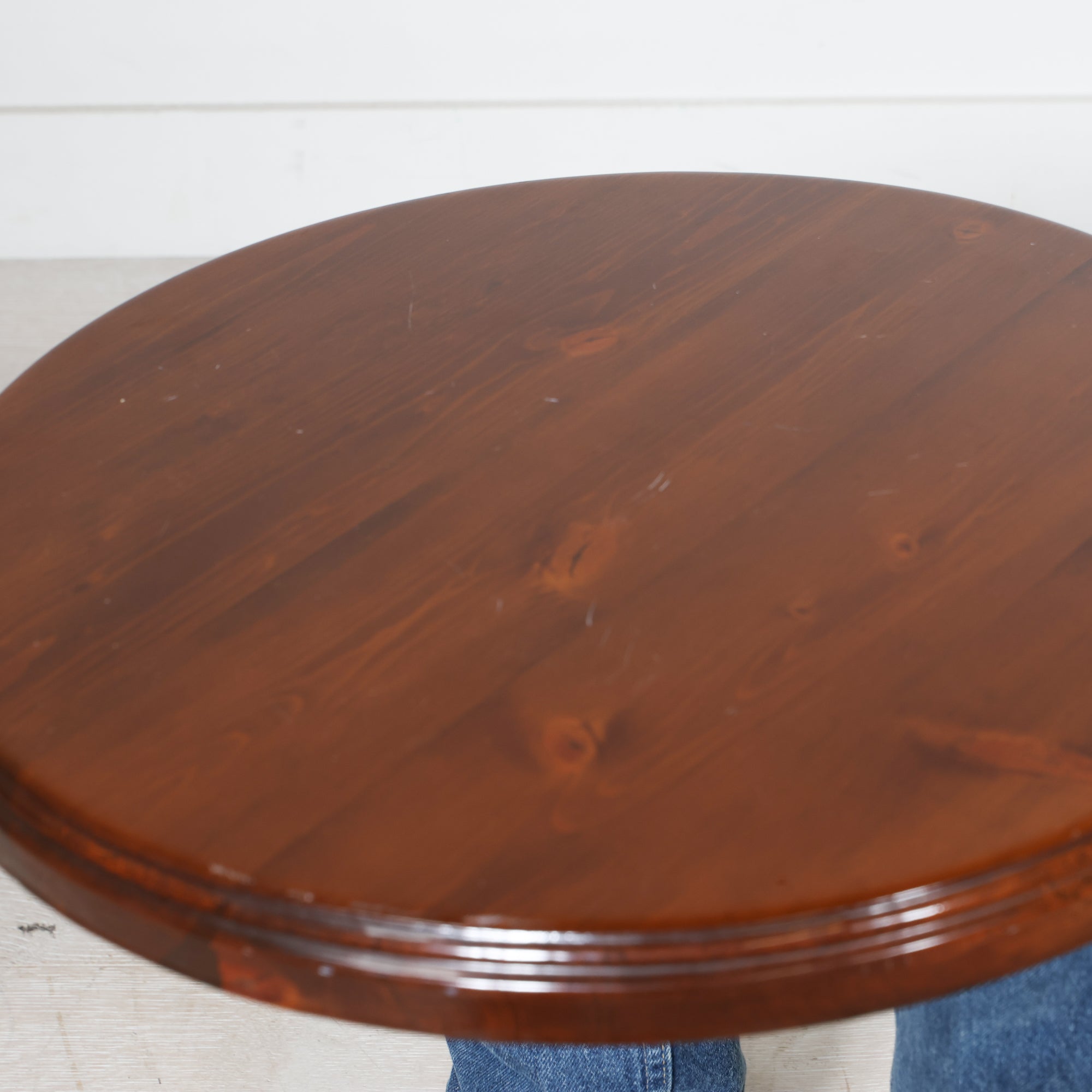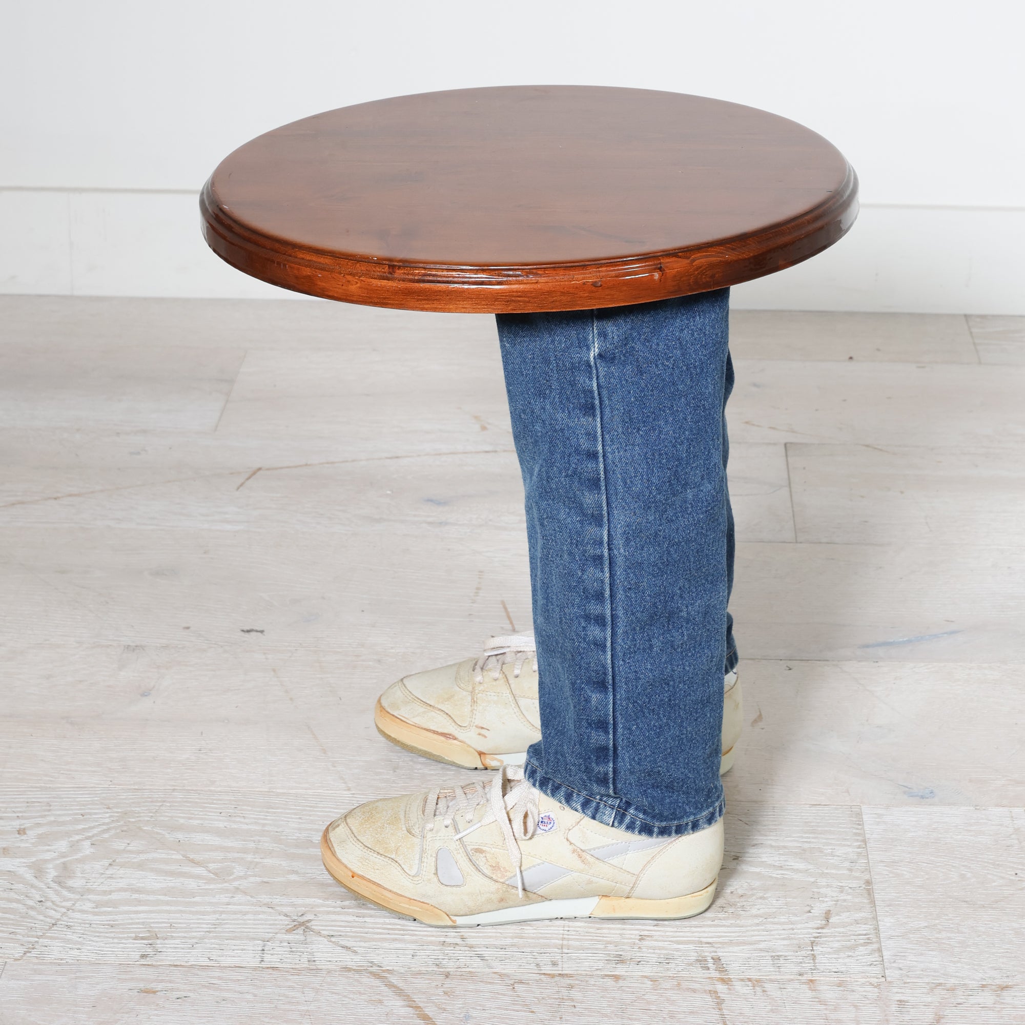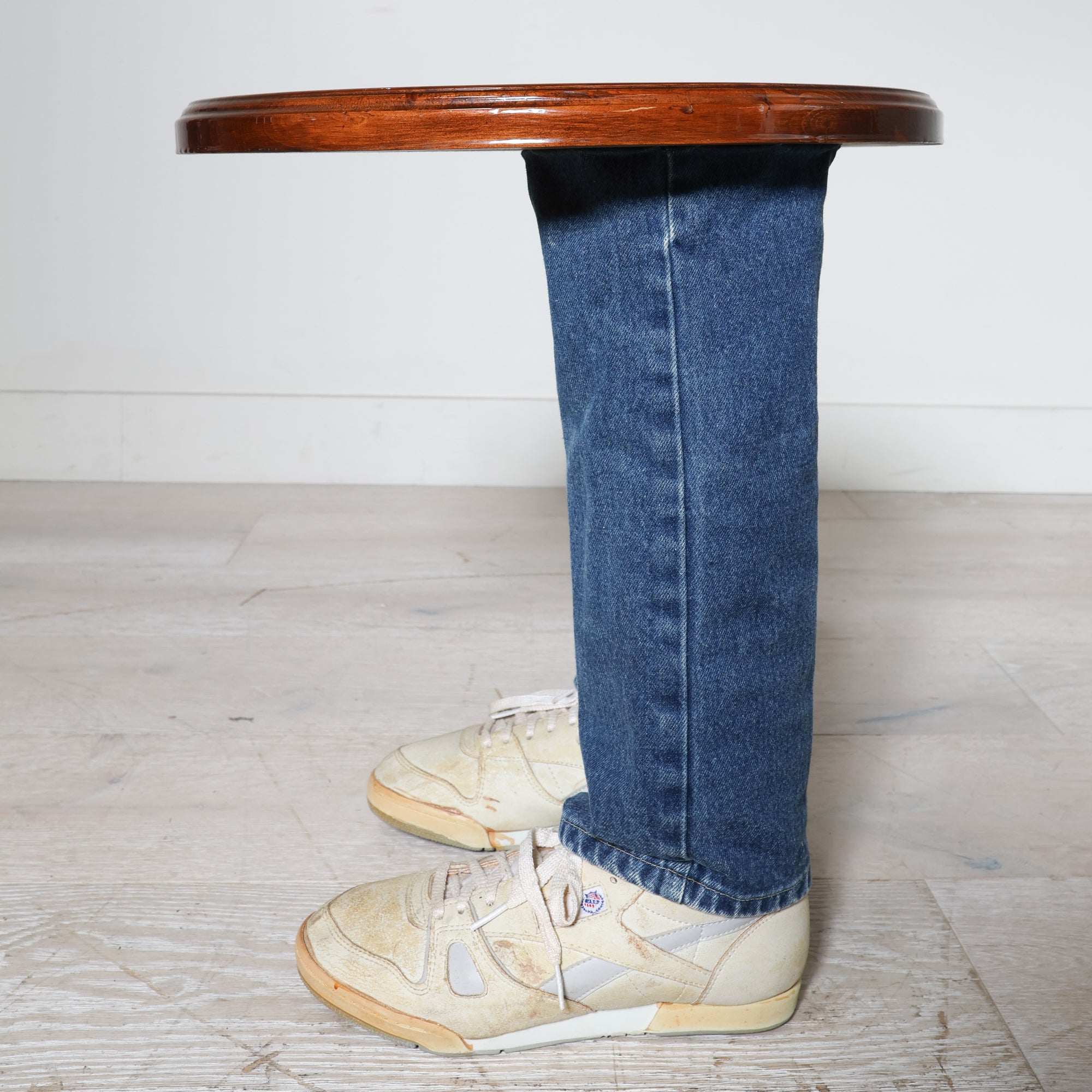This cheeky side table is topped with classic round wood and grounded by a very unexpected base - denim legs in perfectly worn-in sneakers.