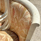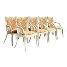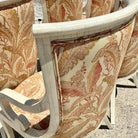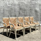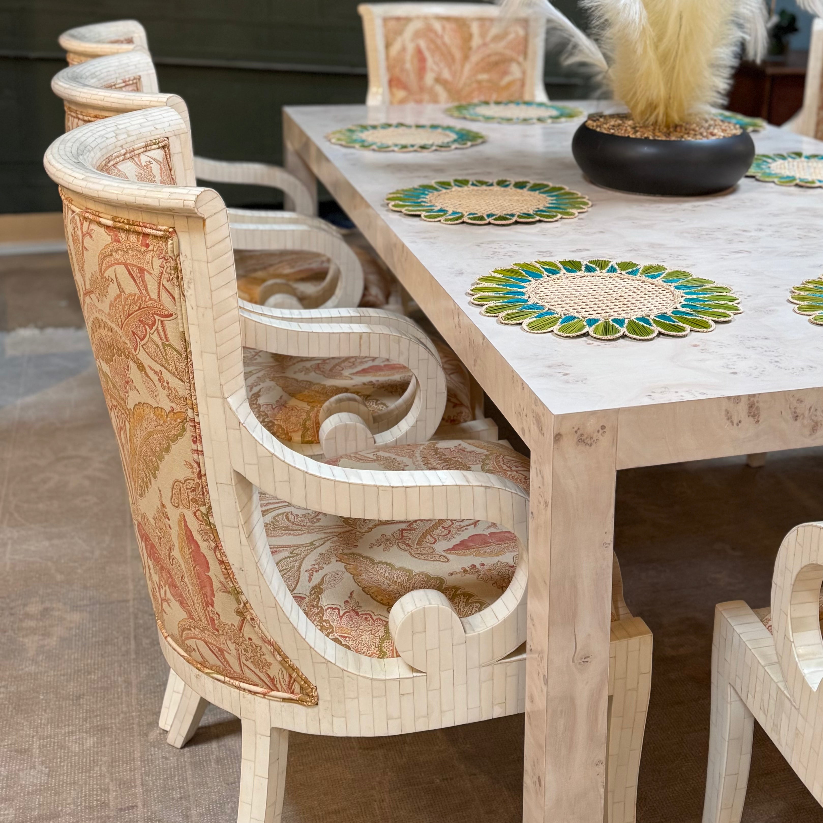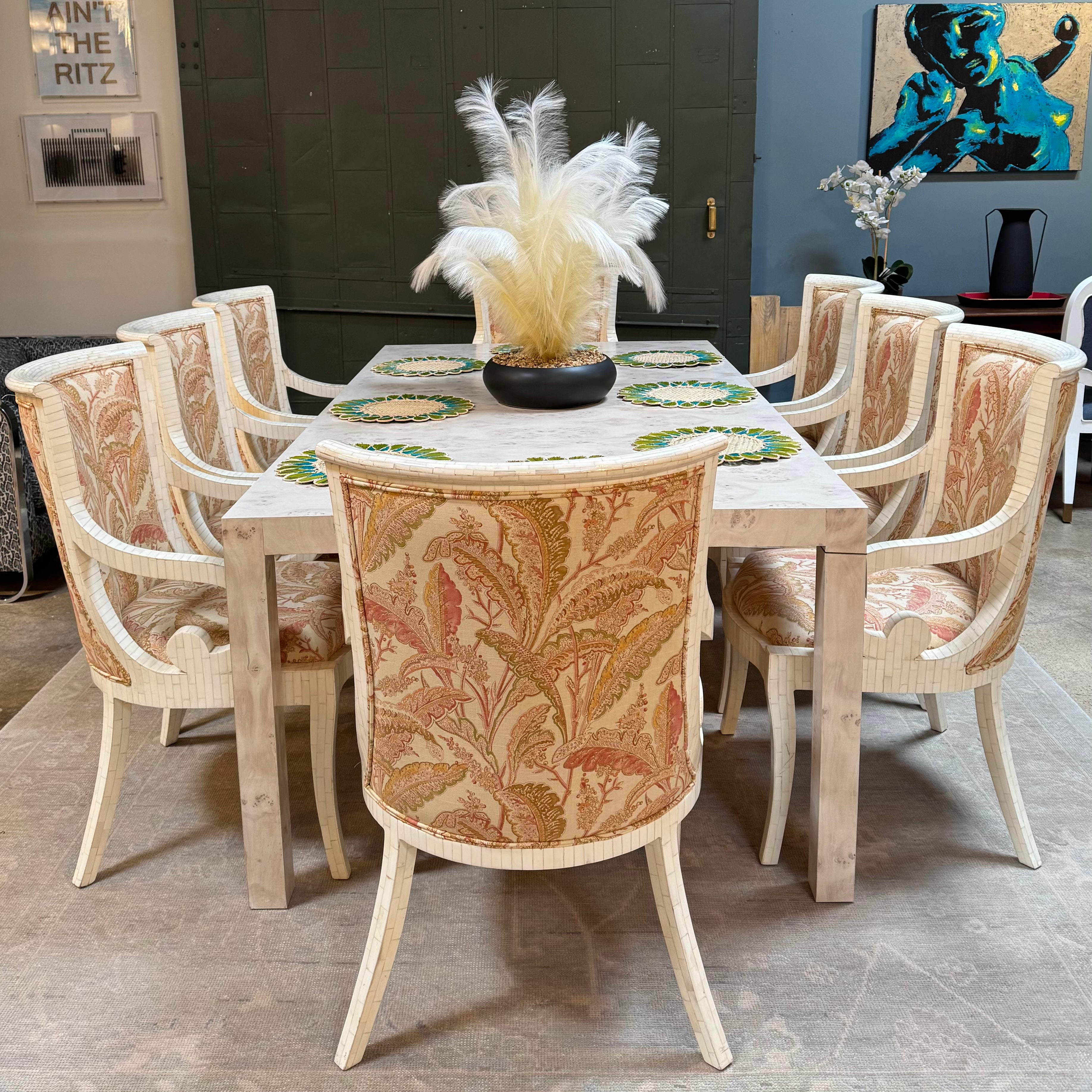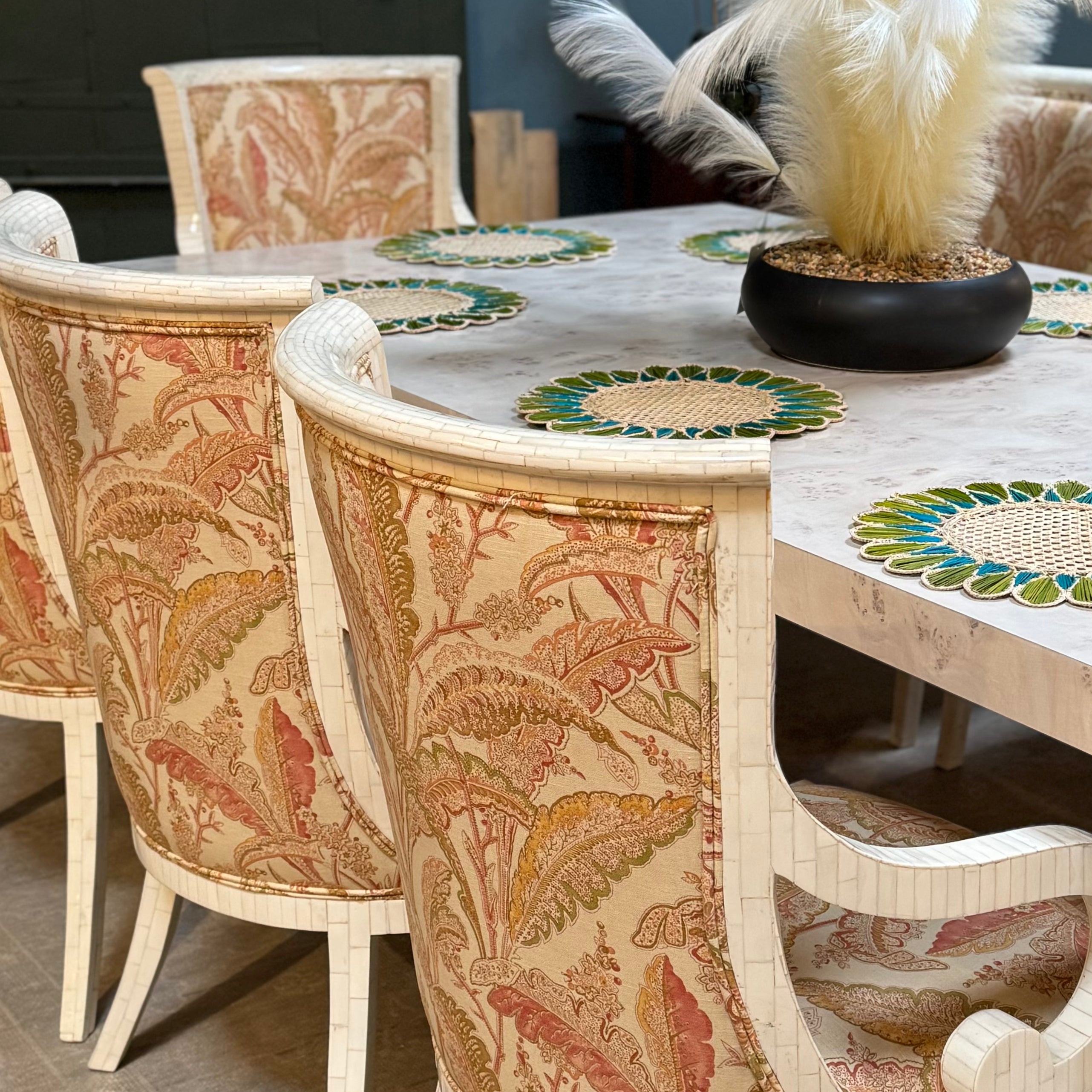 Each chair features a gracefully sculpted silhouette with sweeping scroll arms and elegant saber legs, showcasing the artistry of hand-laid bone veneer in warm ivory tones. The high backs and seats are upholstered in a richly patterned botanical fabric, blending organic texture with timeless sophistication. Perfect for collectors and design-forward interiors alike, this rare set strikes a harmonious balance between craftsmanship and comfort—making every meal feel like an occasion.