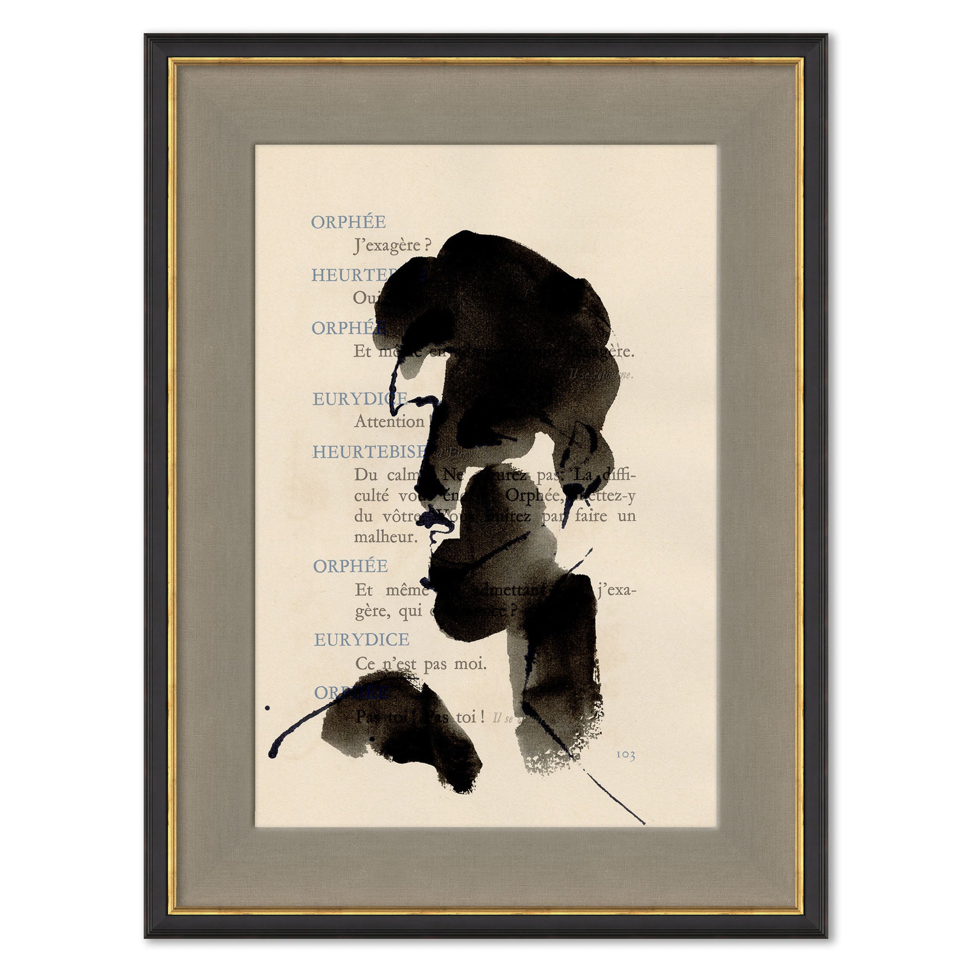 This piece features a portrait by Yuki Osada painted over a page from Jean Cocteau's play Orphée, known in English as Orpheus.