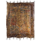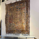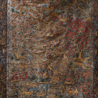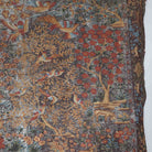 Hand-painted on canvas and edged in a dark leather border, this large tapestry brings an entire enchanted forest to your walls. Birds in flight, rabbits darting through florals, deer tucked between winding branches—it’s a full scene layered in warm ochres, soft blues, deep reds, and muted silvers that give it a beautifully aged patina.