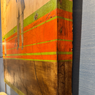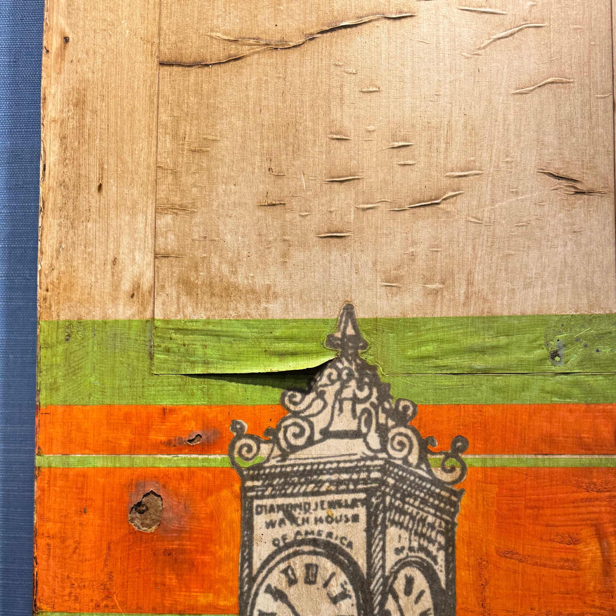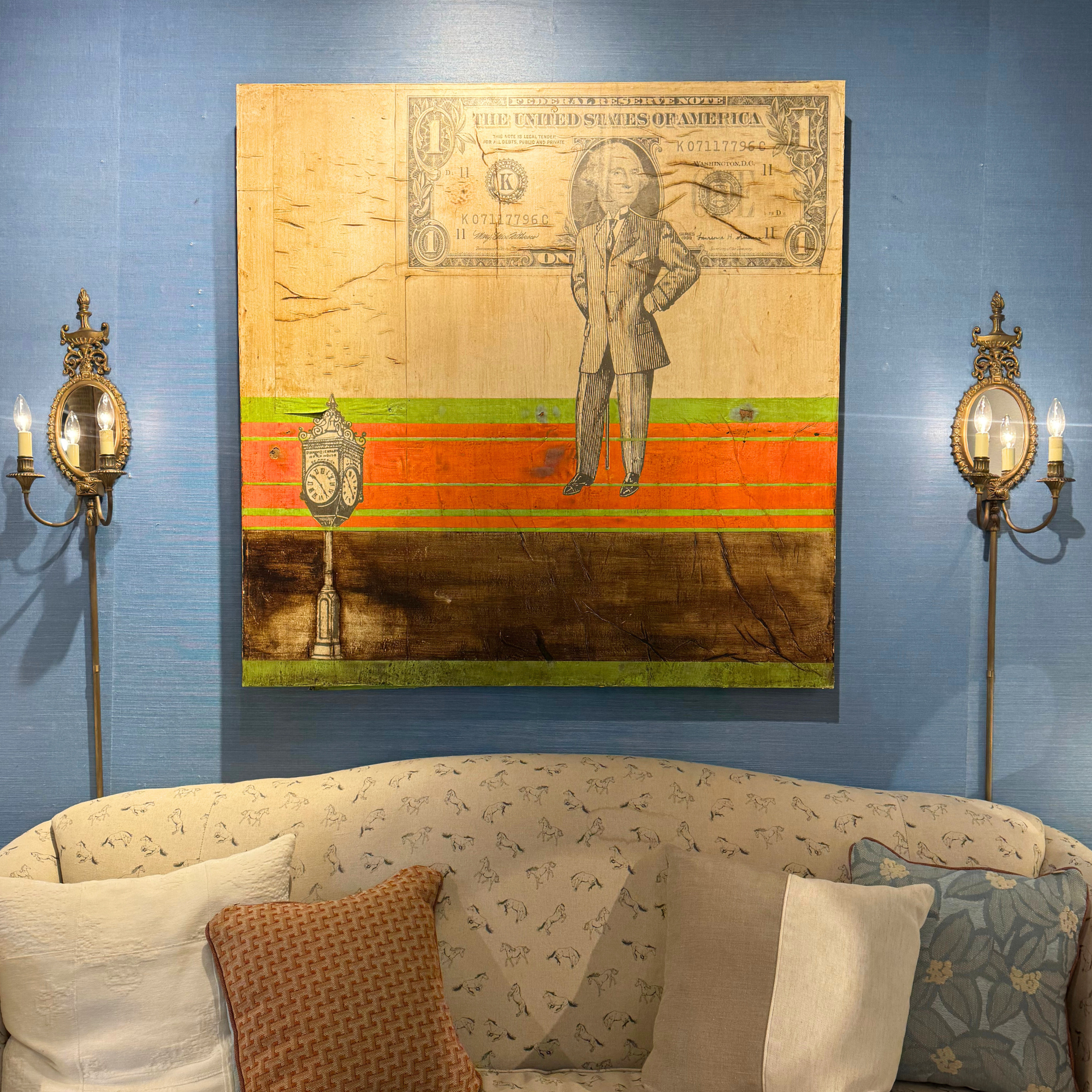 A large scale mixed media on wood, layered with a reimagined dollar bill, a suited figure, and a vintage street clock. Punchy stripes, warm patina, and plenty of character.