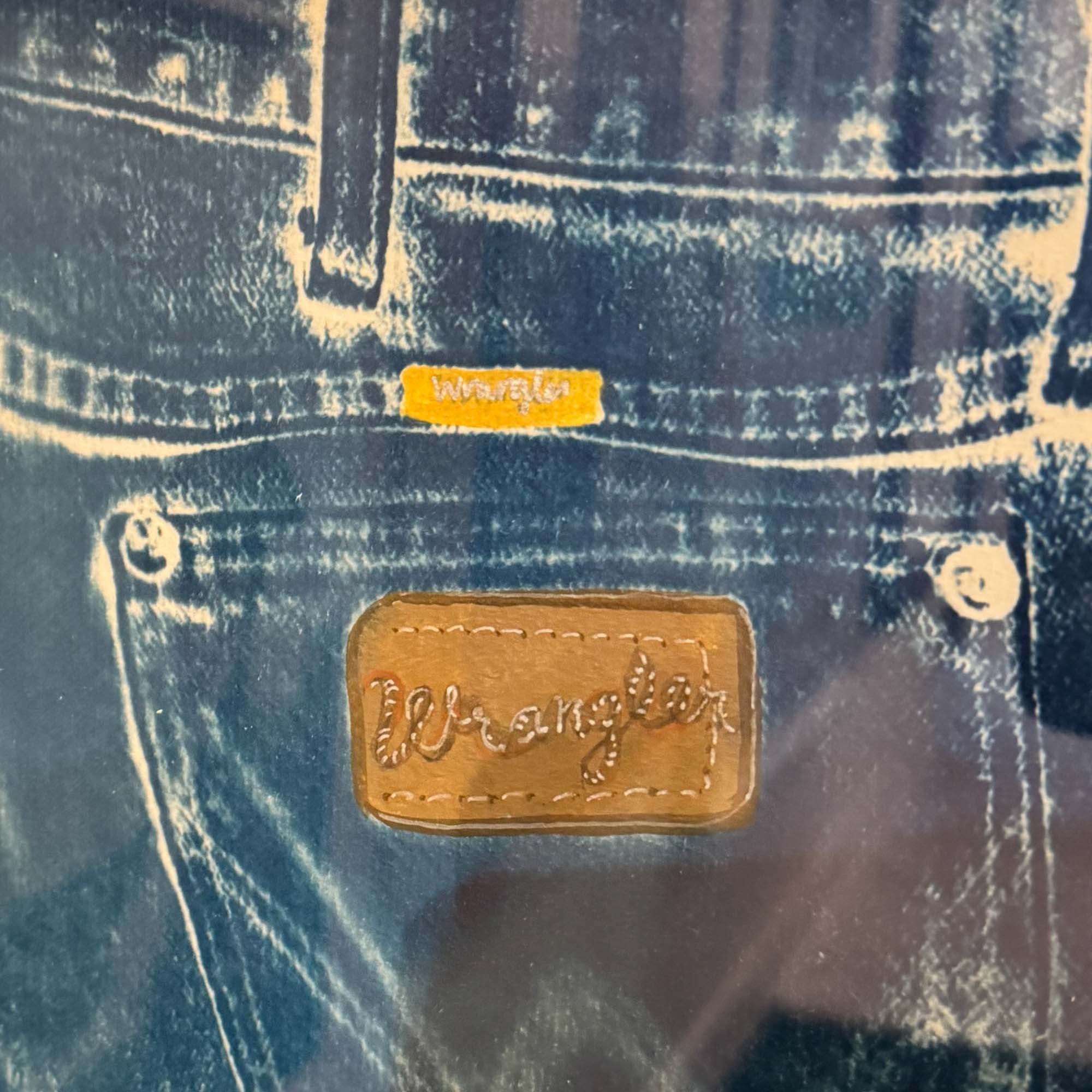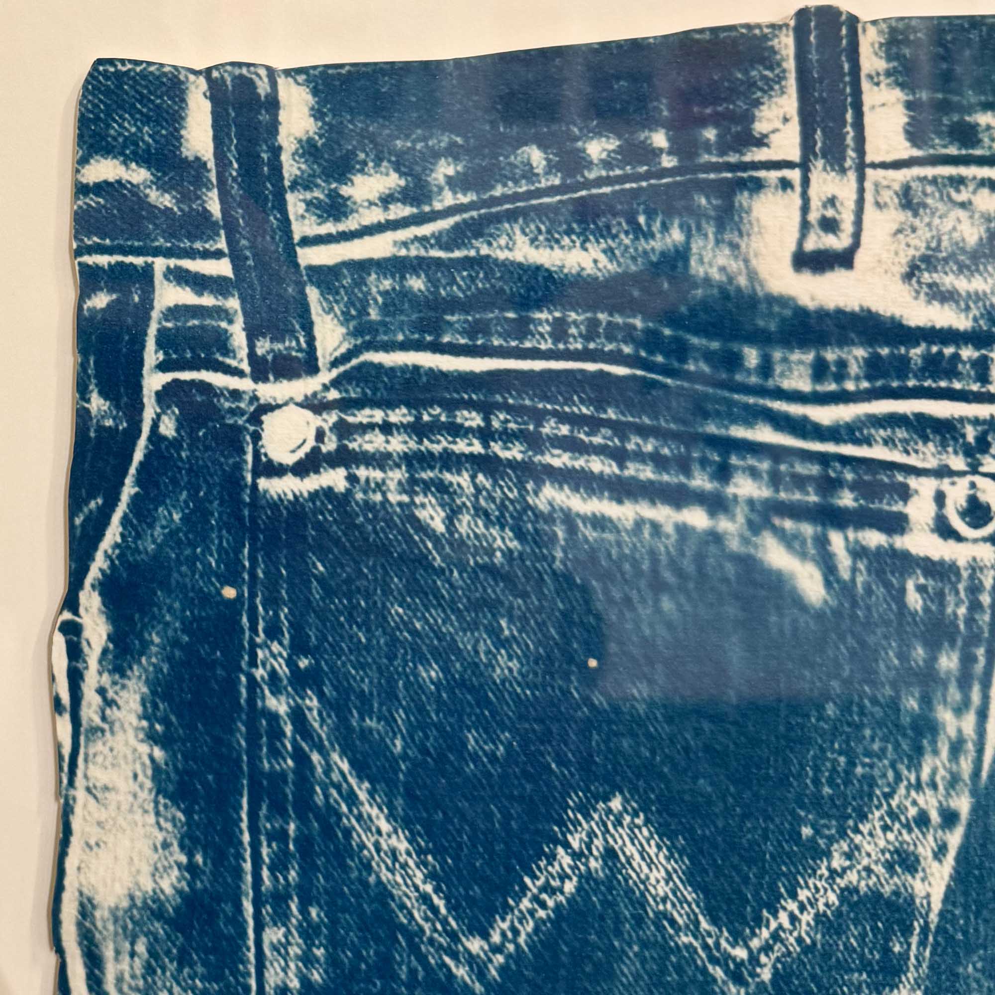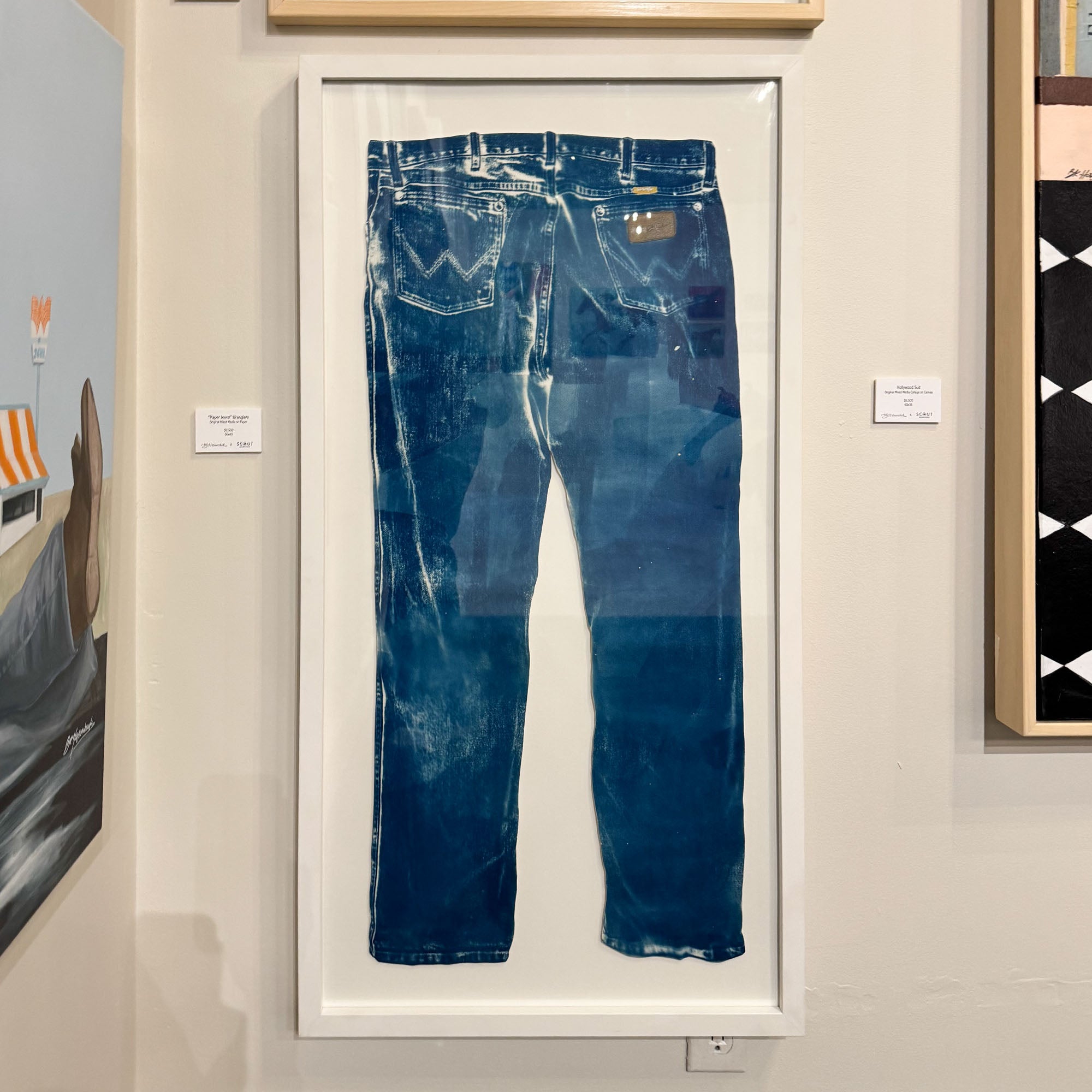 "Paper Jeans Wranglers" by BK Holsomback is an original, framed 50x40 mixed media on paper. Framed in white glossy frame.