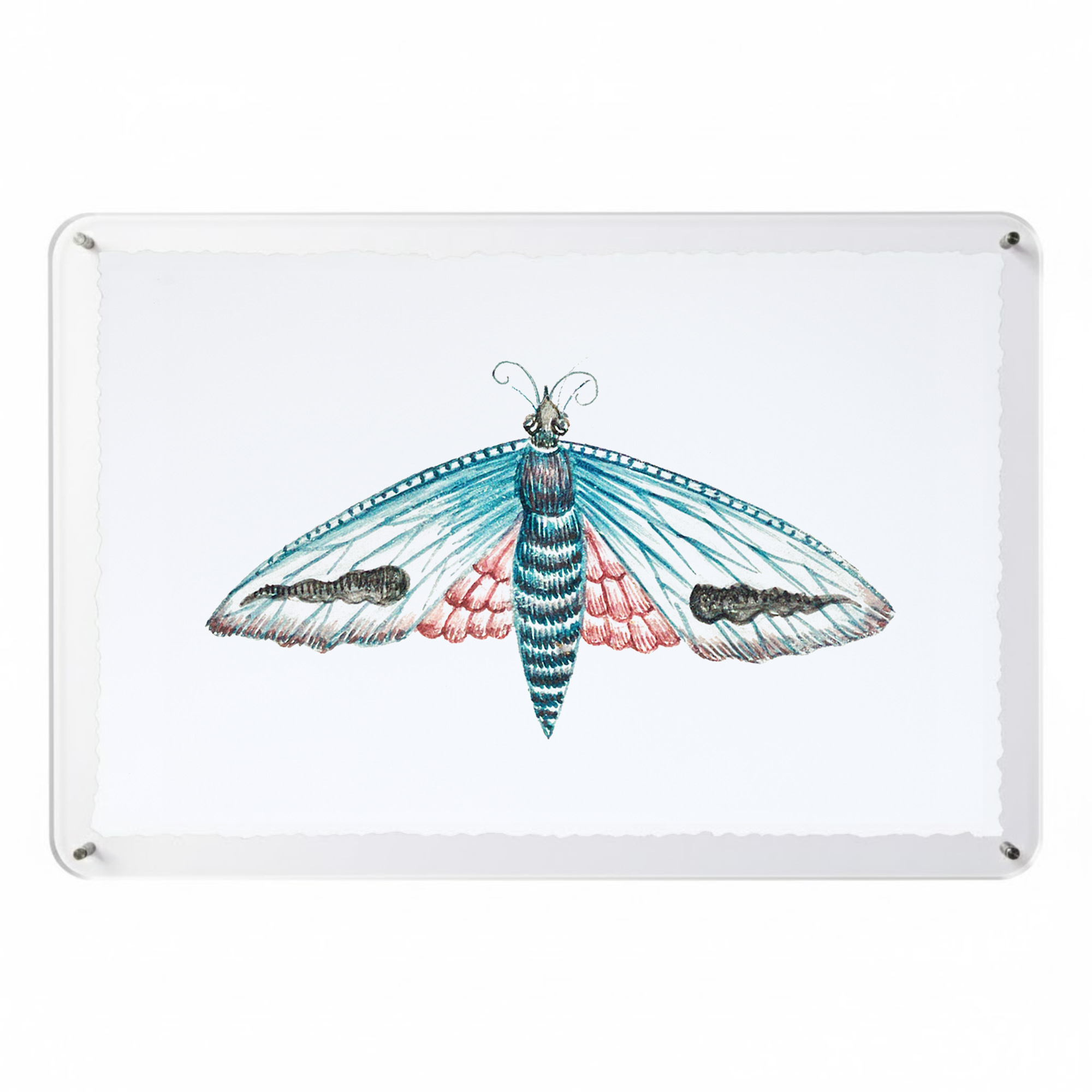 From the Tat Frederick studio, our Titali Series features watercolor moths printed on archival paper with torn paper edges, framed in an acrylic float frame with rounded edges and silver bolts.