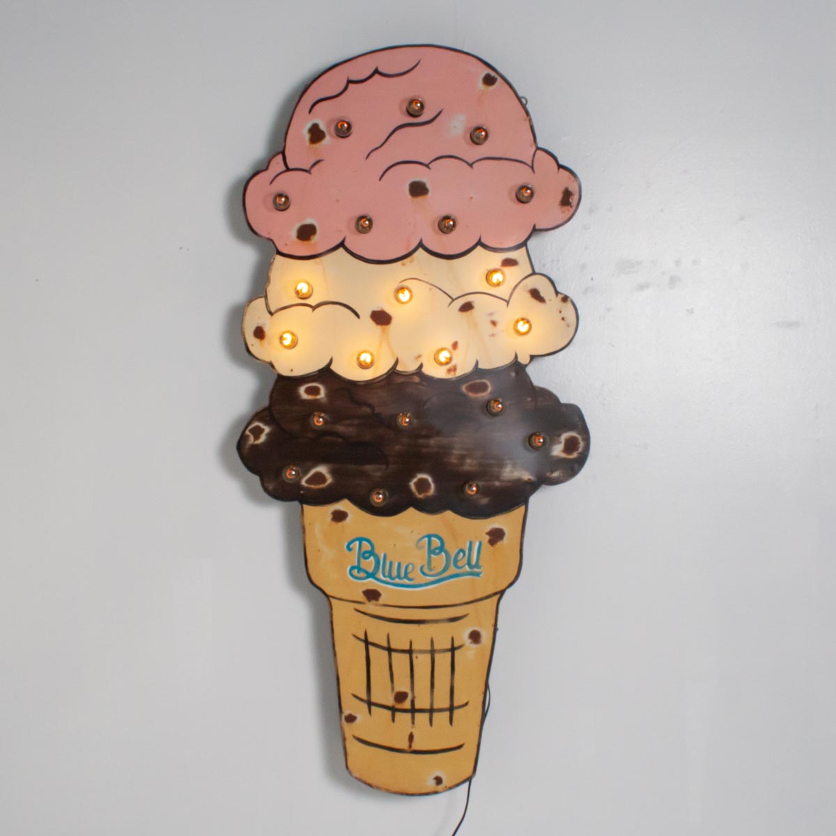 Blue Bell Ice Cream nostalgic light-up sign, made to look vintage by artist Garland Murphree. Two light settings with one flashing.