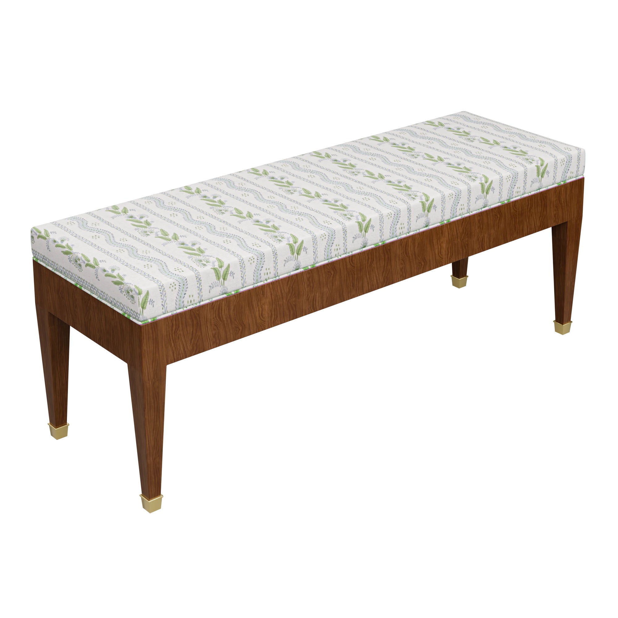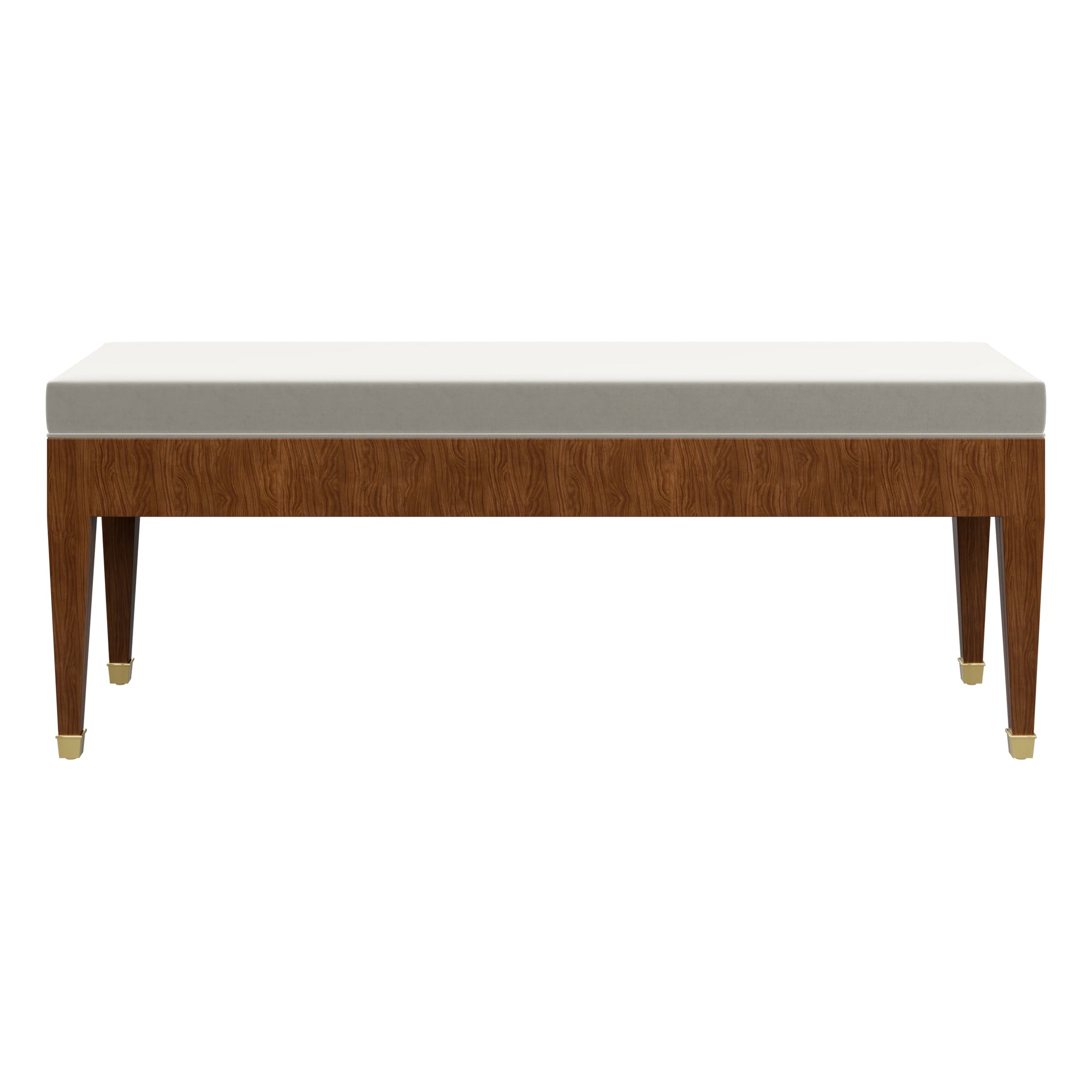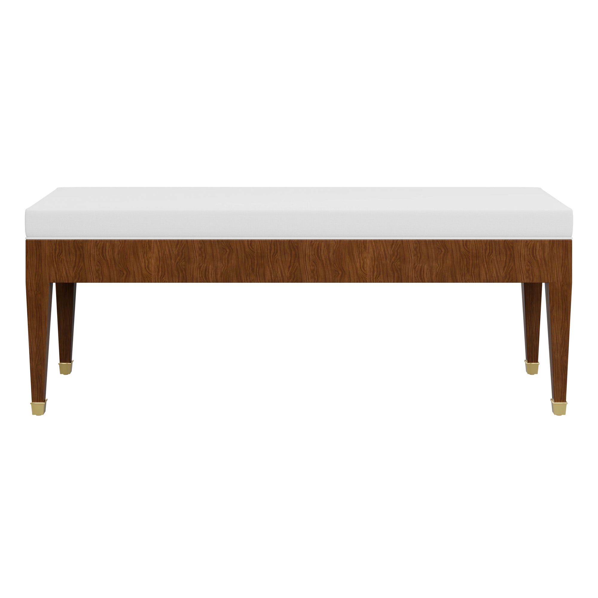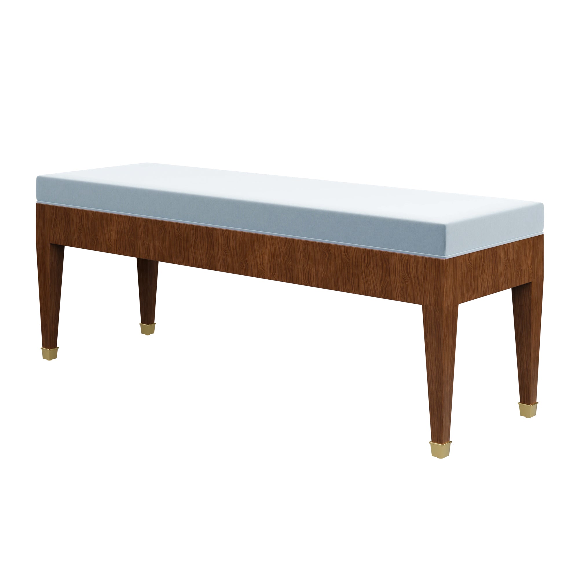 The Custom Alyson Bench features clean and classic tailoring that allows her finish and fabric to steal the show. Alyson's walnut veneer base features a natural stain to effortlessly compliment your fabric-of-choice. Meanwhile, brass sabots punctuate this piece with opulence.