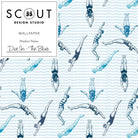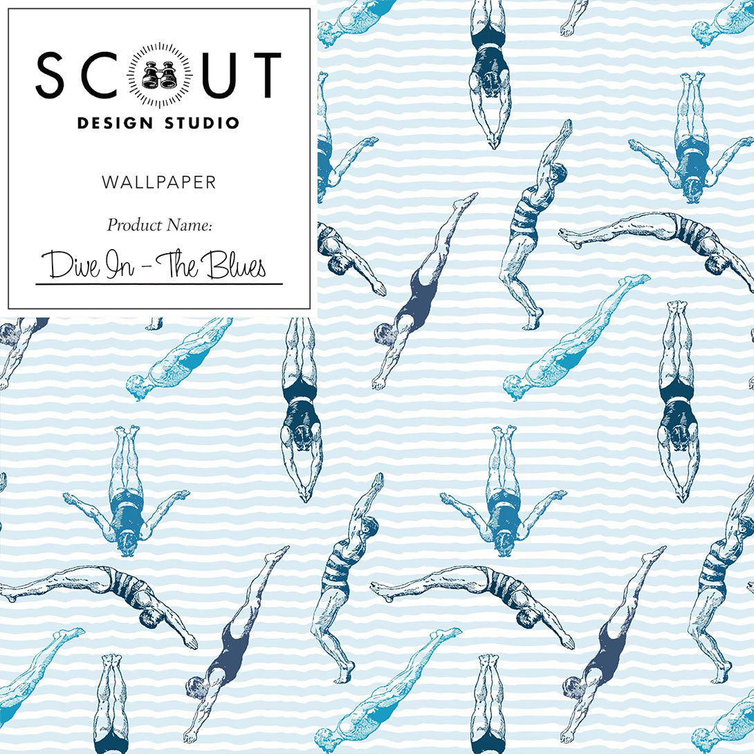 A refreshing twist on the classic striped design, 'Dive In' features original etchings of divers swimming through striped waves. This playful pattern is ideal for bold and fun spaces, such as a pool house, or any area that requires a touch of whimsy.