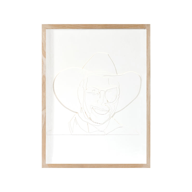 Garth Brooks portrait made of hand cut paper by Tat Frederick. Framed in a blonde wood frame with a plexiglass panel.