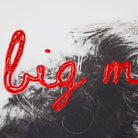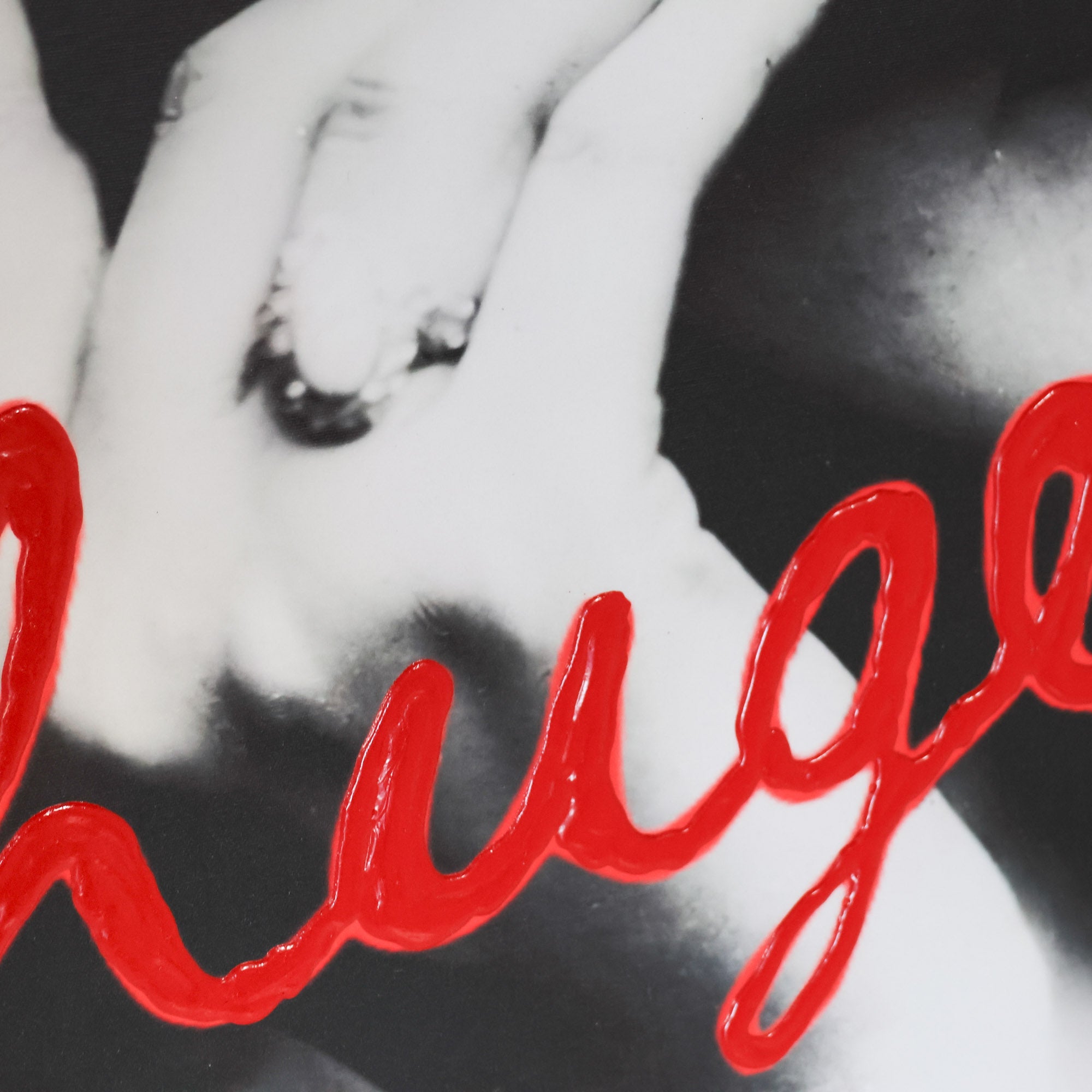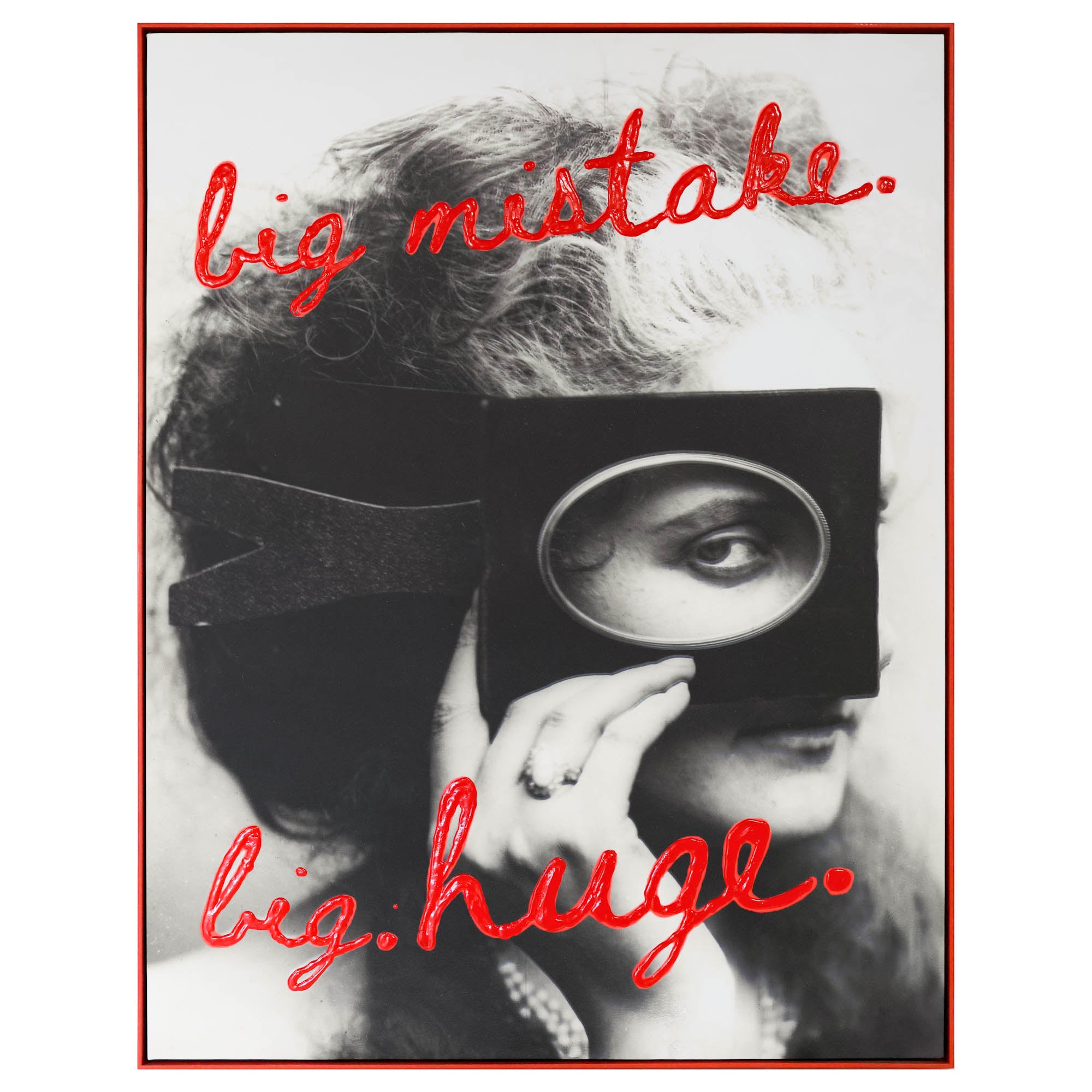 Giclee print and hand-painted letters with texture and high gloss. Framed in red painted wood.