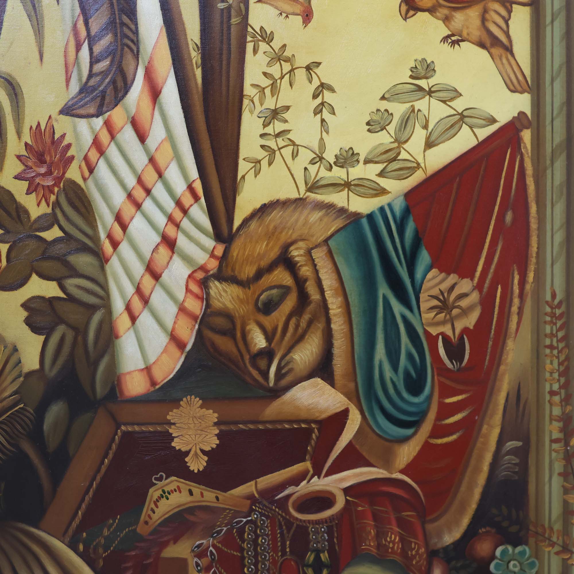 A richly detailed still life framed by classical columns features foliage, birds, and draped textiles in warm, earthy tones with meticulous craftsmanship. Designed as both architectural element and decorative art, it makes a striking focal point in any interior.