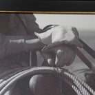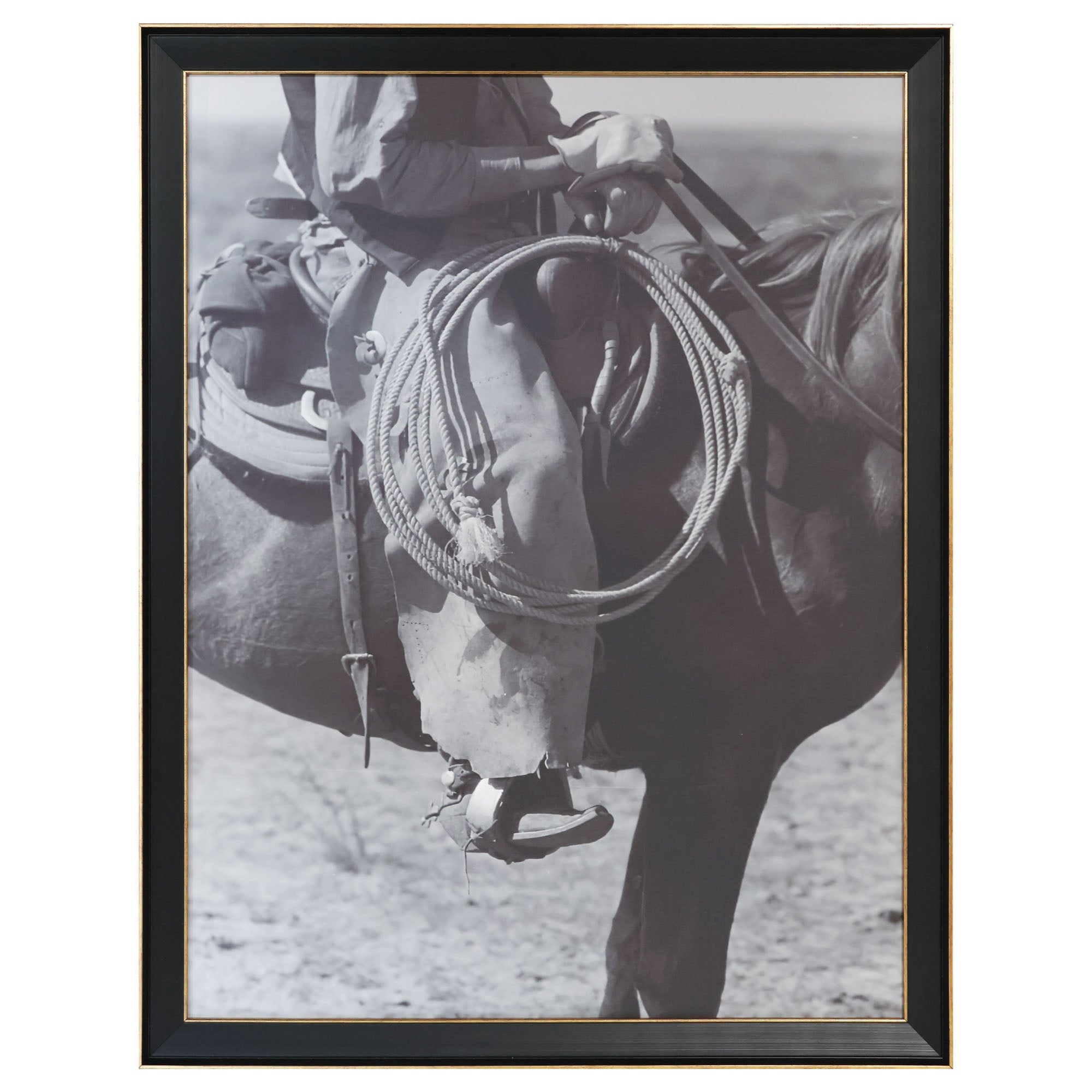 Photography print on canvas framed in black wood with gold trim details.