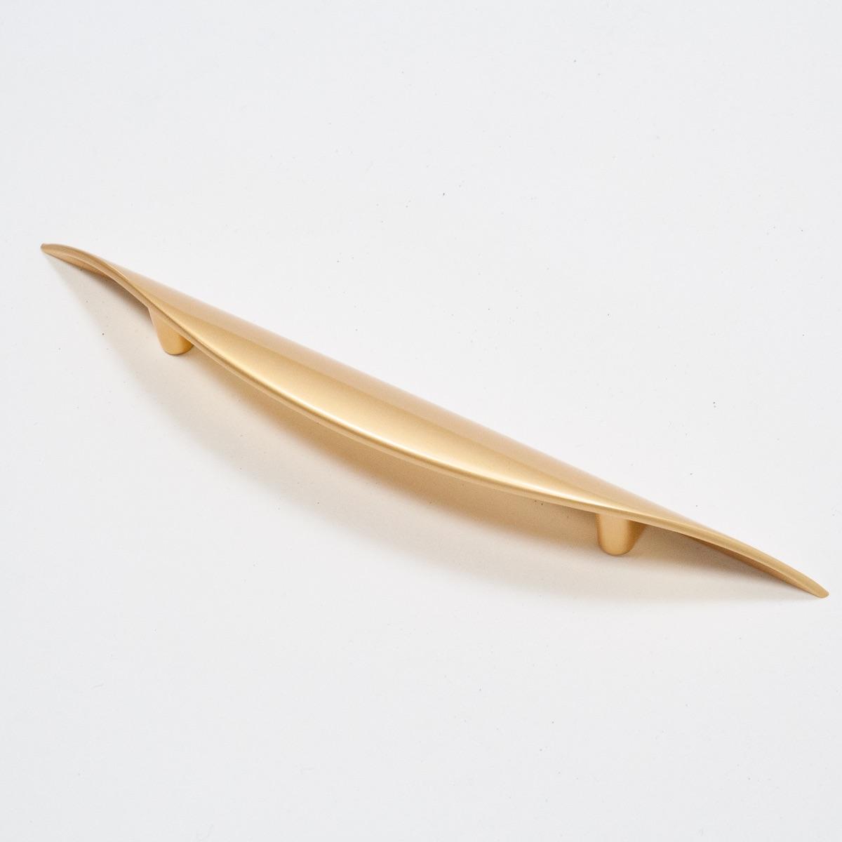 Modern cup handle hardware with a gold finish. Use for dresser drawers or cabinets.