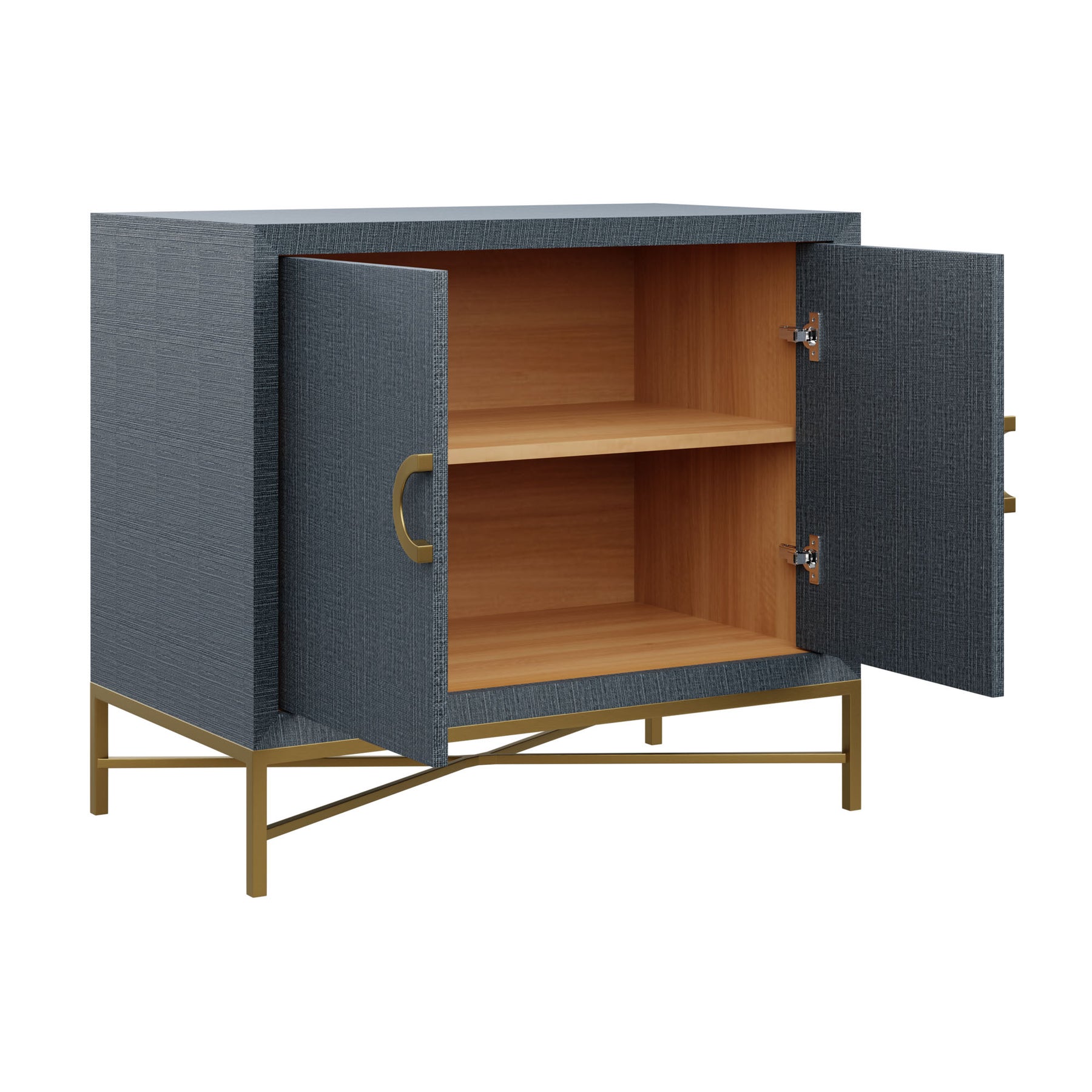 Our Scout Bespoke Monarch Chest features a stylish X base and simple doors that allow the brass half moon hardware to shine. A roomy cabinet with an adjustable shelf is the perfect place to store away your odds and ends.