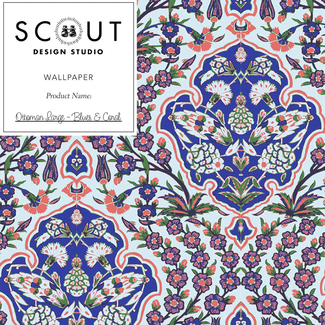Ottoman Large Wallpaper in Blues & Coral Sample