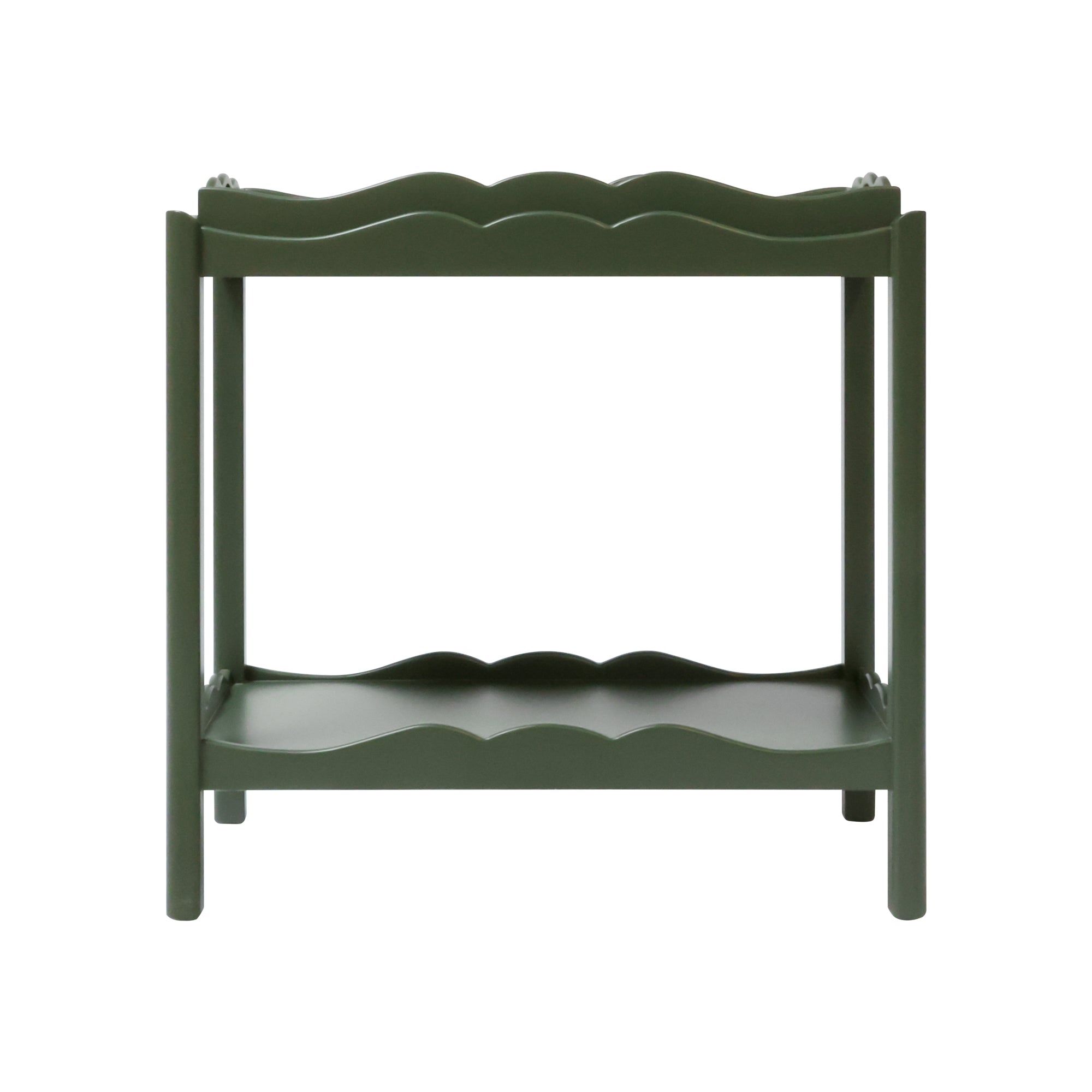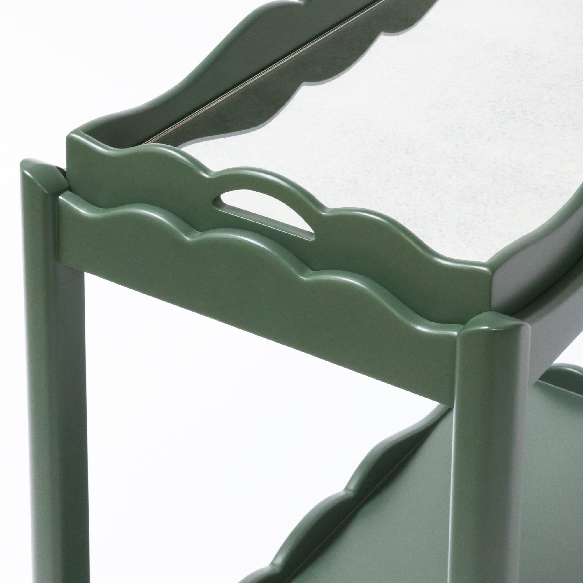 Featuring graceful curves that contrast with four straight legs, Patara's two-tiered design is the perfect perch for your favorite bottles and glasses. A removable tray featuring an antiqued mirror adds a striking flair to this high-society debutante, while matte Deep Sage lacquer keeps things classy.