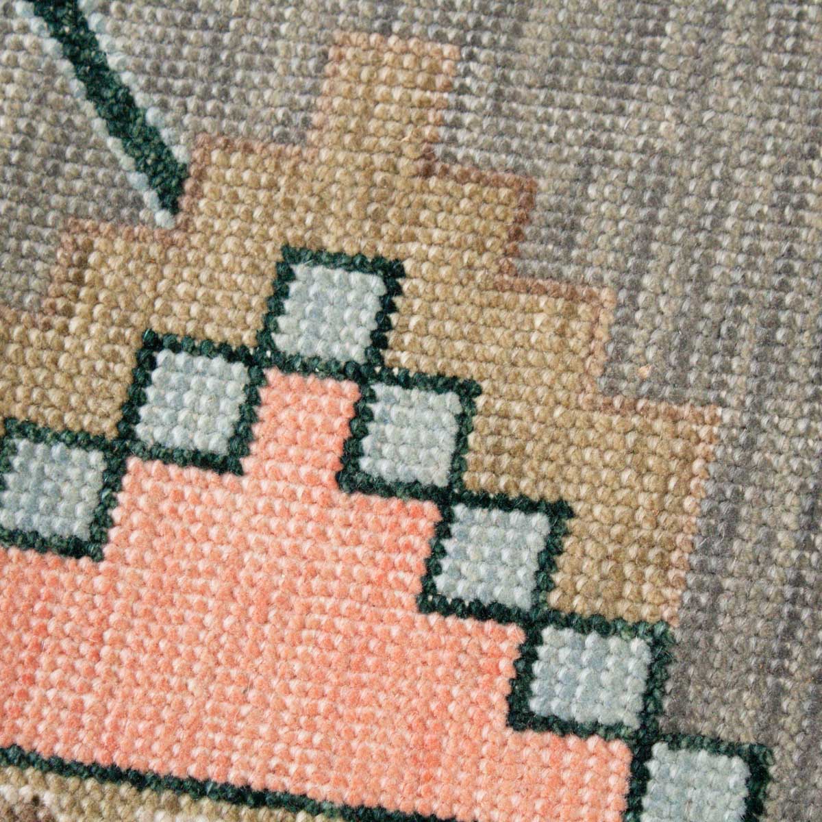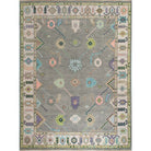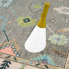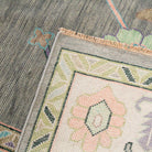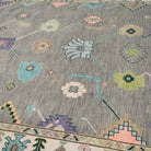 This oushak-inspired rug was designed by Scout and hand woven with a Turkish-style knot by artisans in India. It features a durable wool construction and a neutral grey background with pastel pops of color.