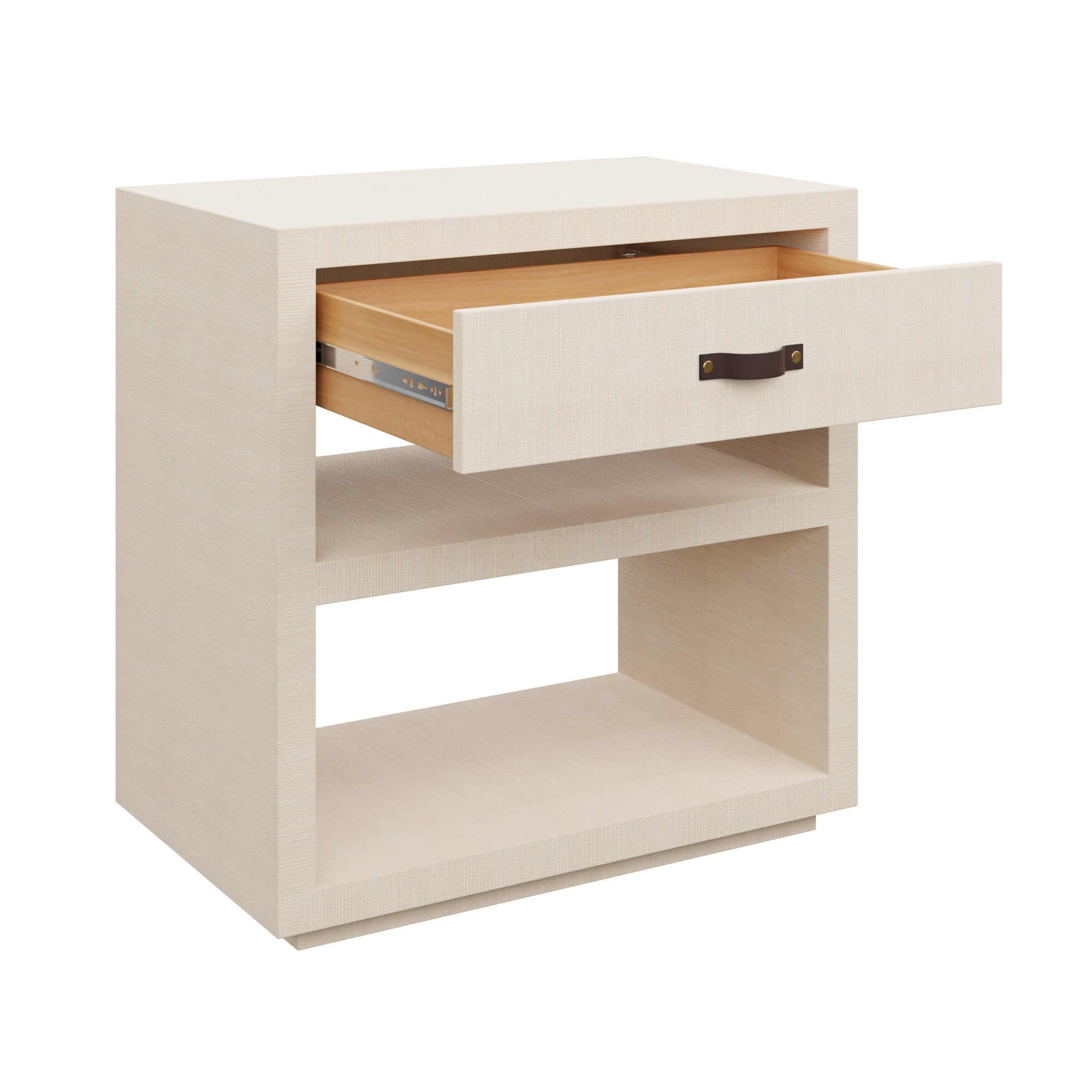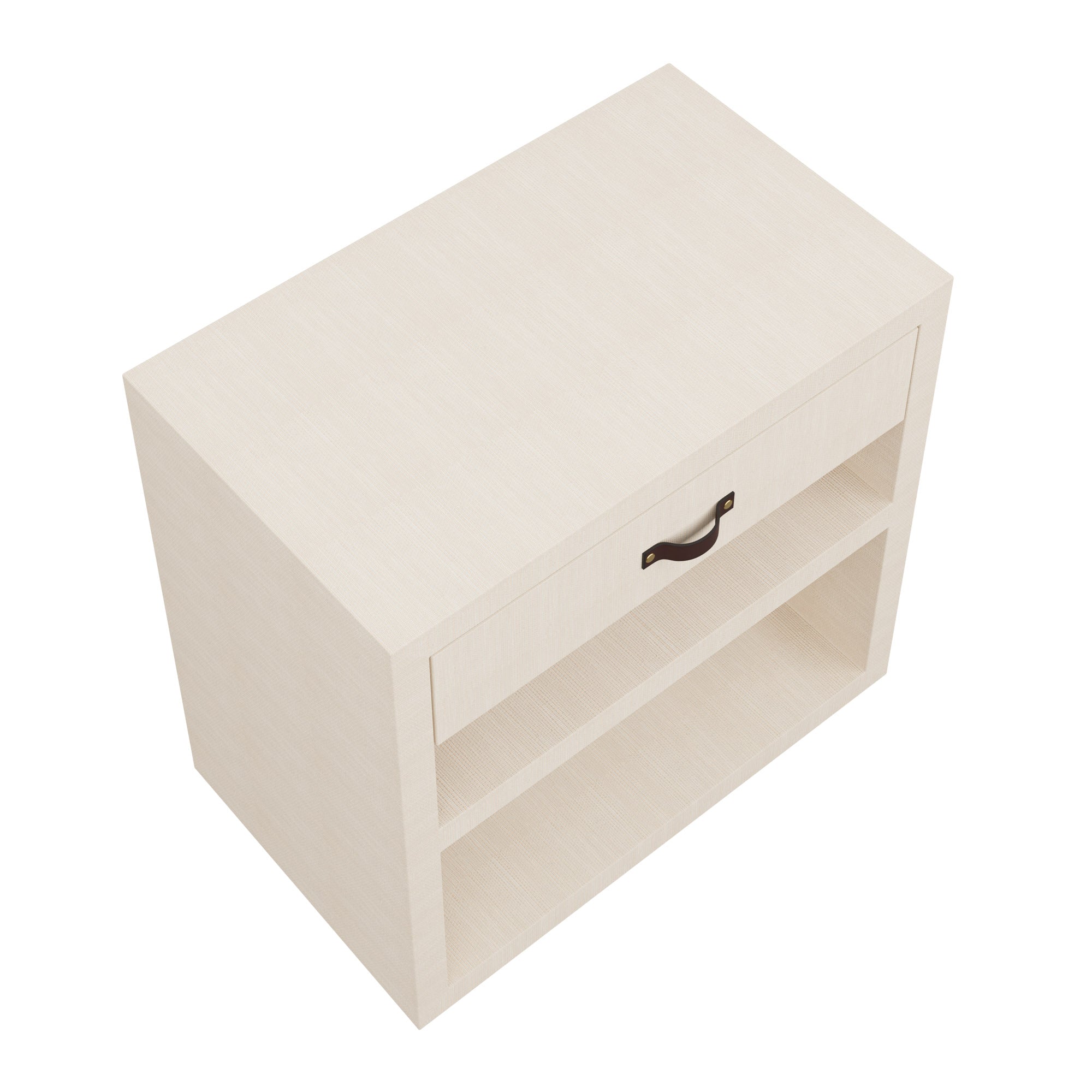 Our Custom Rios Chest features a drawer and shelf for optimal nightstand storage. Sleek, straight lines allow our brown leather handle to stand out against your grasscloth of choice on this classic chest.